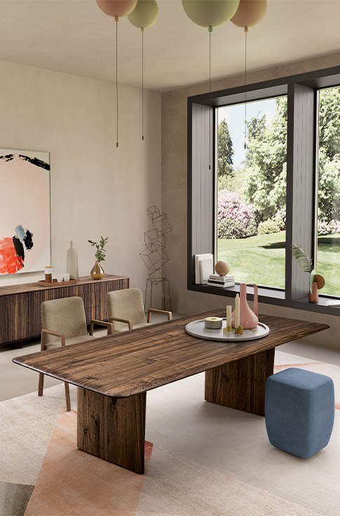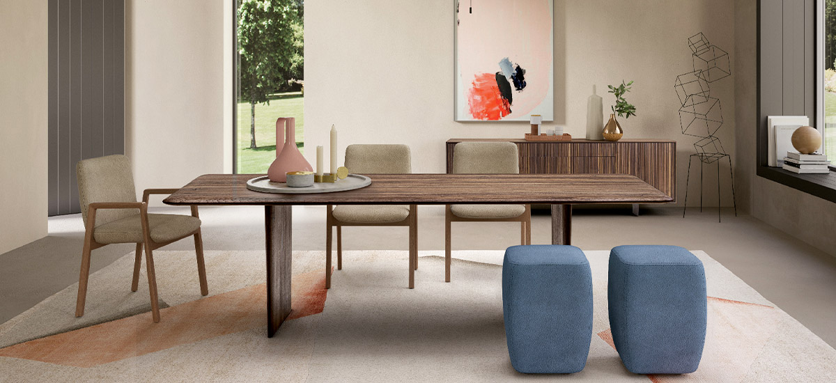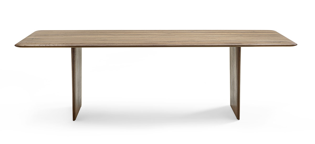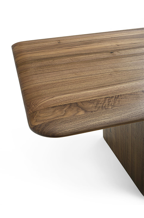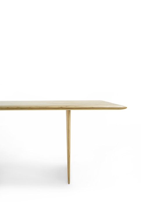 - Vela Table: Tavolo interamente realizzato in legno massello a liste incollate, caratterizzato da un top e da gambe con lati stondati alleggeriti tramite una sofisticata lavorazione a saponetta, che ne enfatizza la leggerezza e la sinuosità.
