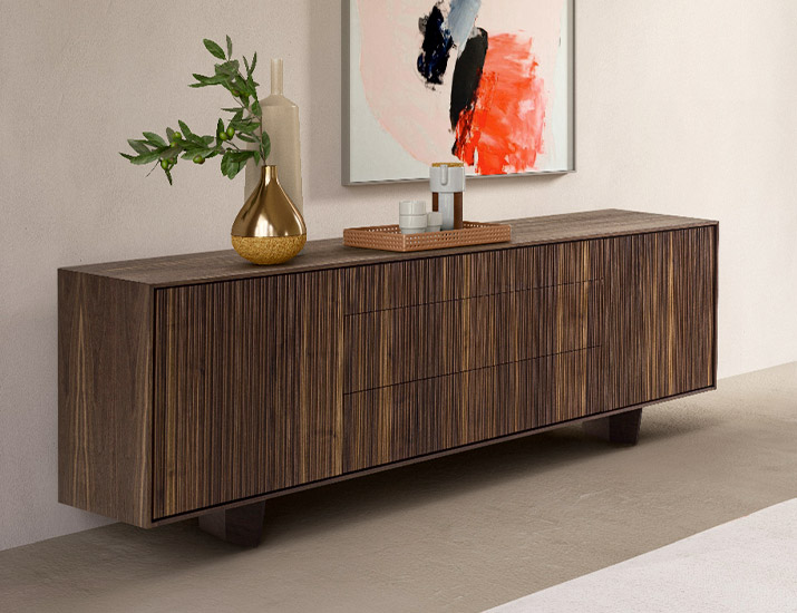 - Vela Sideboard: Credenza in legno massello e listellare, con ante e frontali dei cassetti arricchiti da un’elegante lavorazione verticale, che crea un affascinante effetto geometrico moderno e dinamico. I cassetti sono assemblati con la pregiata tecnica a coda di rondine, sinonimo di qualità e resistenza nel tempo.