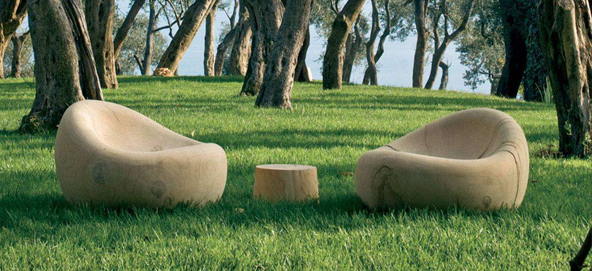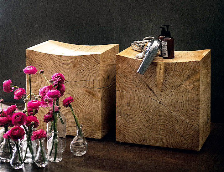 I tronchi vengono sezionati con macchinari all'avanguardia, che permettono di ottenere elementi dalle forme precise. Per gli arredi in cedro, si utilizzano sezioni trasversali per sgabelli e tavolini, mentre per le panche si prediligono tagli longitudinali che esaltano le venature naturali. I complementi d’arredo più piccoli, invece, nascono dal riutilizzo degli sfridi di produzione, recuperando gli scarti di arredi più grandi per ridurre al minimo gli sprechi.