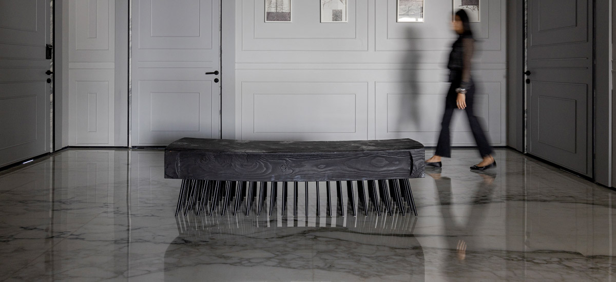 Un processo distintivo della Cedro Collection è il Cedro Vulcano, ottenuto tramite la tecnica giapponese Shou Sugi Ban. Questo metodo prevede la carbonizzazione superficiale del legno di cedro, conferendogli un'intensa colorazione nero antracite e una texture ruvida con venature in rilievo.
