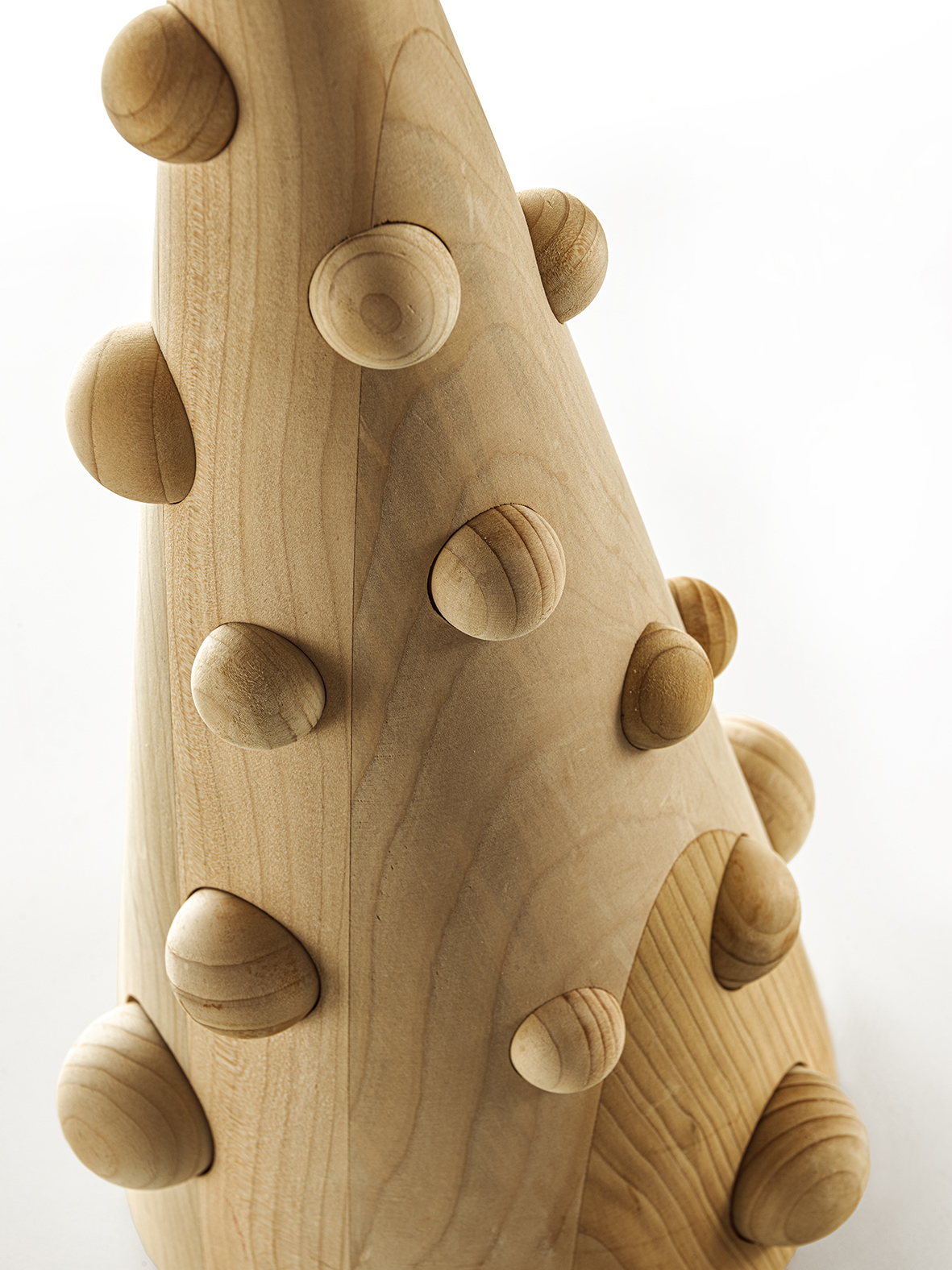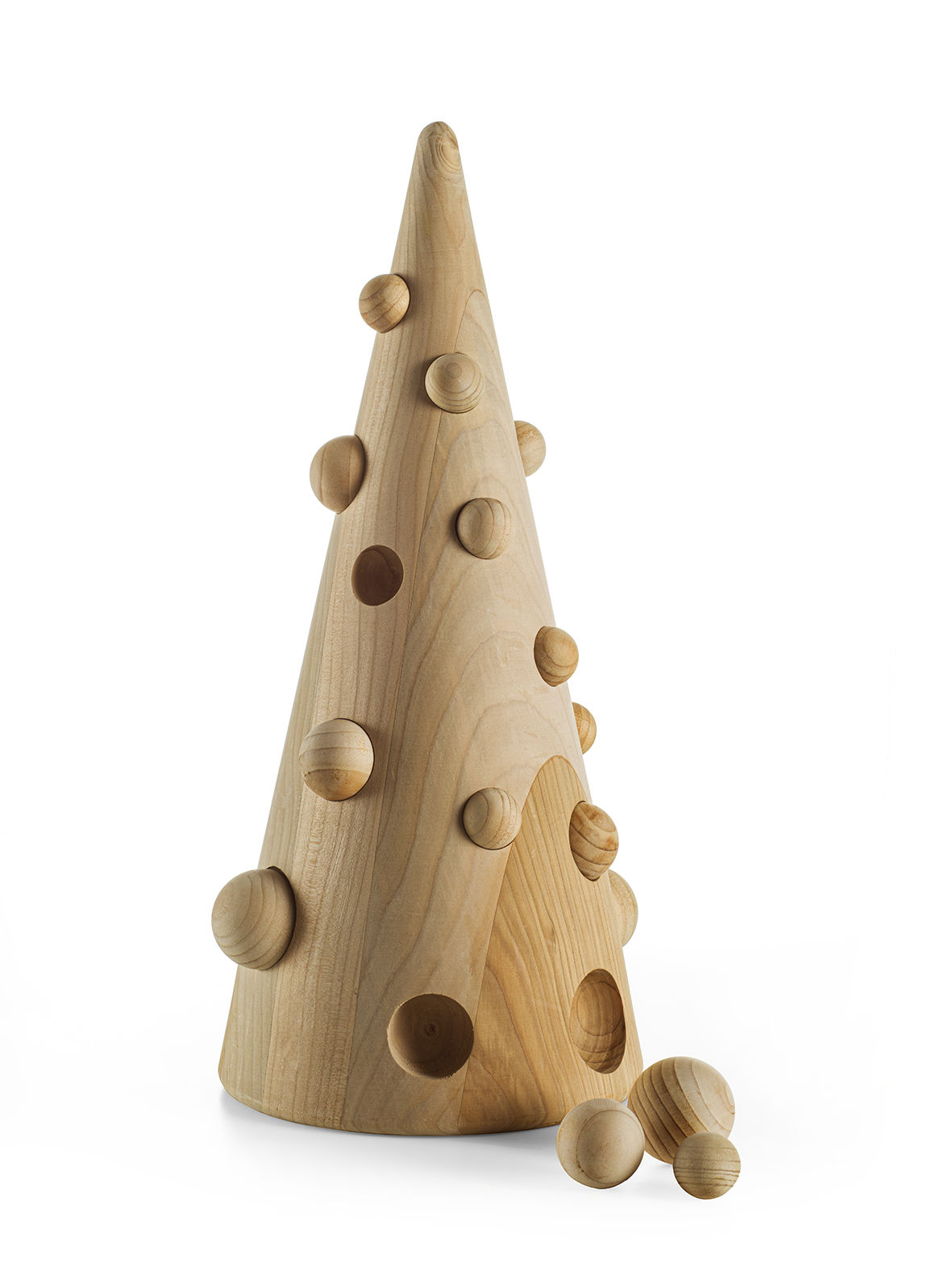 Il tradizionale albero di Natale viene interpretato da una forma conica, semplice e lineare, interrotta da molteplici fori tondi che accolgono piccole sfere in legno massello, che ricordano le palline decorative.