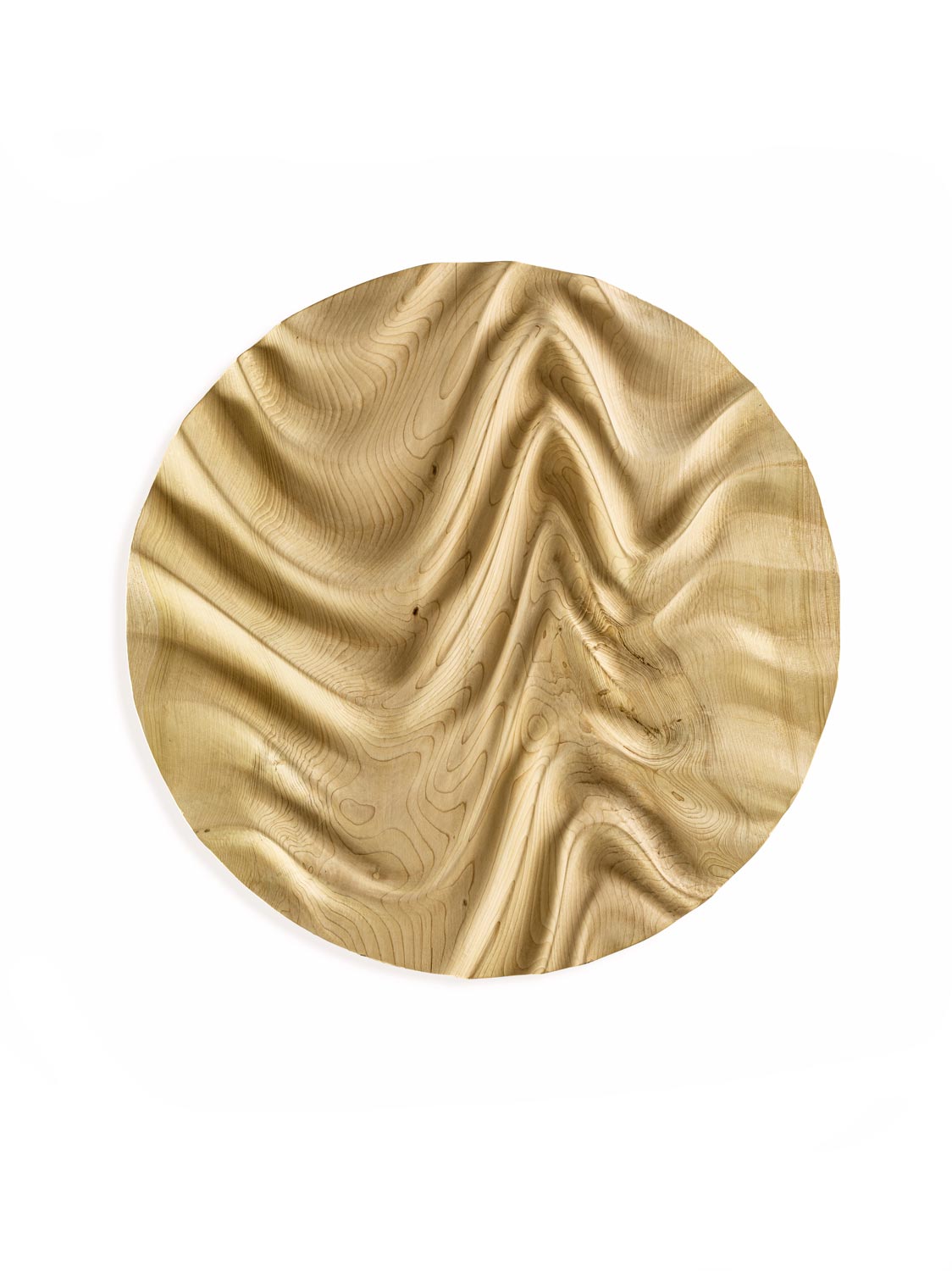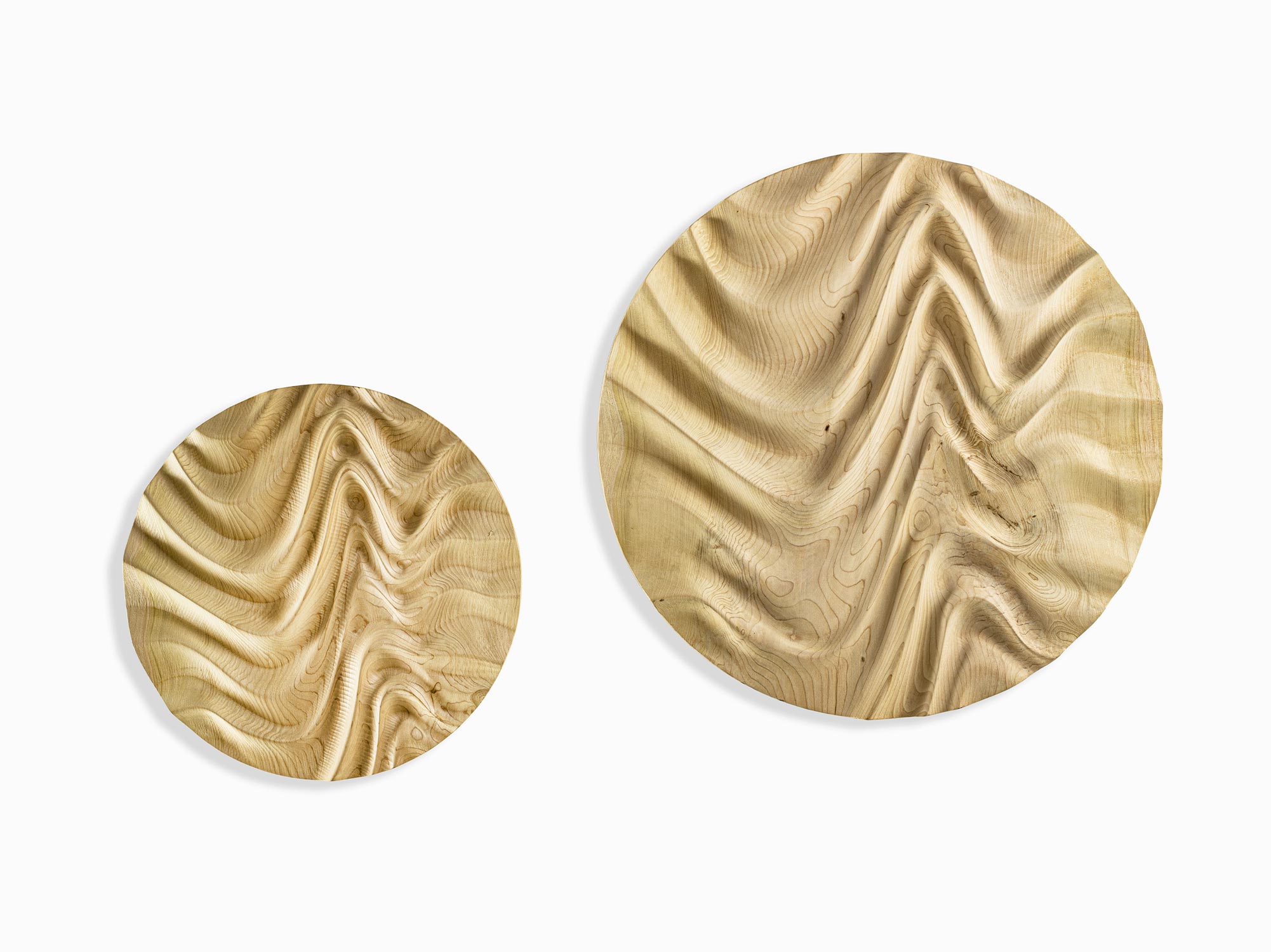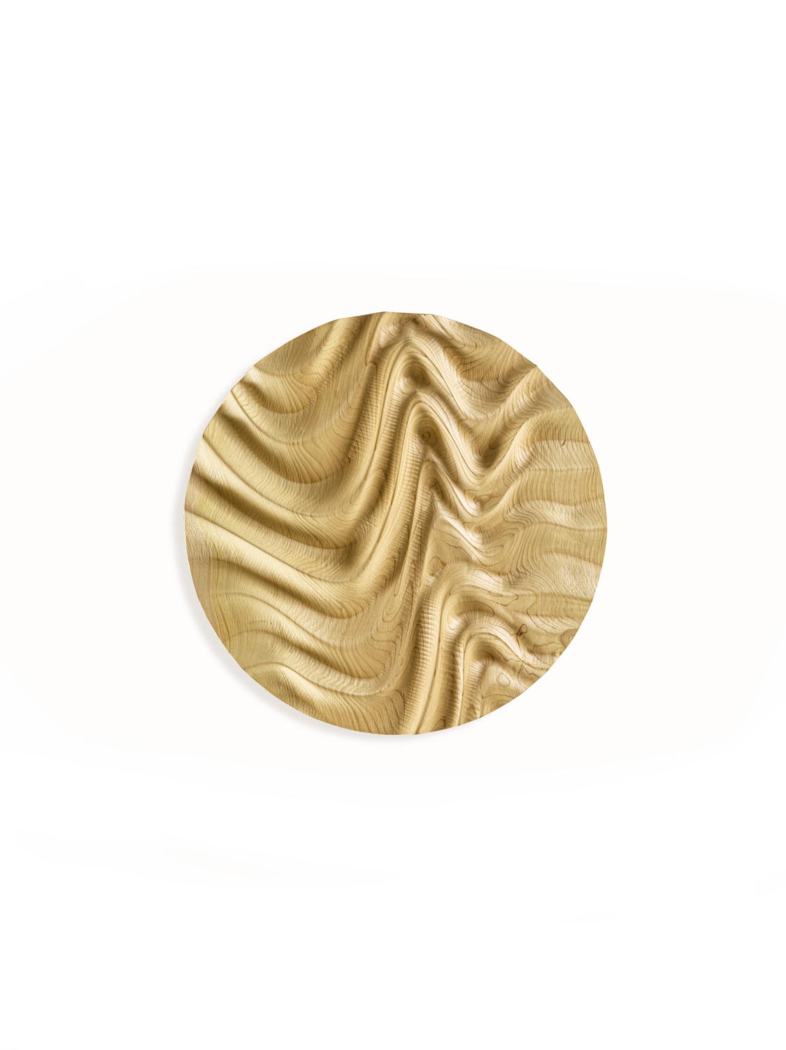 Decorazione scultorea a muro in legno massello di cedro a liste incollate. Le linee sinuose in rilievo creano un gioco di volumi e geometrie originale e raffinato, che esprime tutta l’unicità di un'arte che si lascia ispirare dalle mille forme della natura.