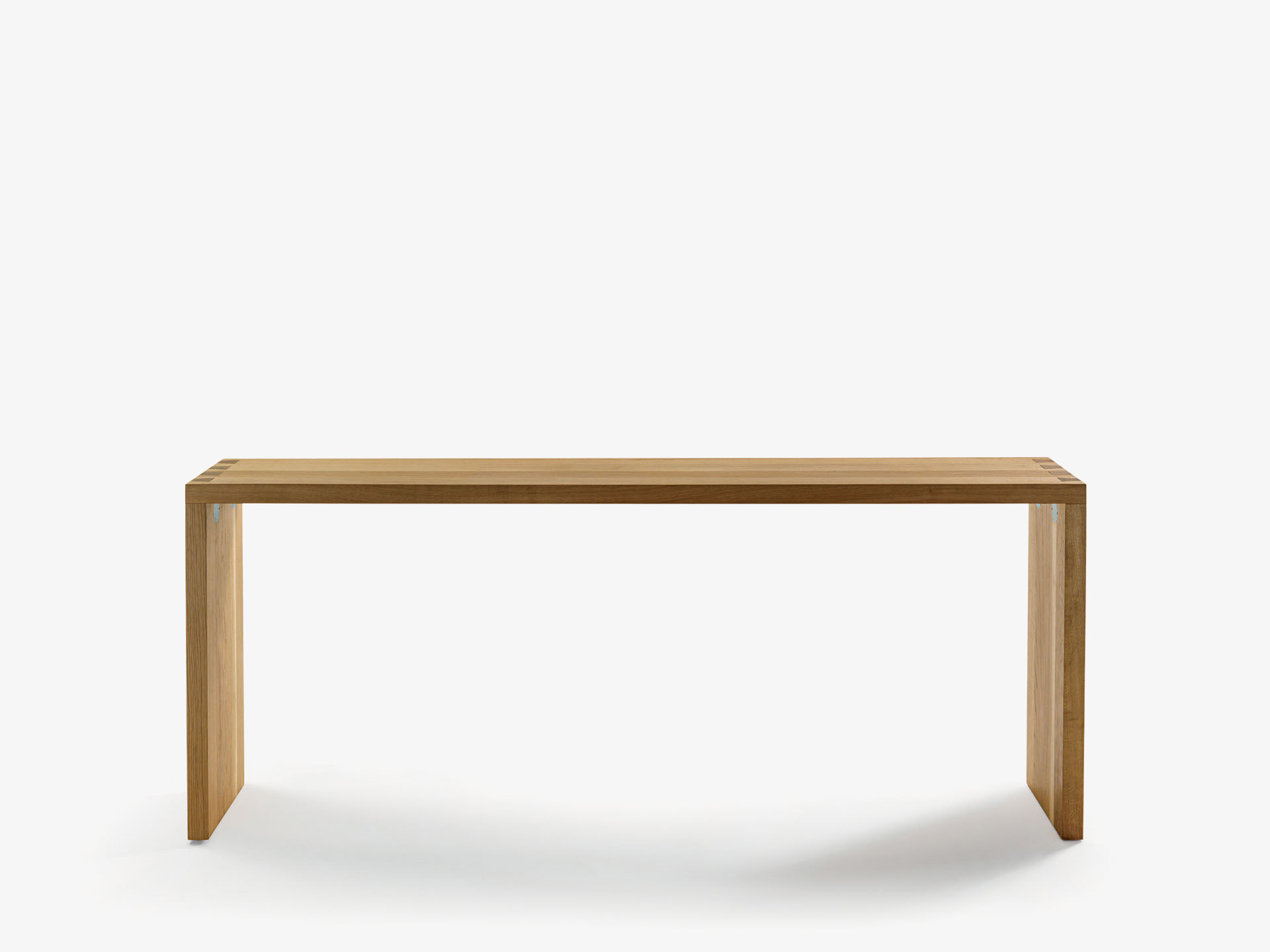 Console interamente realizzata in legno massello a liste incollate con lati squadrati, caratterizzata da un incastro a coda di rondine tra top e base.