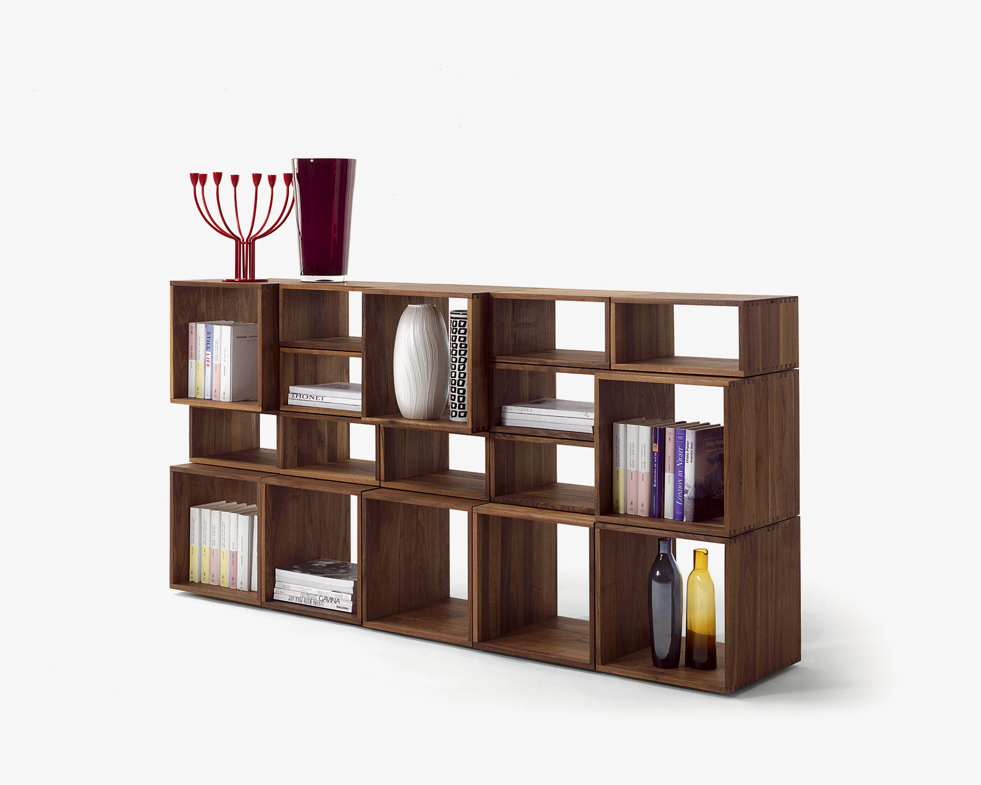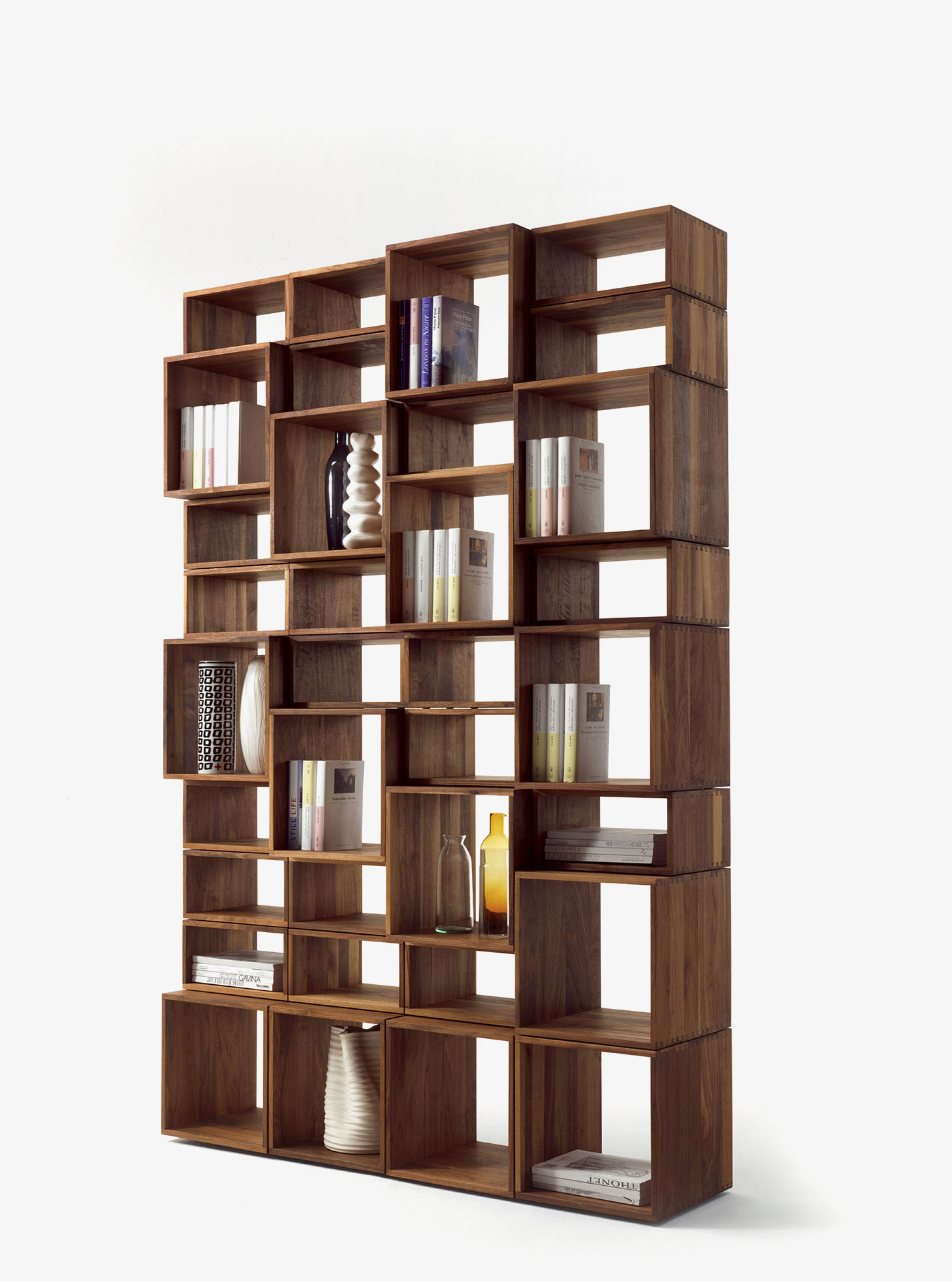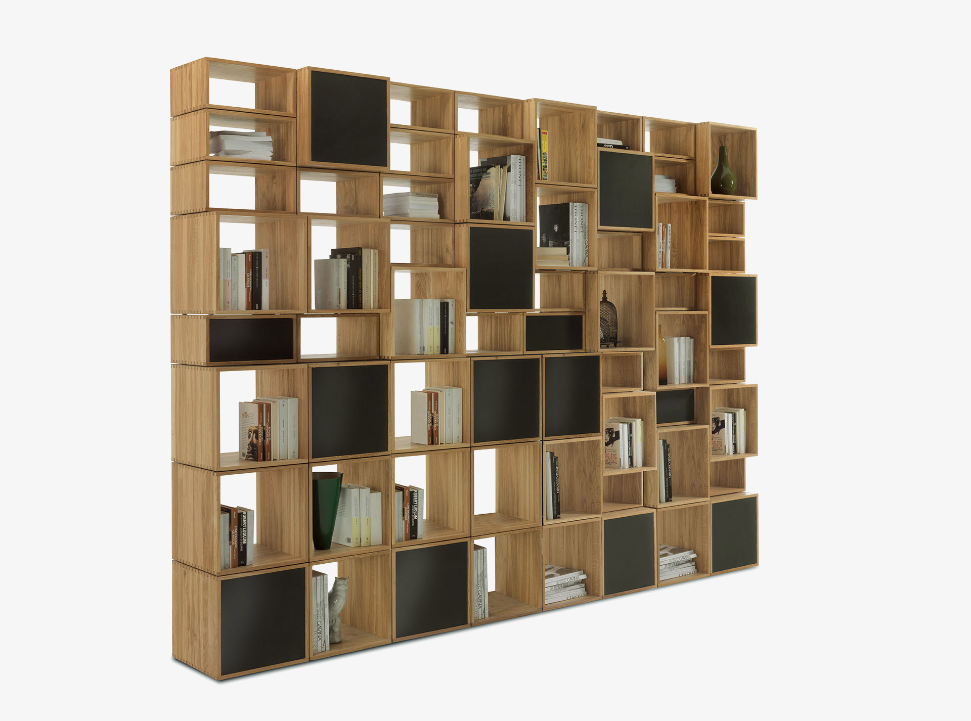 Libreria realizzata in legno massello, costituita da moduli componibili impilabili ed accostabili tra loro attraverso specifica ferramenta di montaggio. Legno massello spessore 1,5 cm e incastri a coda di rondine caratterizzano ogni elemento. Flessibile sulla base delle esigenze d’arredo vede la possibilità di inserimento di schienali, ante e cassetti assemblati con incastri a coda di rondine e dotati di sistema di apertura push-pull e guide metalliche. Disponibile con vano porta TV fisso o girevole, dotato di sistema passacavi. A richiesta è disponibile con elementi “bifacciali” e può essere utilizzata come elemento divisorio all’interno dell’ambiente.