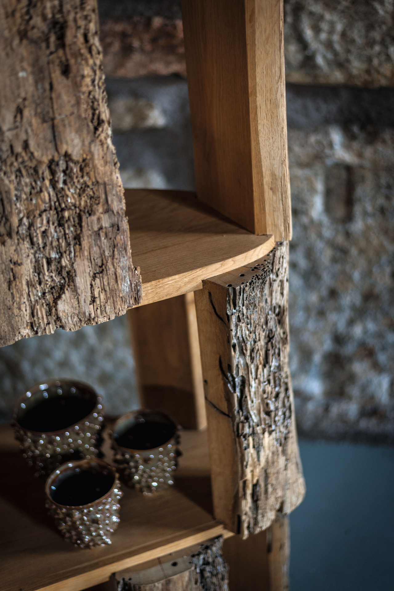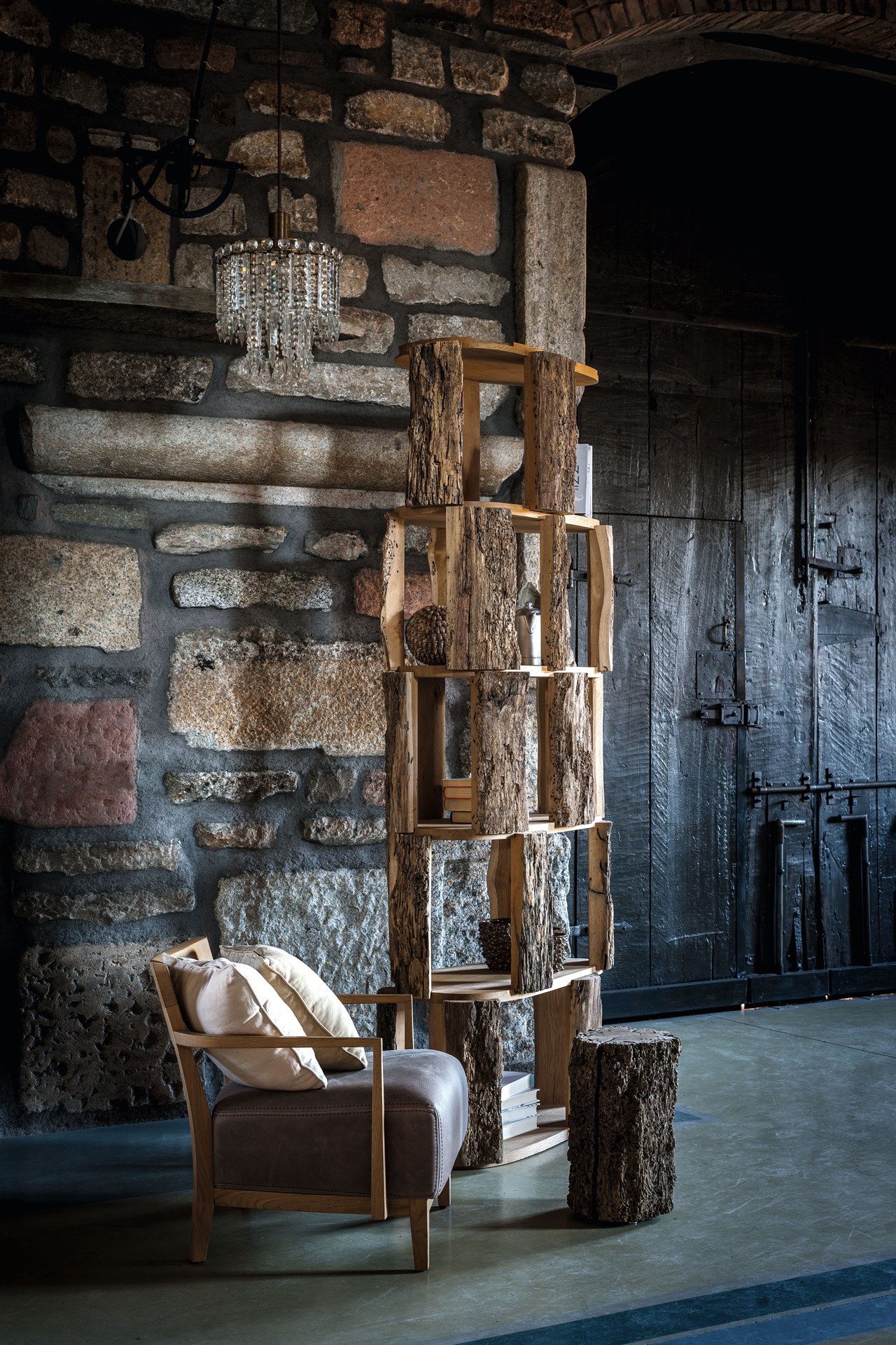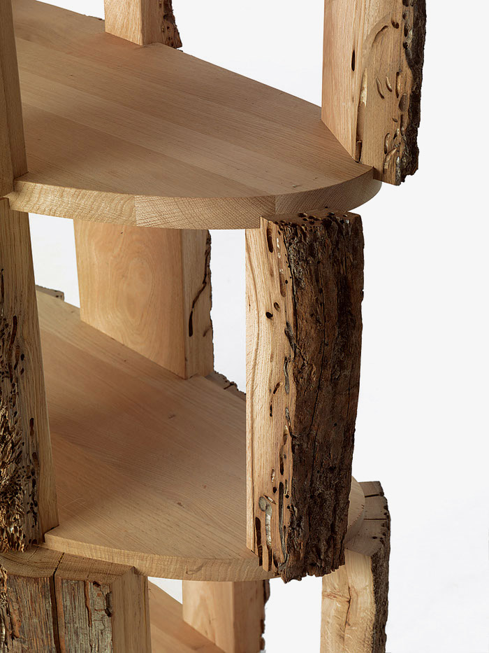 Libreria realizzata in legno di Briccola e ripiani in rovere, si caratterizza per uno sviluppo lineare a colonna con differenti livelli che danno spazio ai vani contenitori delimitati da porzioni di tronco con corteccia al vivo.