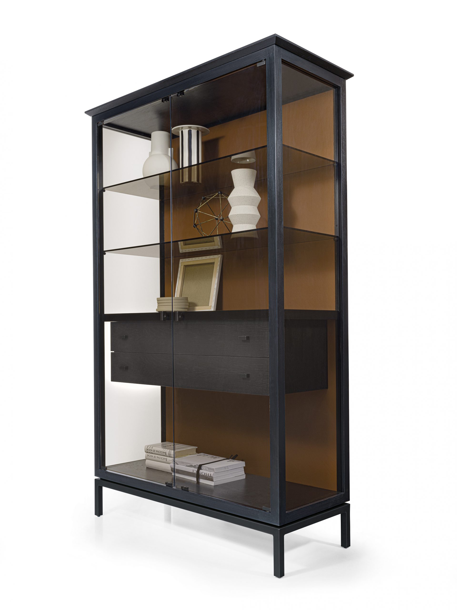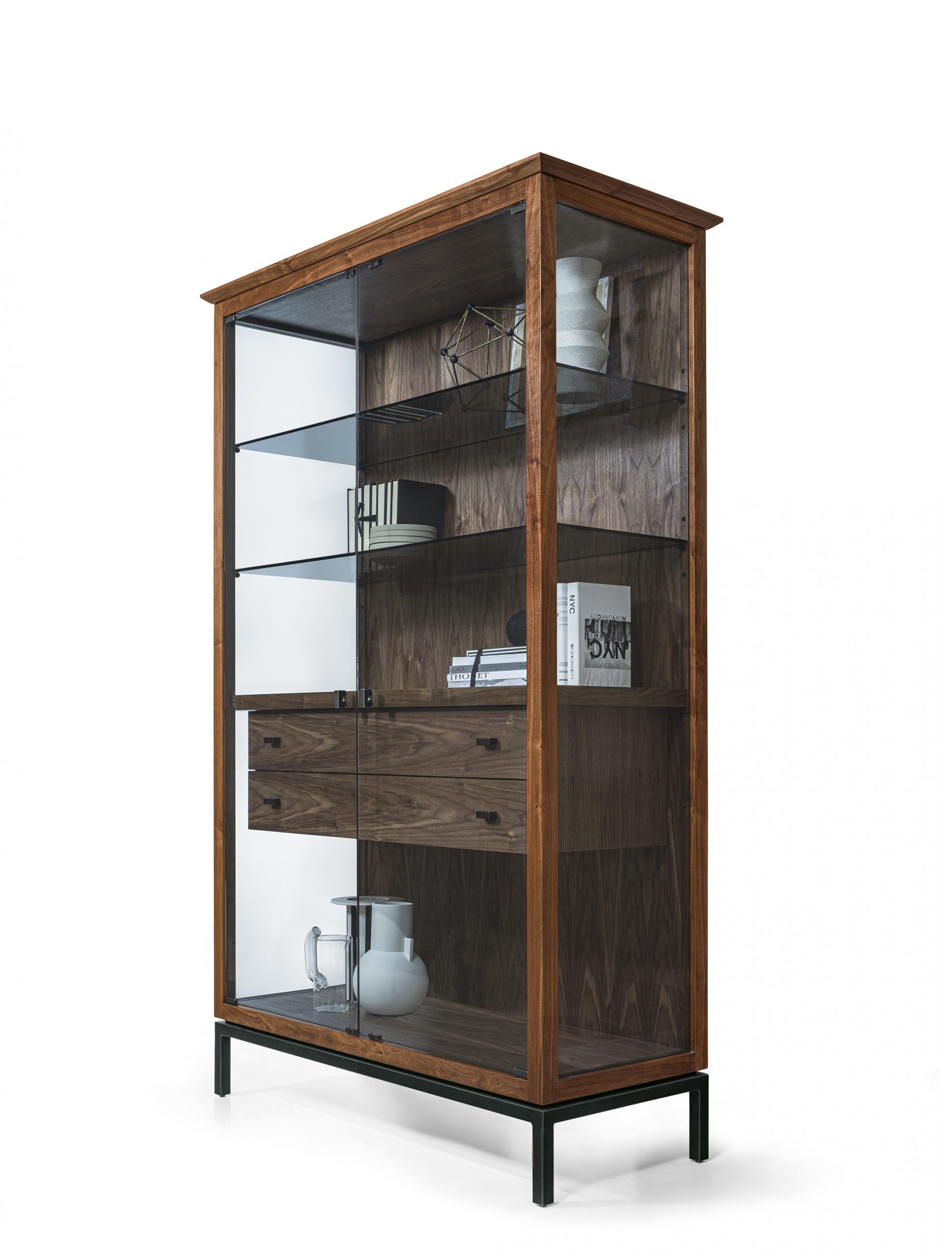 Vetrina alta con struttura in legno massello caratterizzata da ante e spalle in vetro, utilizzato anche per i ripiani interni. Ripiano centrale fisso in legno. Disponibile in versione a 2 o 4 ante in vetro, con cassettiera interna o esterna, e base in ferro. Innovativo sistema di luci LED con accensione autonoma e ricarica wireless.