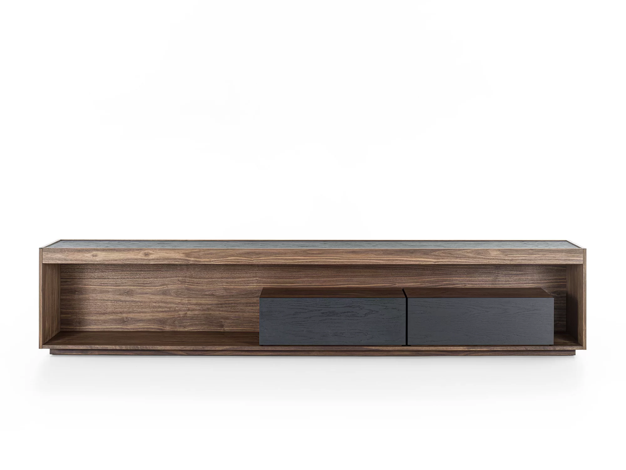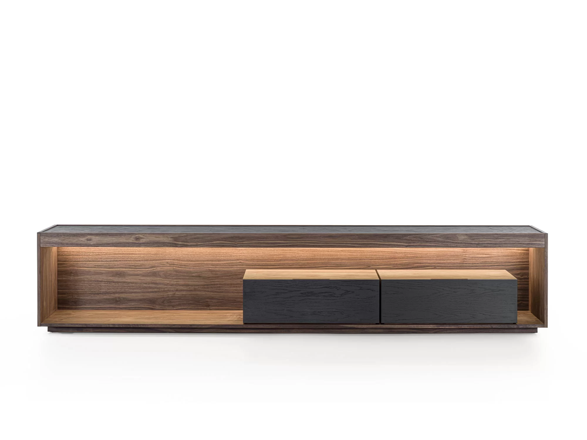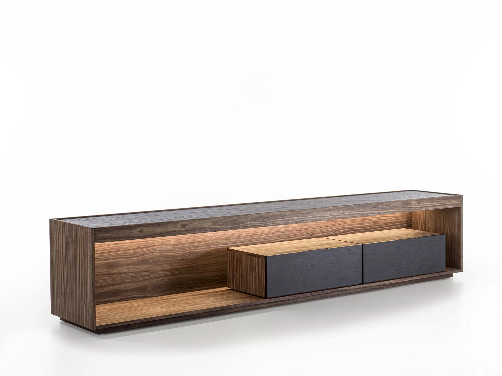Madia in legno massello e listellare, a giorno, con cornice in legno e due cassetti assemblati con tradizionale incastro a coda di rondine. Top incassato, luci a LED a illuminare il vano a giorno.