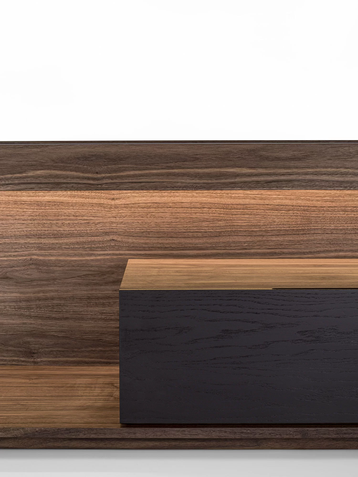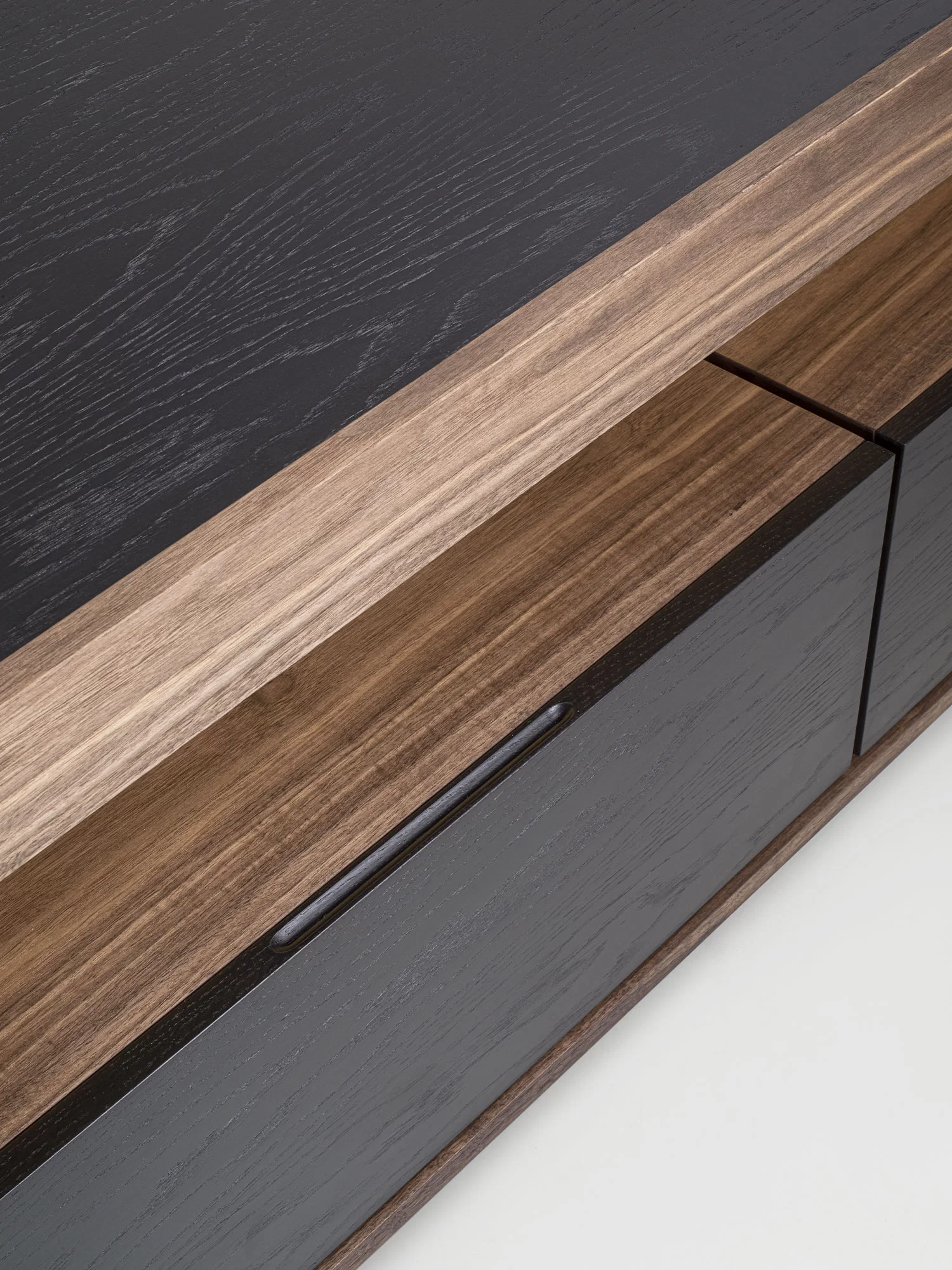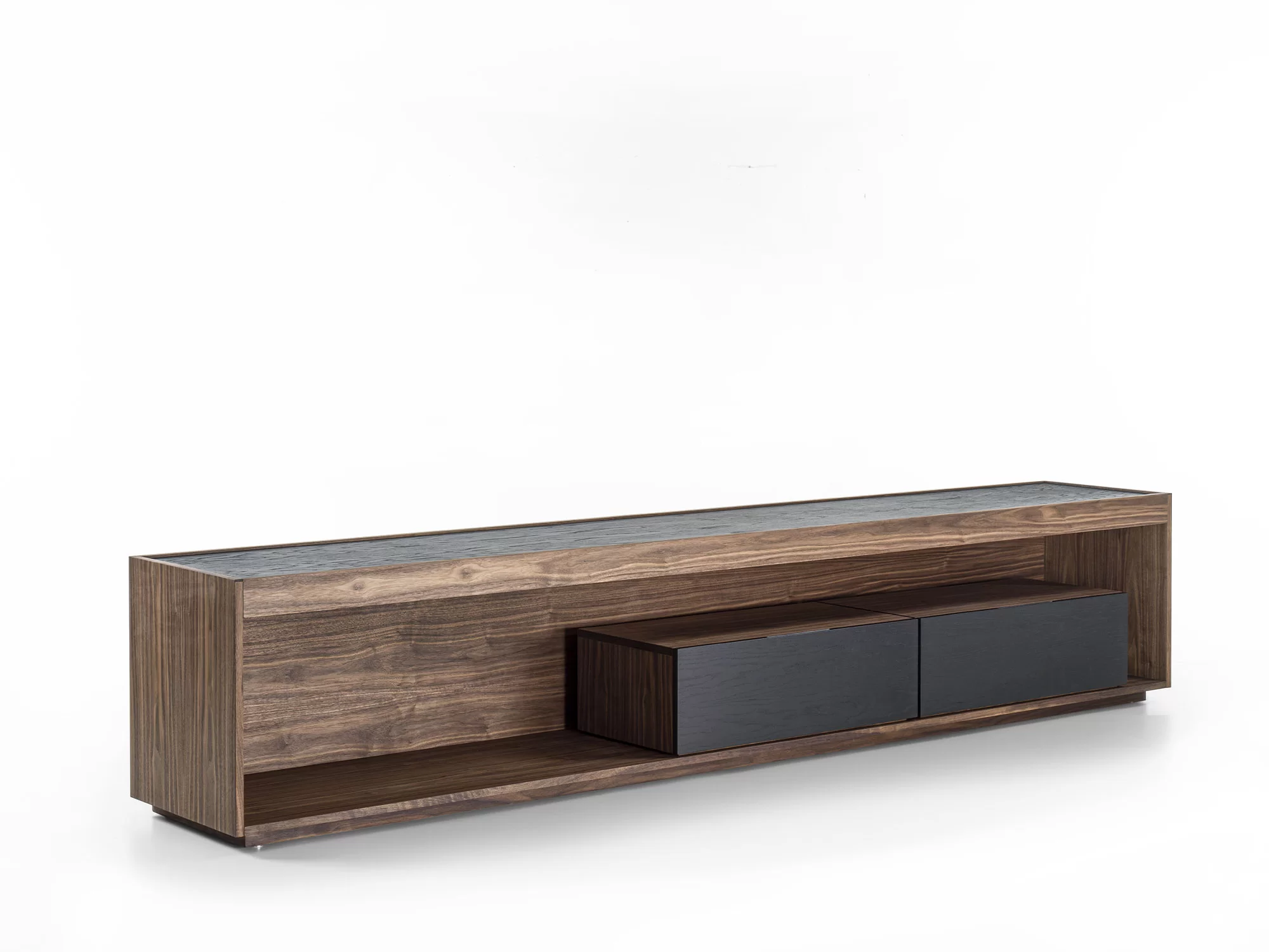 Madia in legno massello e listellare, a giorno, con cornice in legno e due cassetti assemblati con tradizionale incastro a coda di rondine. Top incassato, luci a LED a illuminare il vano a giorno.