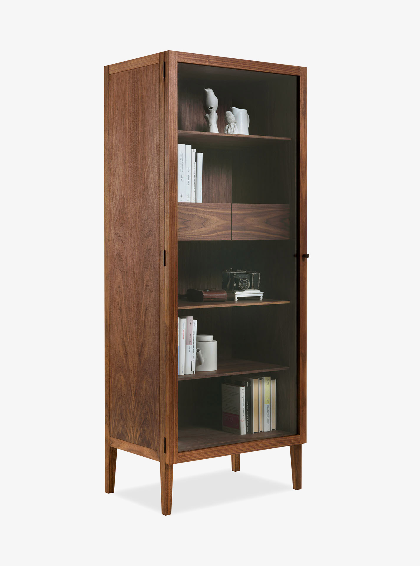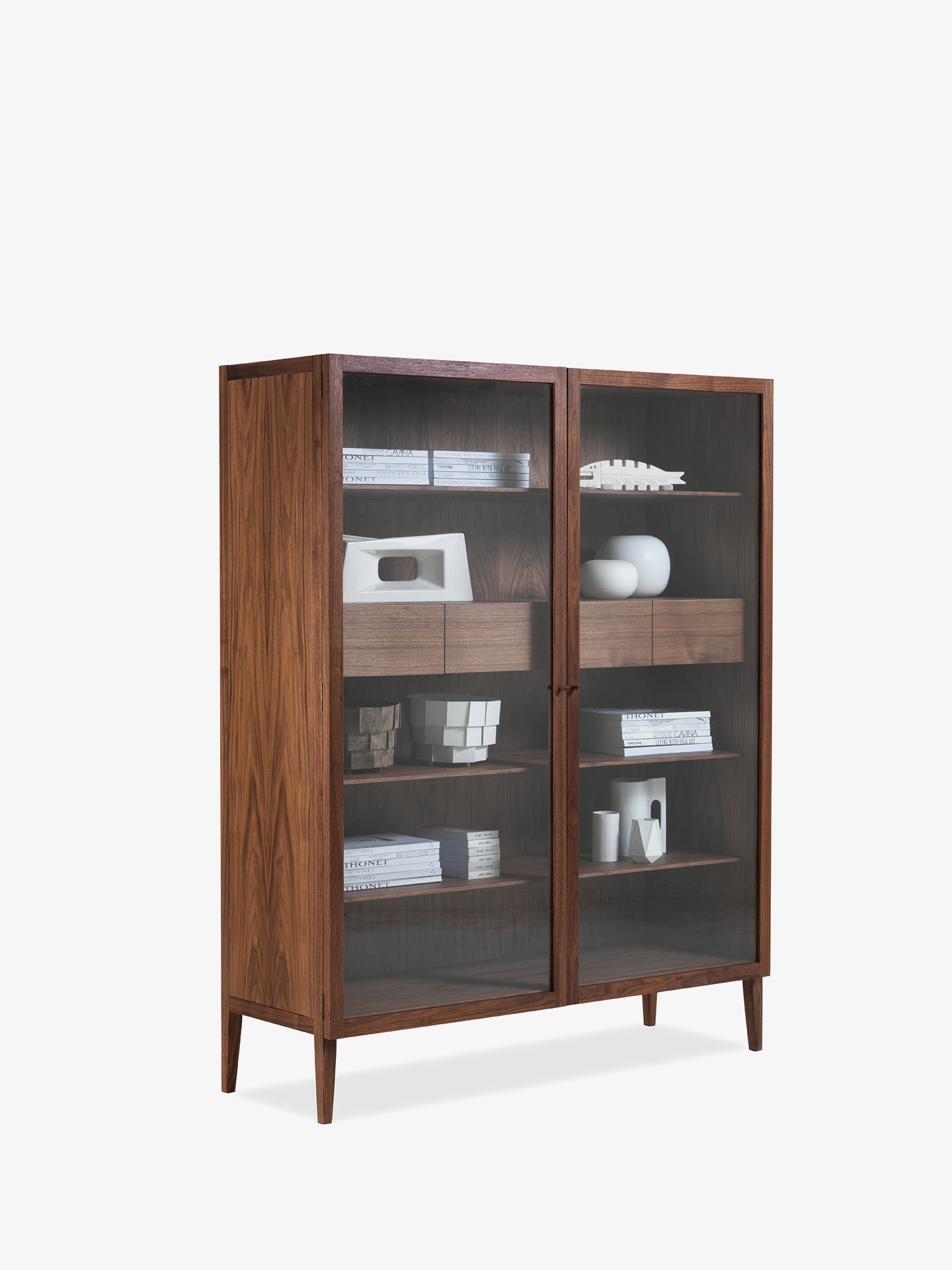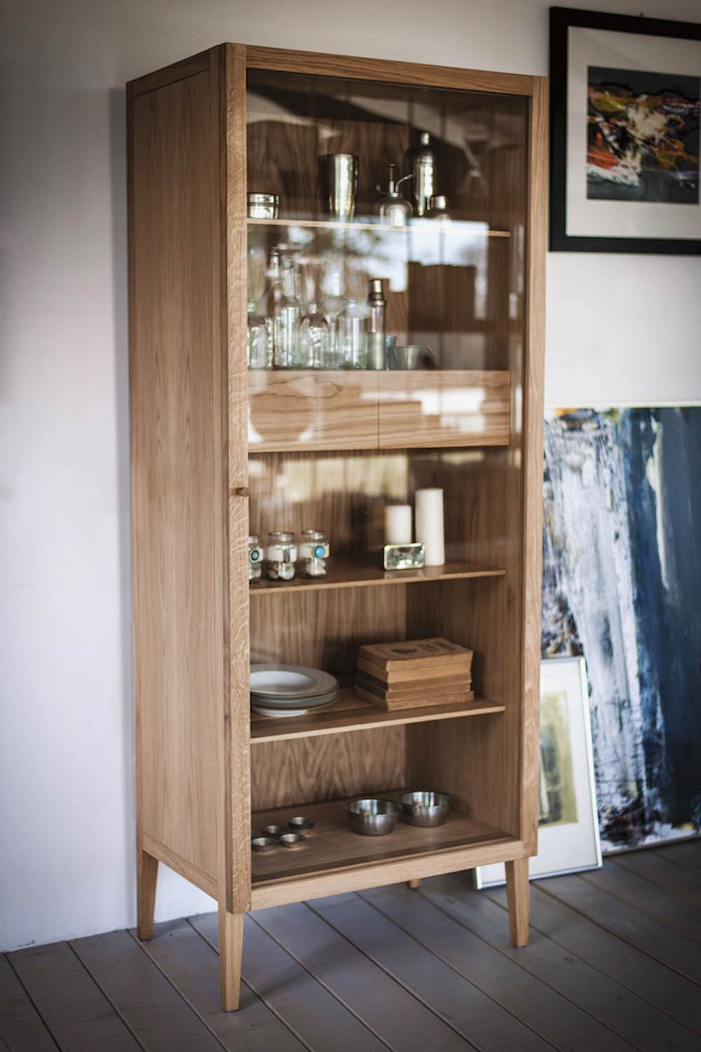 Vetrina caratterizzata da struttura in legno massello e listellare con ante in vetro trasparente dotate di pomoli, disponibile nella versione anta doppia o singola. I cassetti interni sono assemblati con incastri a coda di rondine. Quattro sottili piedini sospendono l’elemento da terra.