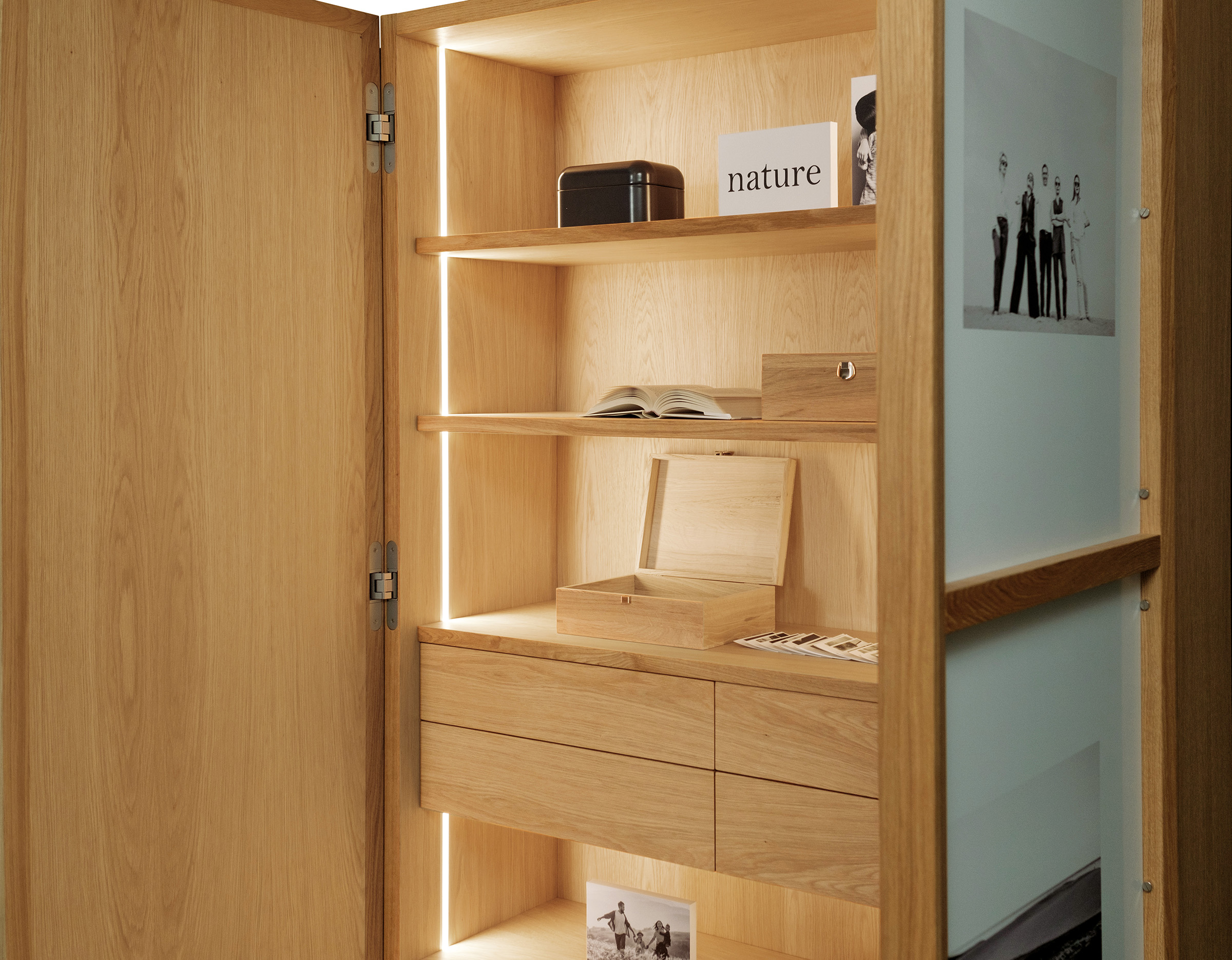 Mobile contenitore con struttura in listellare, caratterizzato da ante “cornice” ideate per poter esporre fotografie. Ante con bordo in legno massello, pannello listellare con applicate immagine fotografiche, con decorazione che simula i frontali dei cassetti. Interno con cassetti dotati di sistema di apertura push pull e illuminazione per mezzo di strisce a LED posizionate sulle spalle, la cui accensione risulta automatica tramite sensori che si attivano con l’apertura dell’anta.