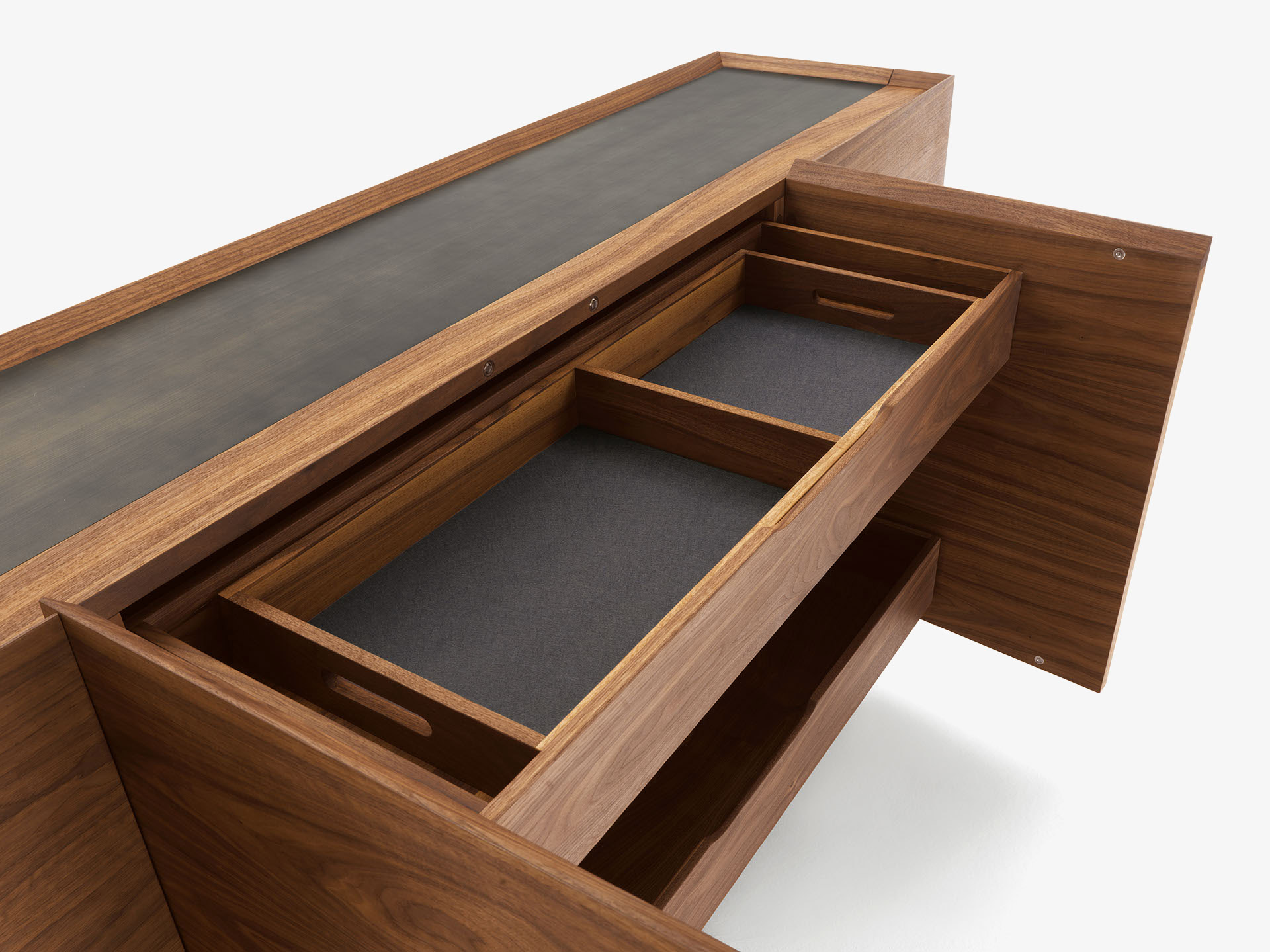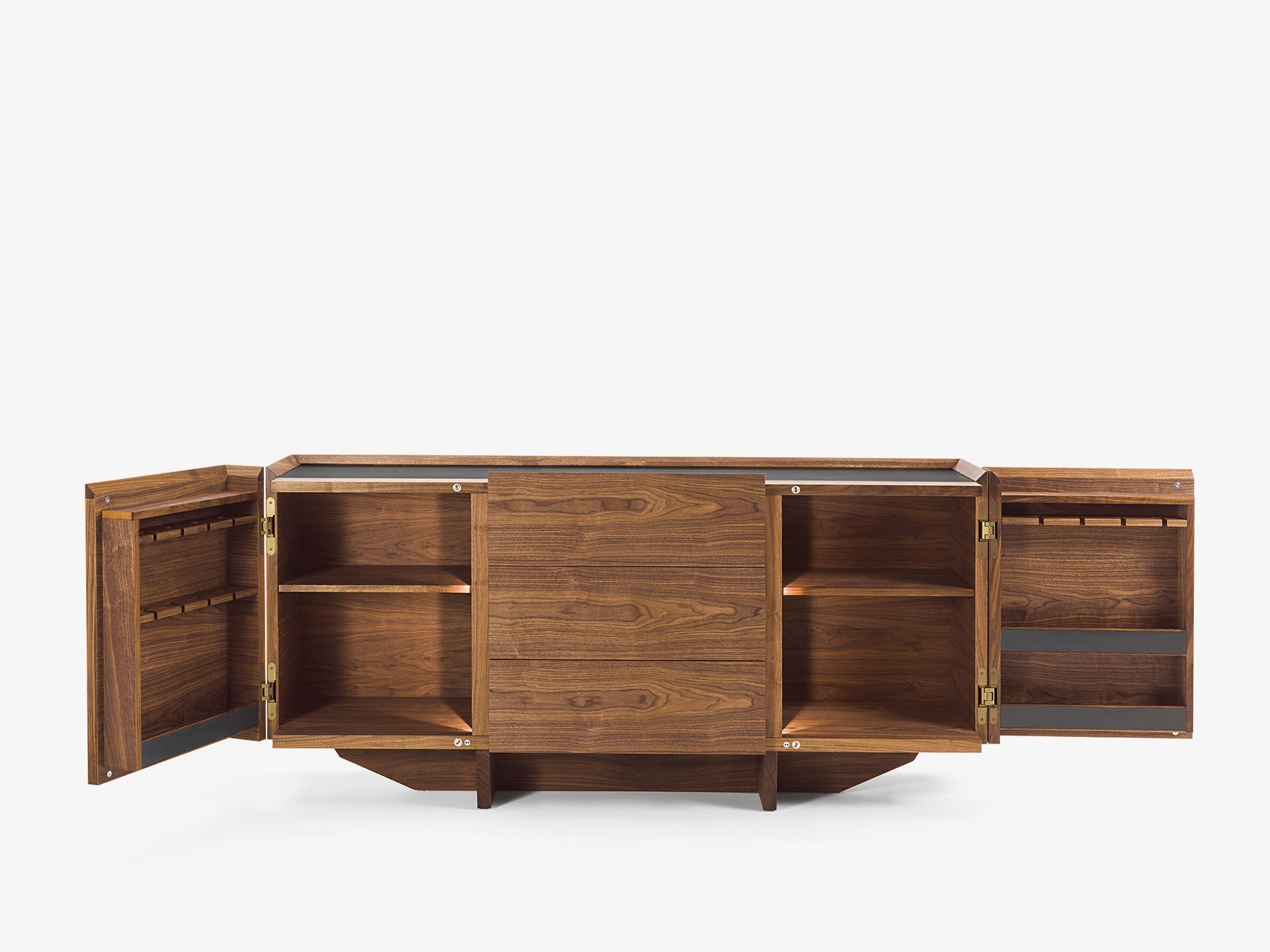 Mobile contenitore multifunzione in legno listellare, disponibile anche nella versione con inserto in metallo o cuoio sul top e sulle mensole interne alle ante. Ante laterali contenitive, con angolo di apertura a 180°, attrezzate con piccoli ripiani per contenere o appendere i bicchieri. Il vano centrale, nella versione L.247 cm racchiuso all'interno di due ante a battente, ospita una serie di cassetti costruiti con incastri a coda di rondine. I due vani laterali sono illuminati per mezzo di strisce a LED posizionate sulle spalle centrali, la cui accensione risulta automatica tramite sensori che si attivano all'apertura delle ante.