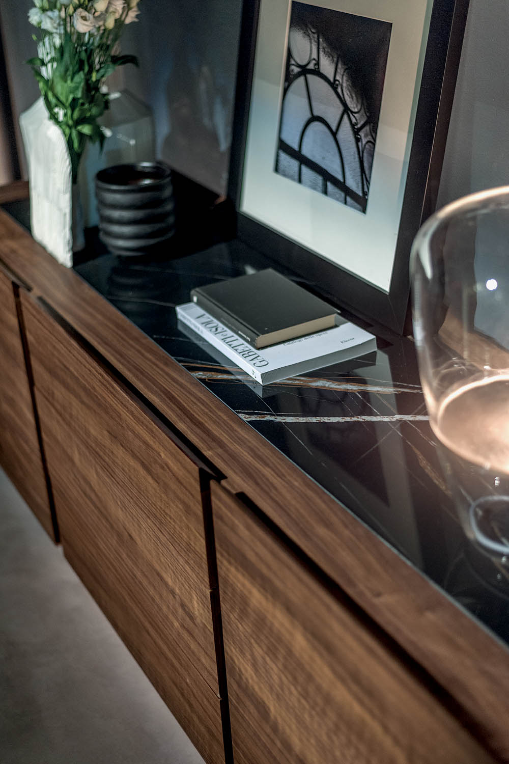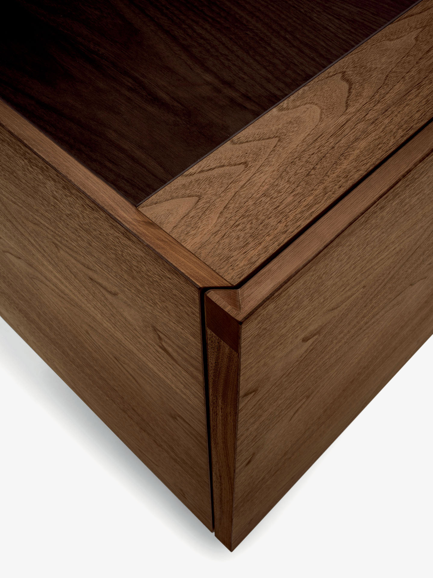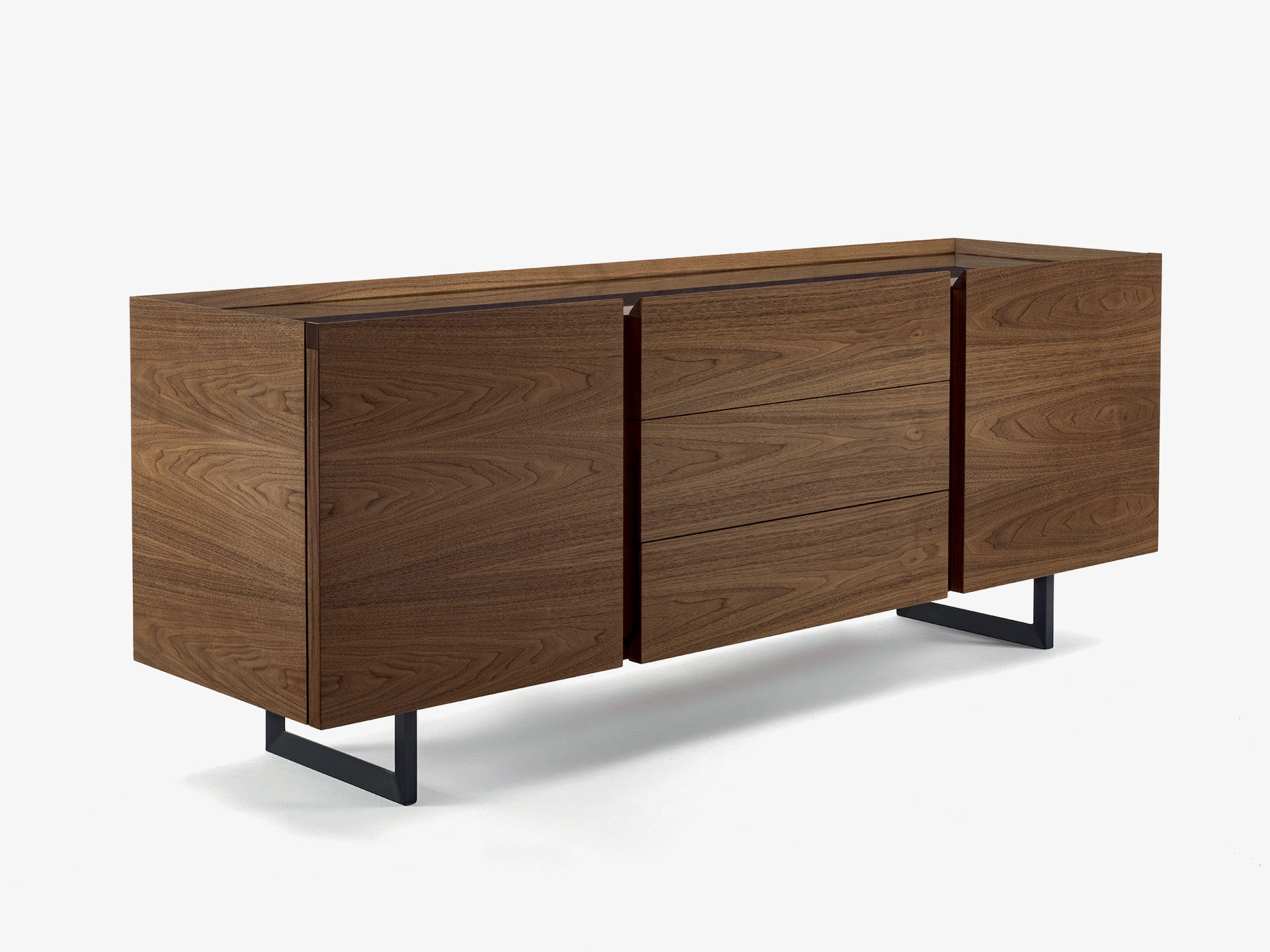 Mobile contenitore multifunzione in legno listellare con due ante laterali, disponibile anche nella versione con inserto sul top in metallo, marmo o vetro. Restyling della versione originale, prevede l’inserimento di un basamento in ferro caratterizzato da due gambe a slitta. Il vano centrale ospita una serie di cassetti assemblati con incastri a coda di rondine. I vani laterali sono illuminati per mezzo di strisce a LED posizionate sulle spalle centrali, la cui accensione risulta automatica tramite sensori che si attivano all’apertura delle ante. ATTREZZATURA STANDARD: 2 ANTE - 2 RIPIANI SPOSTABILI - 3 CASSETTI