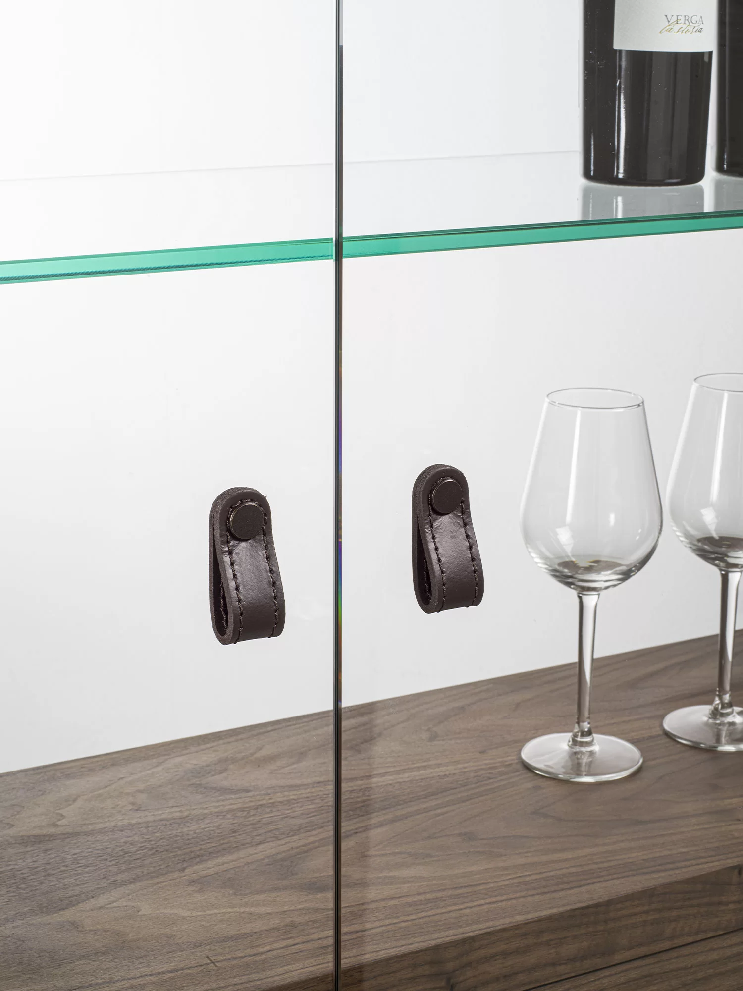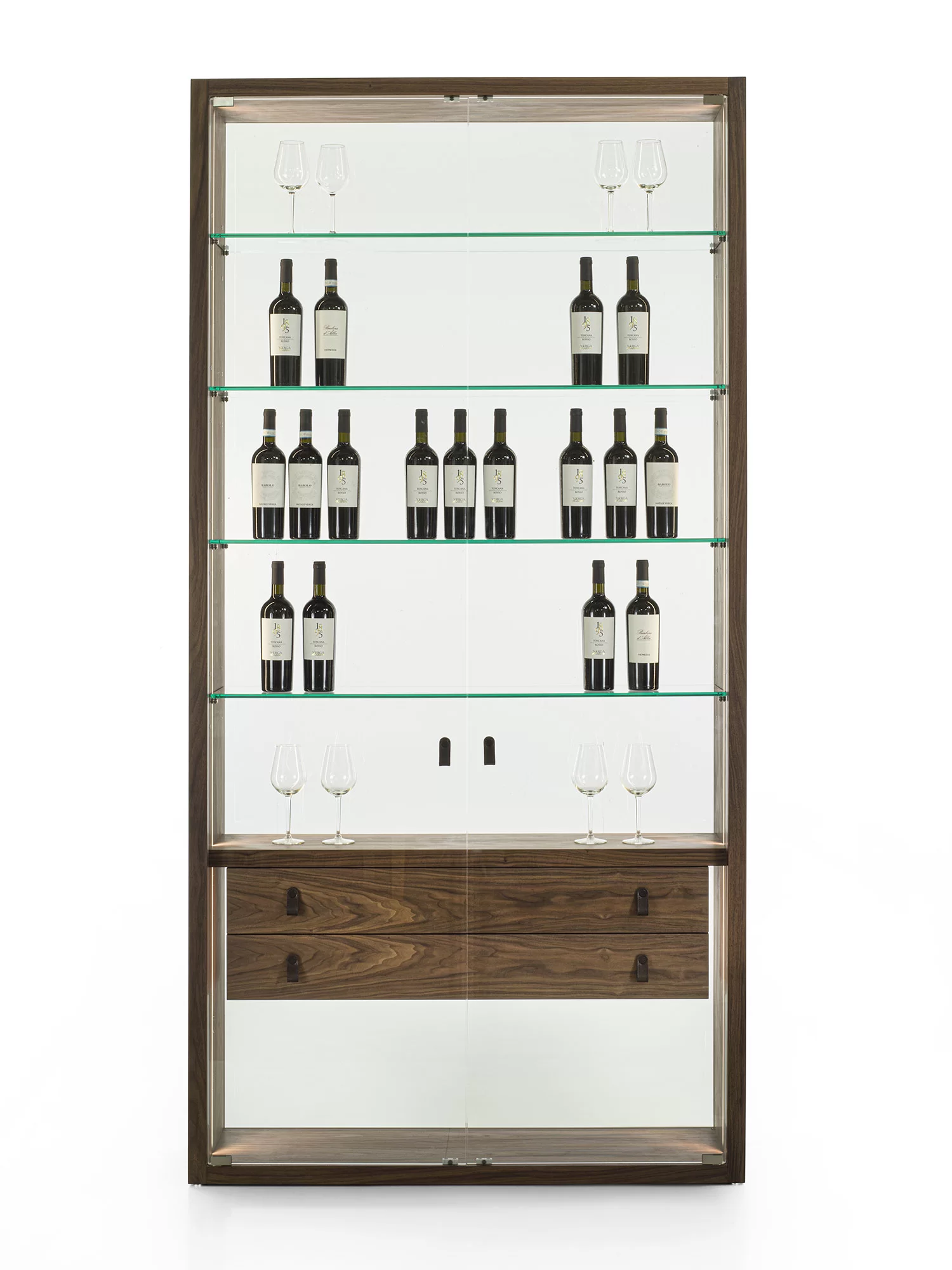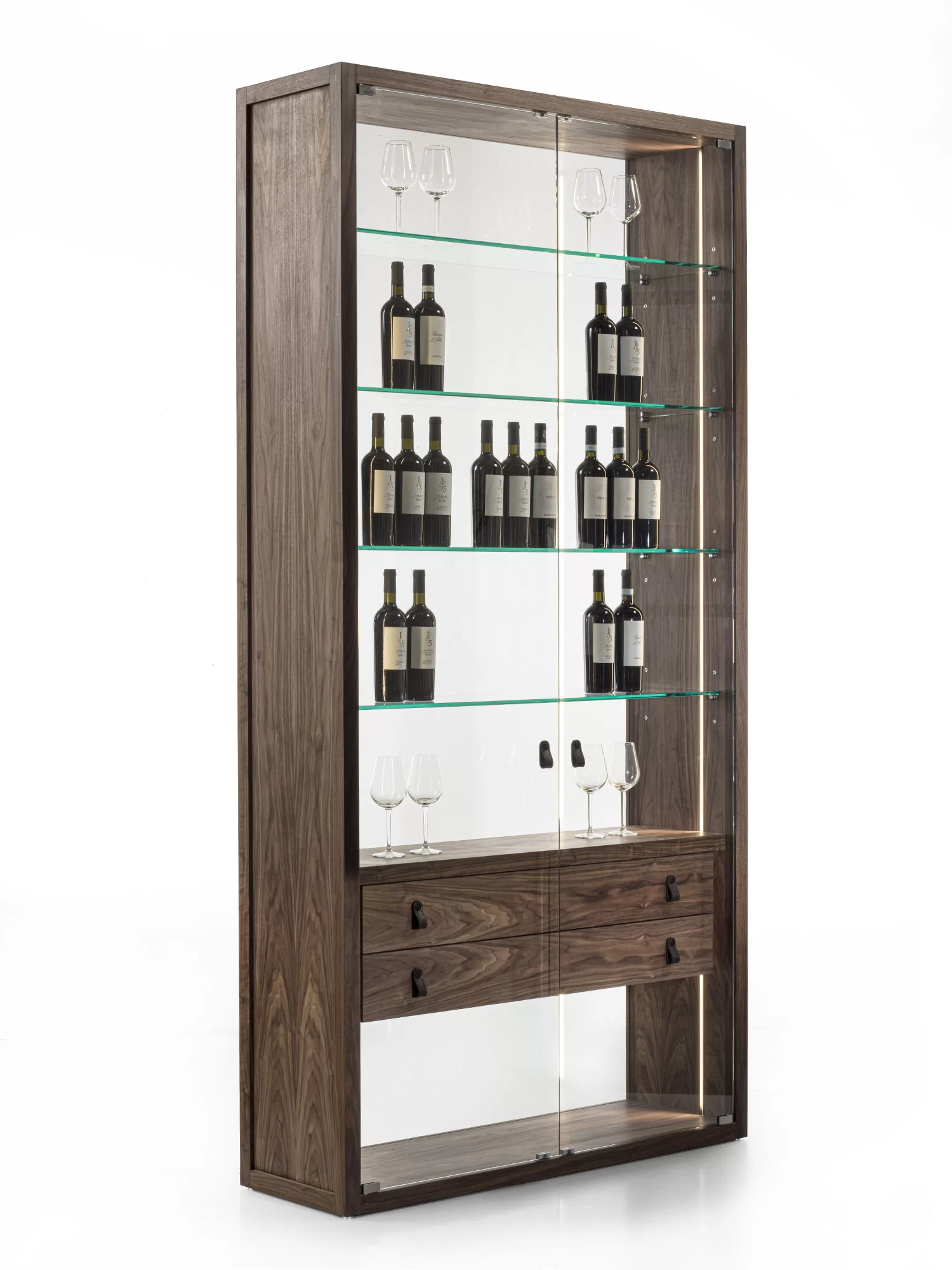 Vetrina alta, tipo espositore, con struttura in legno massello e listellare, caratterizzata da ante, quattro ripiani interni e schienale in vetro. Dotata di cassettiera interna con due cassetti. Maniglie in cuoio ne facilitano l'apertura. Illuminata da un sistema di luci LED verticali.