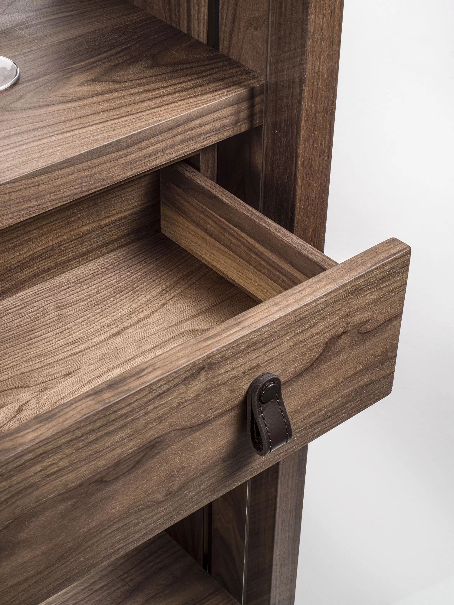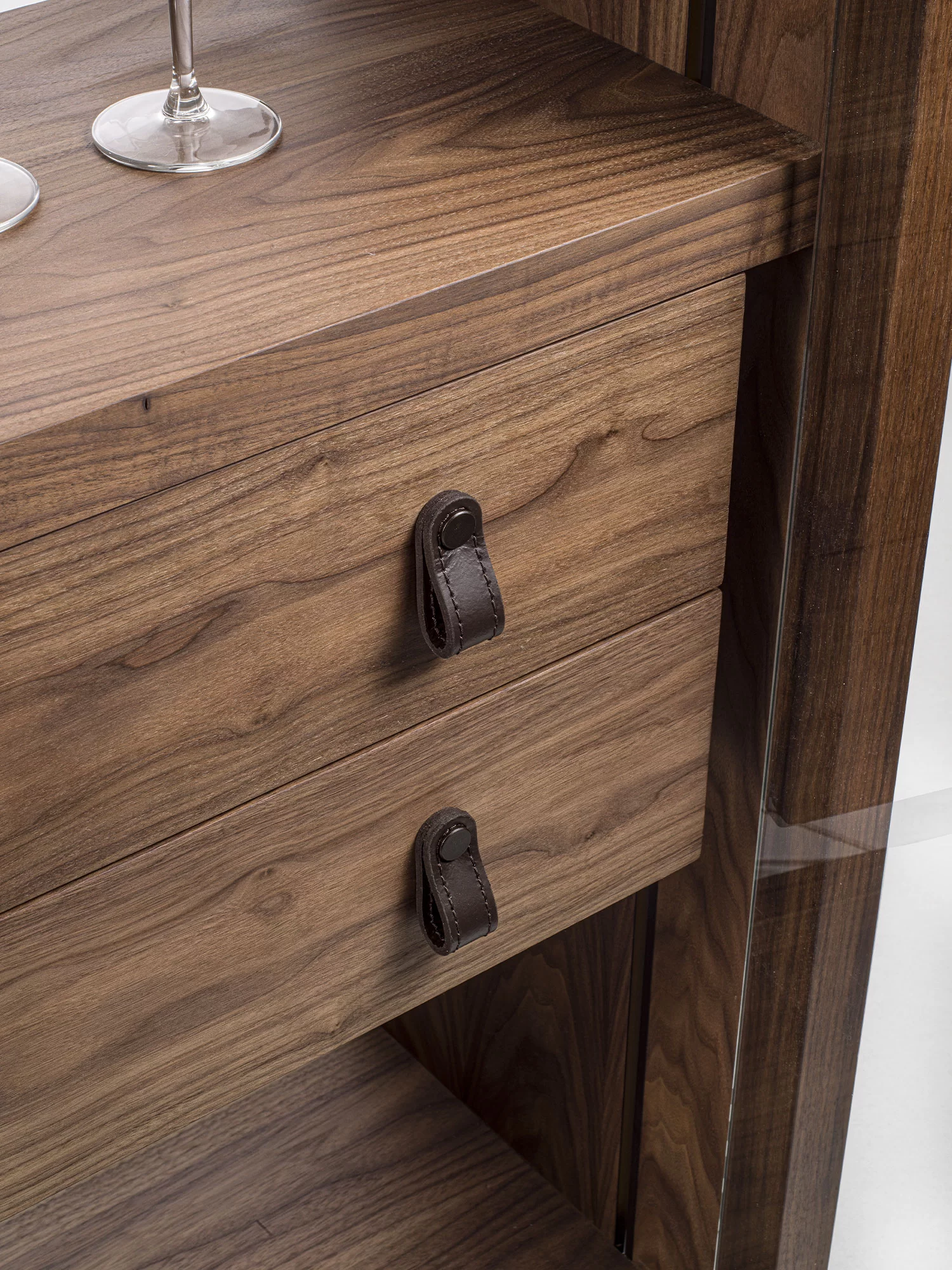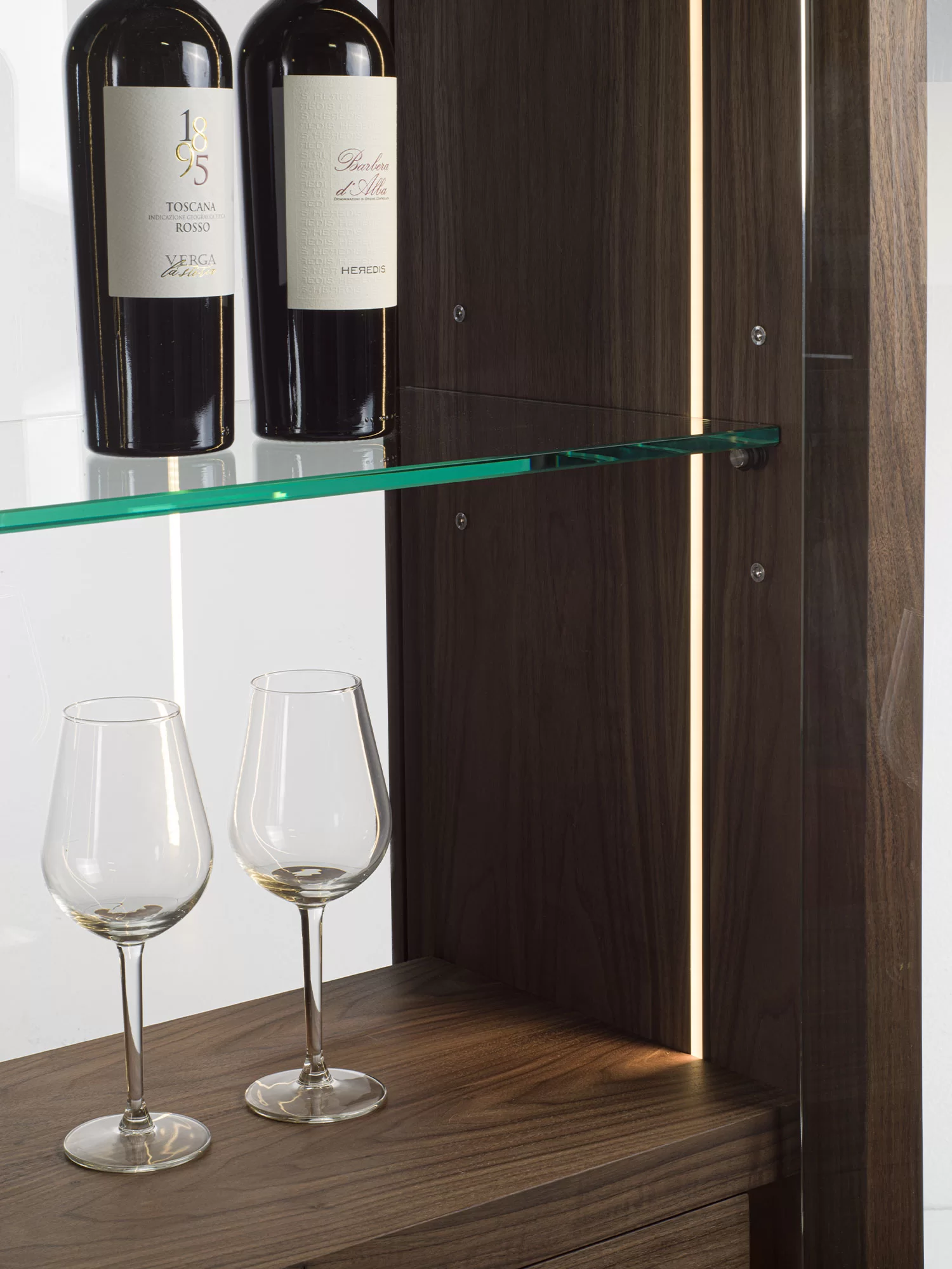 Vetrina alta, tipo espositore, con struttura in legno massello e listellare, caratterizzata da ante, quattro ripiani interni e schienale in vetro. Dotata di cassettiera interna con due cassetti. Maniglie in cuoio ne facilitano l'apertura. Illuminata da un sistema di luci LED verticali.