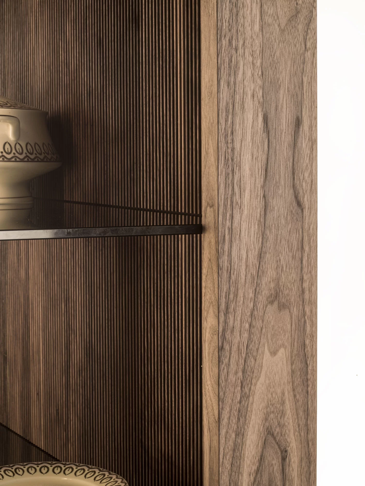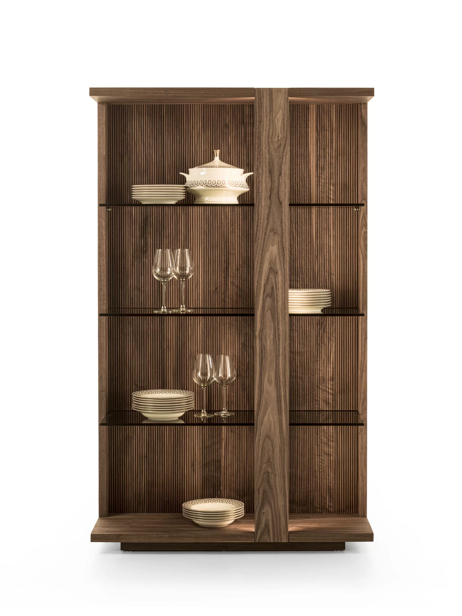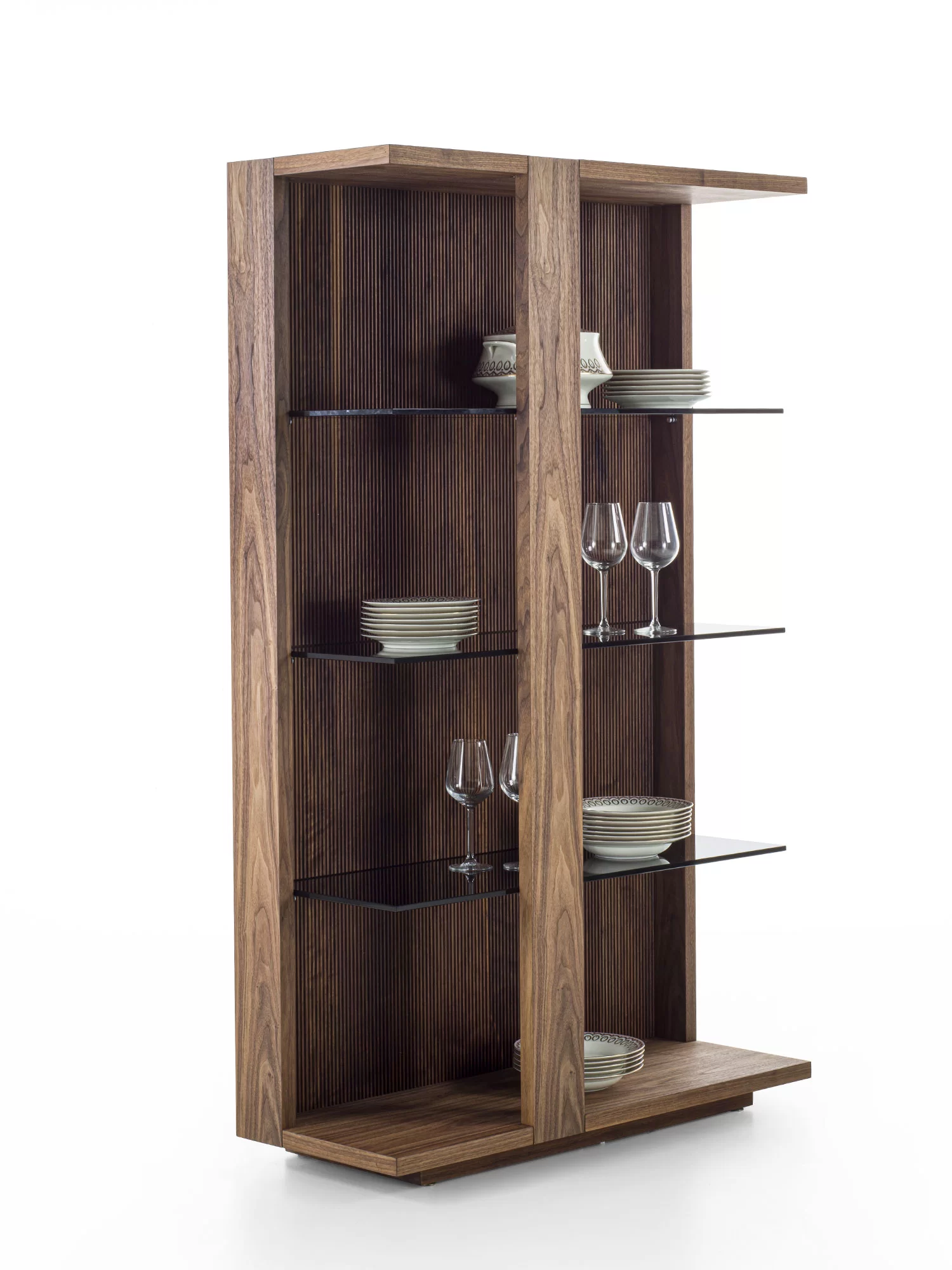 La collezione Revo viene completata da una credenza alta, a giorno, in legno massello e listellare, dotata di tre ripiani in vetro sp.10mm. Top e base in legno. Disponibile in due versioni: con schienale caratterizzato da una particolare lavorazione verticale, Fresart, che crea un effetto geometrico moderno e dinamico oppure con decorazione Fresart applicata sulle tre fascie verticale perimetrali strutturali. Illuminata con sistema di luci LED con accensione tramite telecomando.