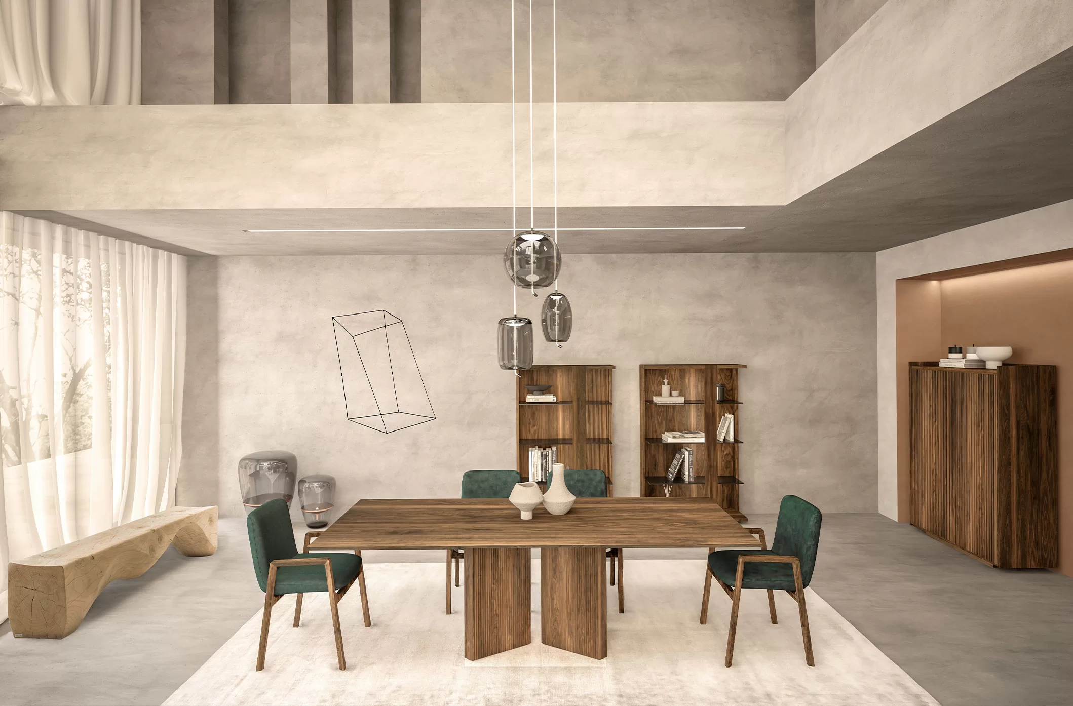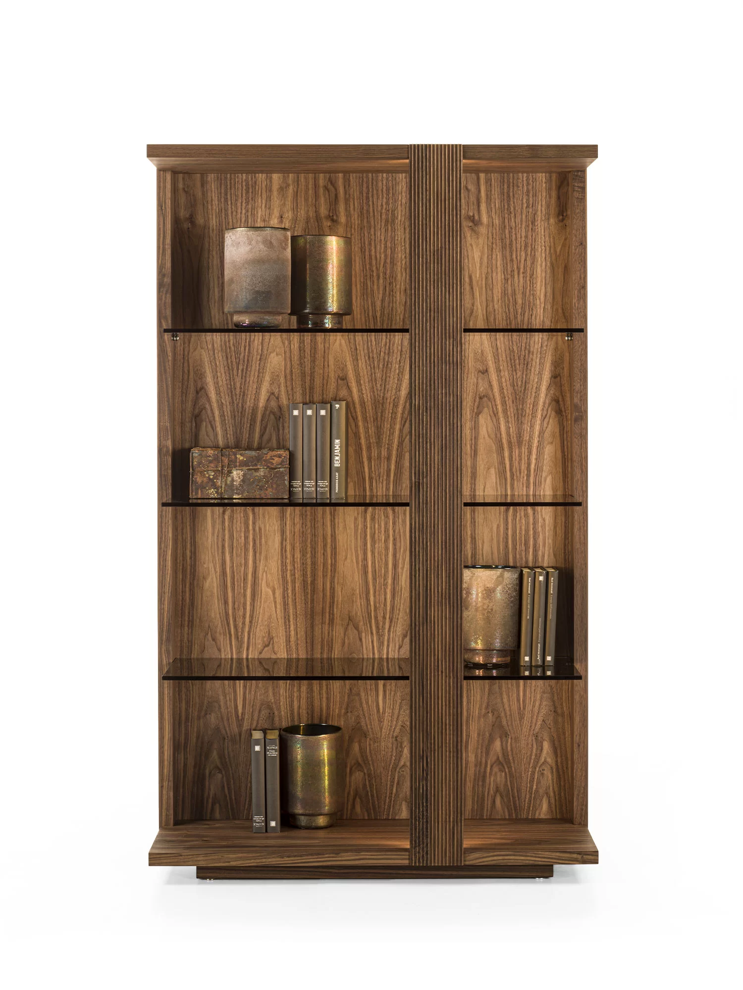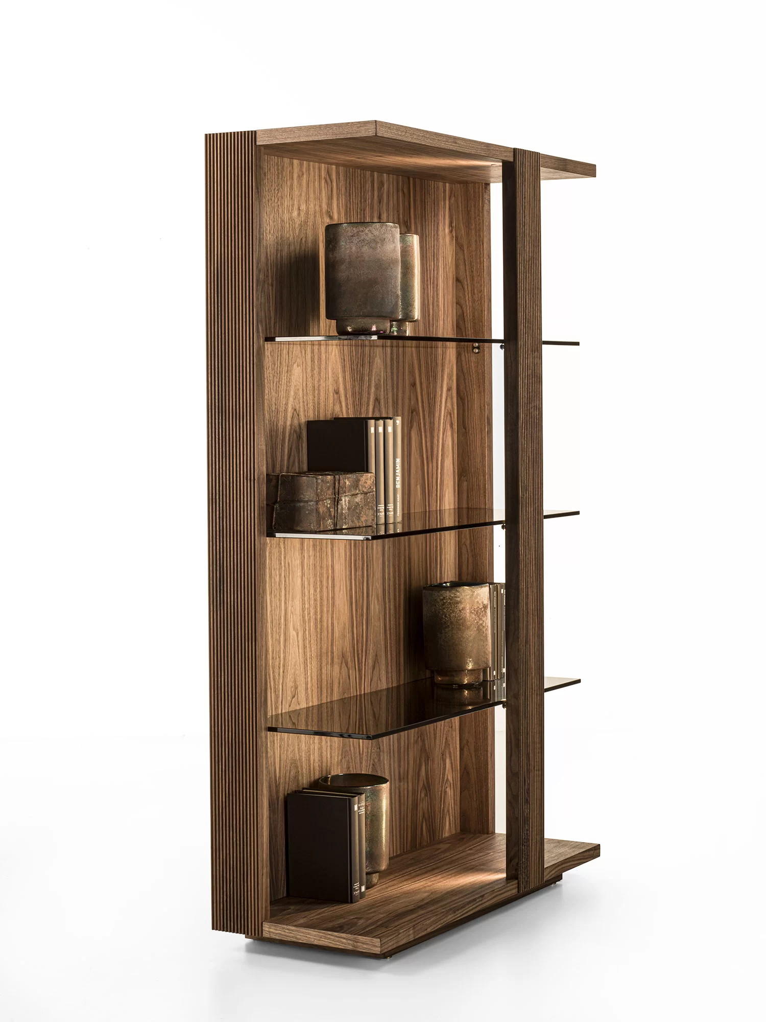 La collezione Revo viene completata da una credenza alta, a giorno, in legno massello e listellare, dotata di tre ripiani in vetro sp.10mm. Top e base in legno. Disponibile in due versioni: con schienale caratterizzato da una particolare lavorazione verticale, Fresart, che crea un effetto geometrico moderno e dinamico oppure con decorazione Fresart applicata sulle tre fascie verticale perimetrali strutturali. Illuminata con sistema di luci LED con accensione tramite telecomando.