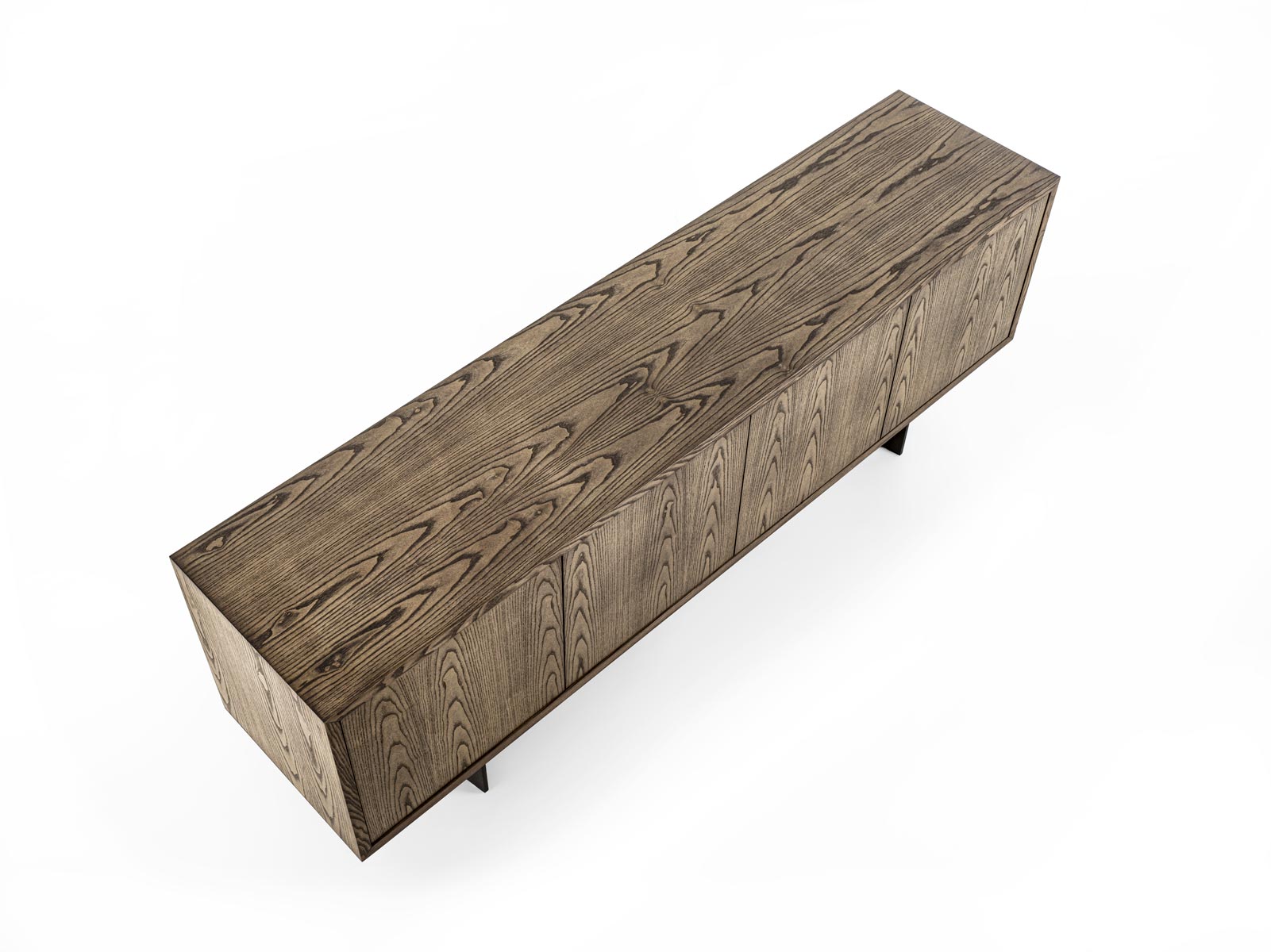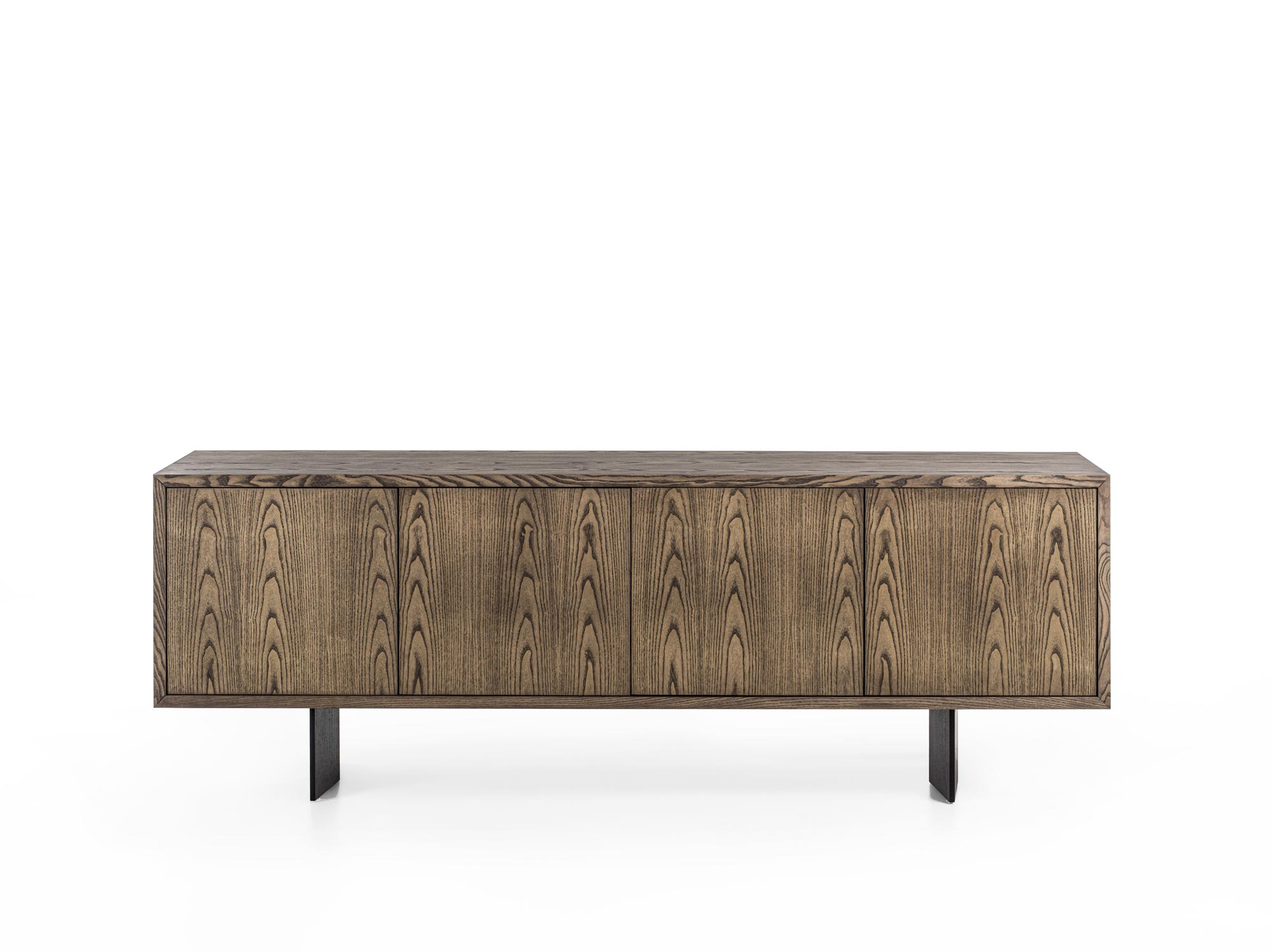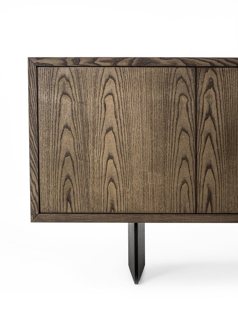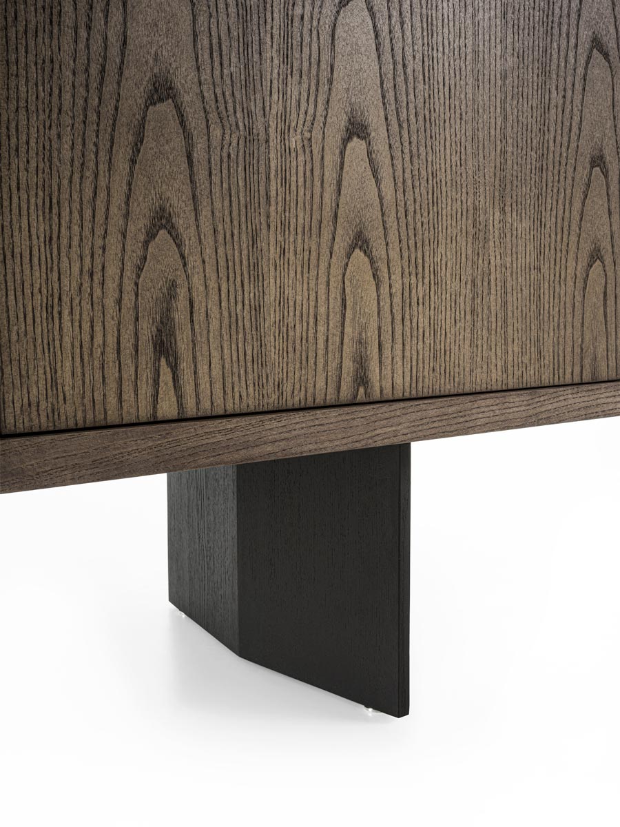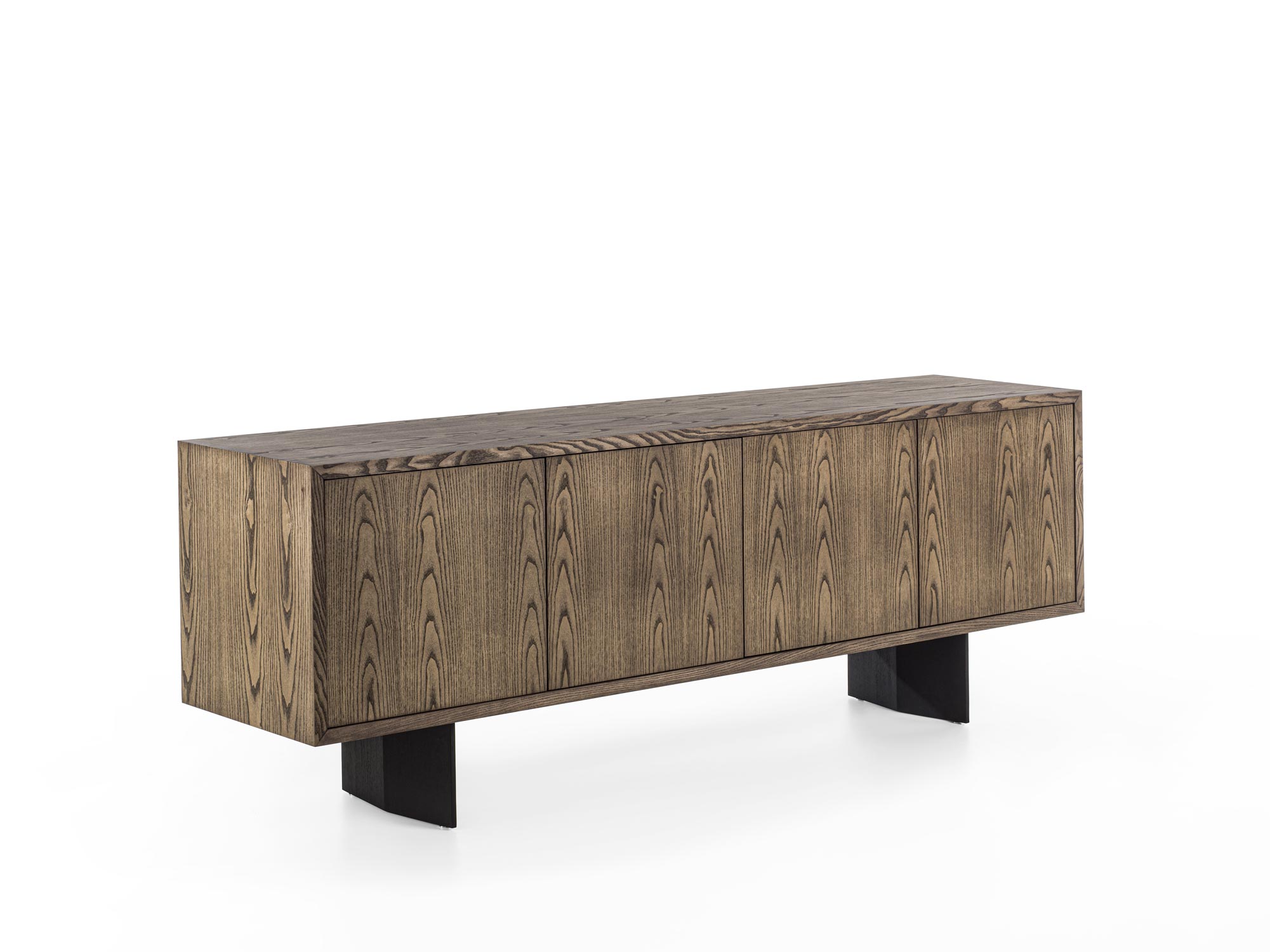 Credenza bassa in legno massello e multistrato, racchiusa da cornice in legno, caratterizzata da ante a battente con apertura push-pull. Il mobile è rialzato da terra mediante due gambe in legno massello pigmentato nero a forma di rombo.