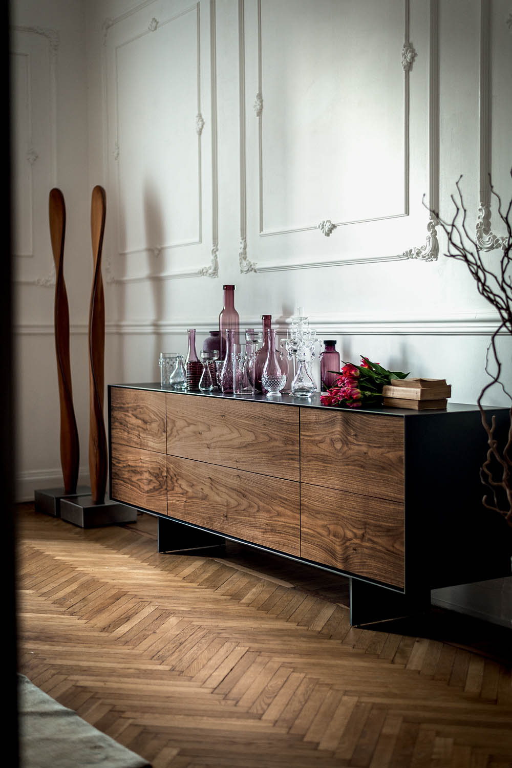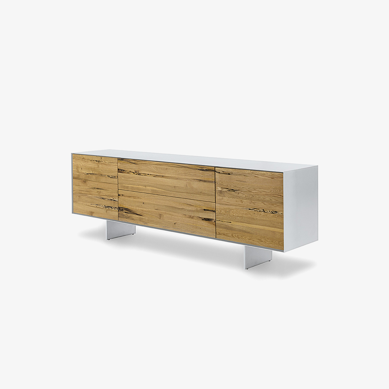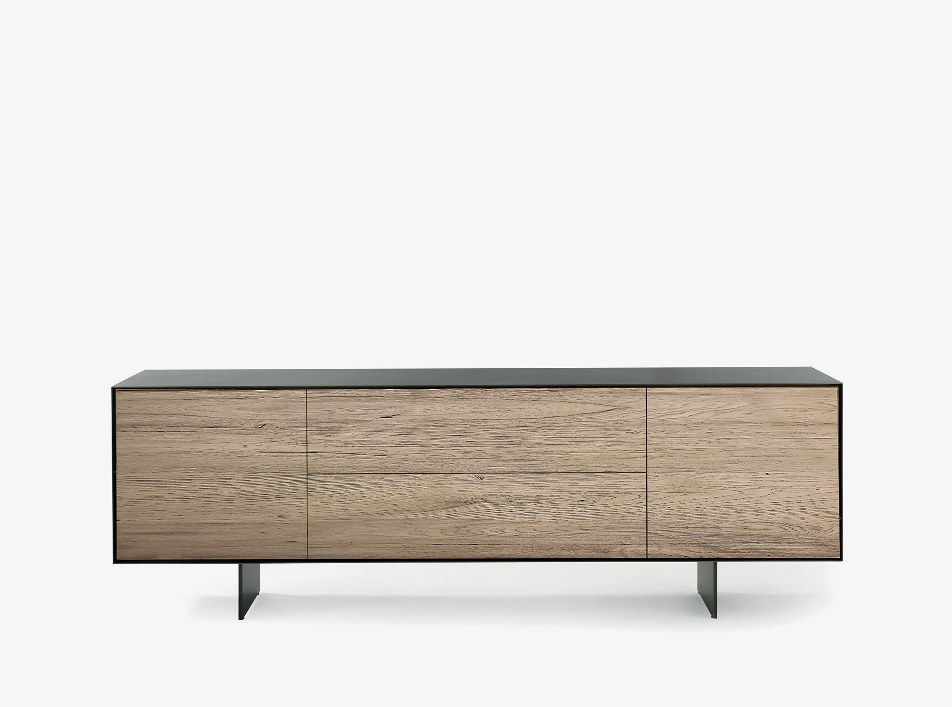 Credenza in legno massello e multistrato, racchiusa da cornice in ferro o legno, caratterizzata da cassetti assemblati con incastri a coda di rondine e ante. Due sottili gambe in ferro rialzano il mobile da terra.