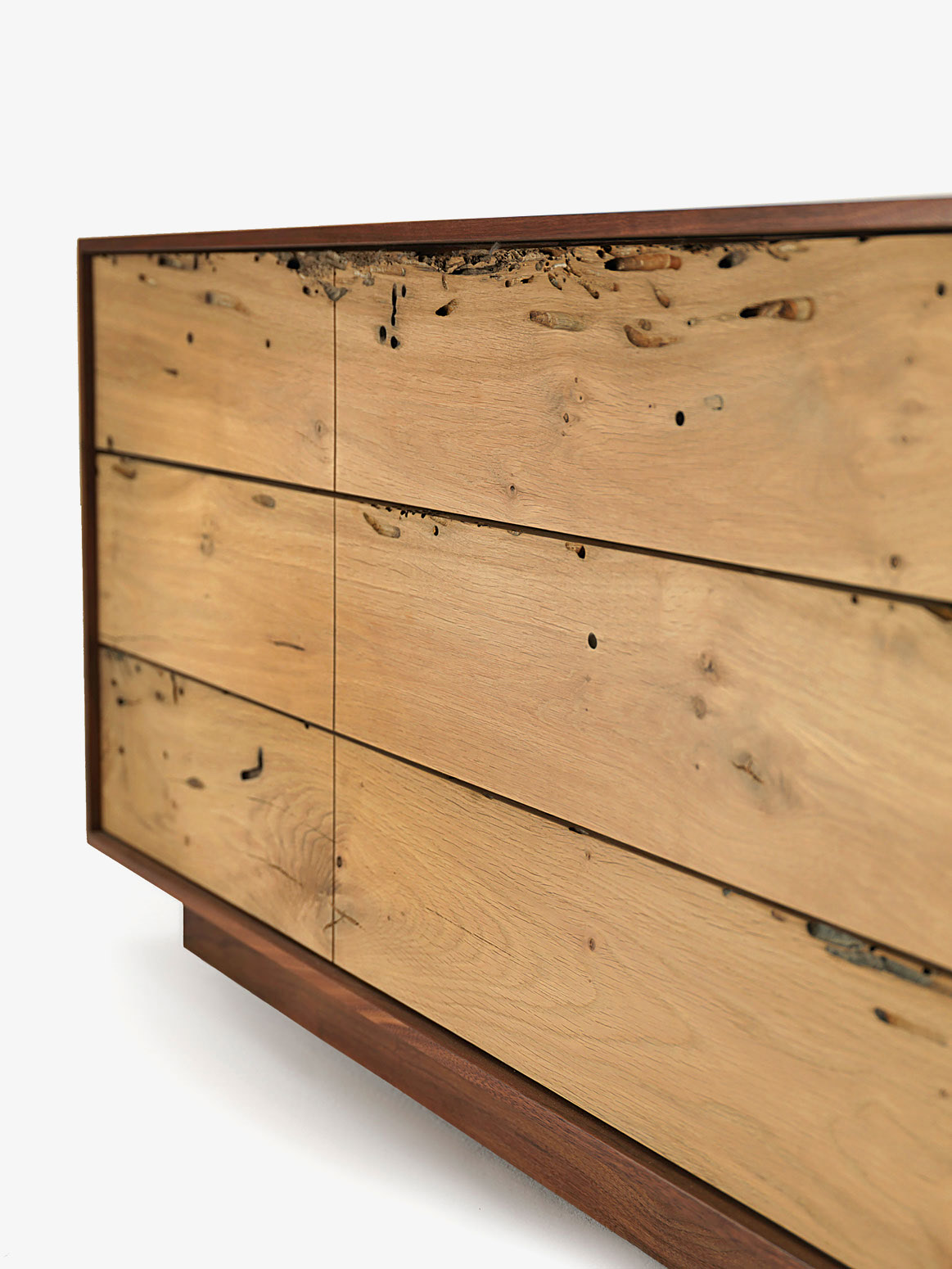 Credenza in legno massello e listellare, racchiusa da cornice in ferro o legno, caratterizzata da cassetti assemblati con incastri a coda di rondine.