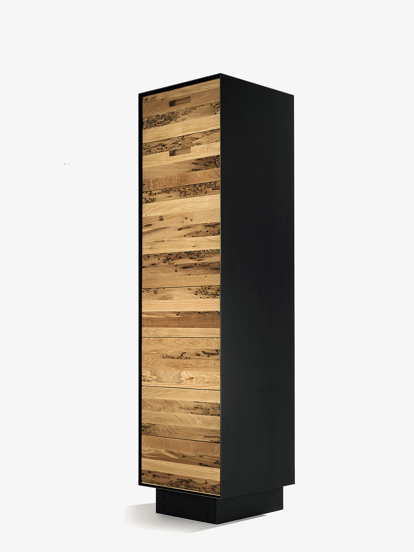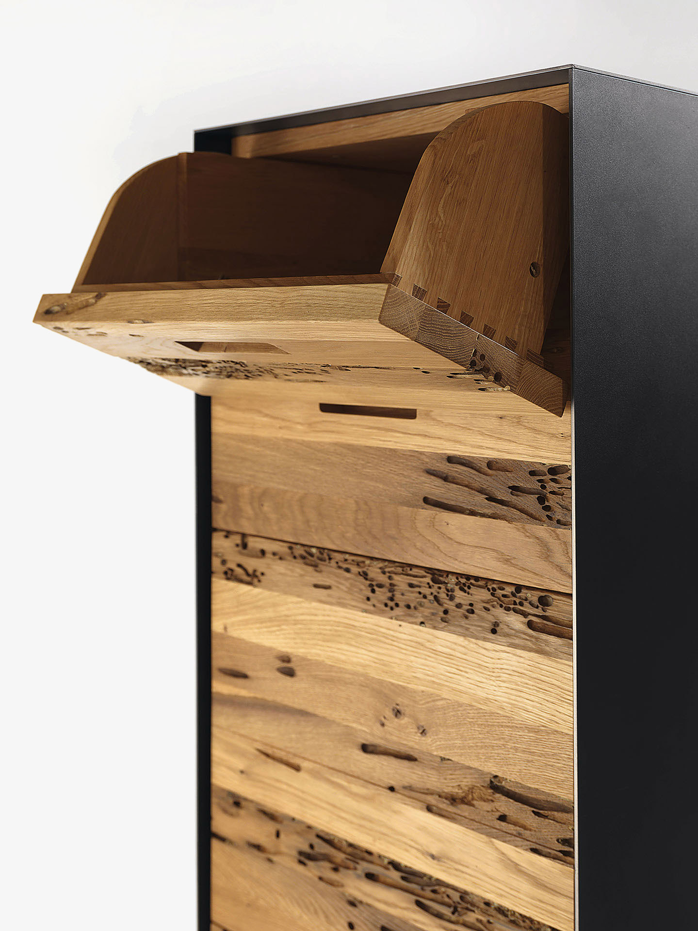 Cassettiera in legno massello e listellare, racchiusa da cornice in ferro o legno. Disponibile in due varianti, con anta a ribalta e/o cassetti assemblati con incastri a coda di rondine, di cui alcuni con scorrimento legno su legno e frontali a ribalta e altri su guide metalliche e dotati di sistema d’apertura push-pull.