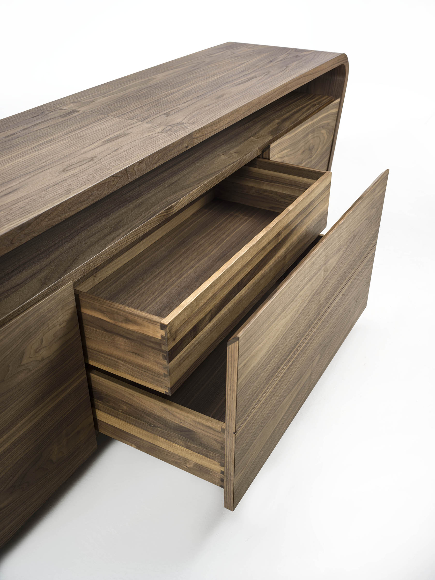 Credenza in legno massello e multistrato composta da due ante laterali e cassetti centrali, si contraddistingue per linee sinuose ed arrotondate. Posto sotto il top si trova un pratico e funzionale vano a giorno.