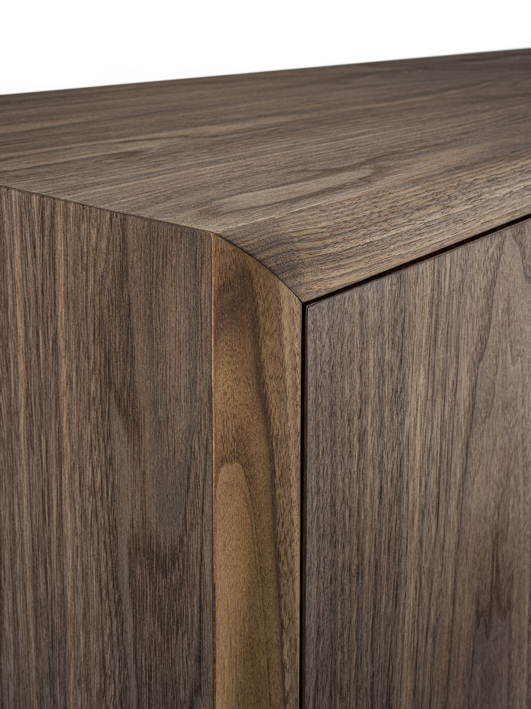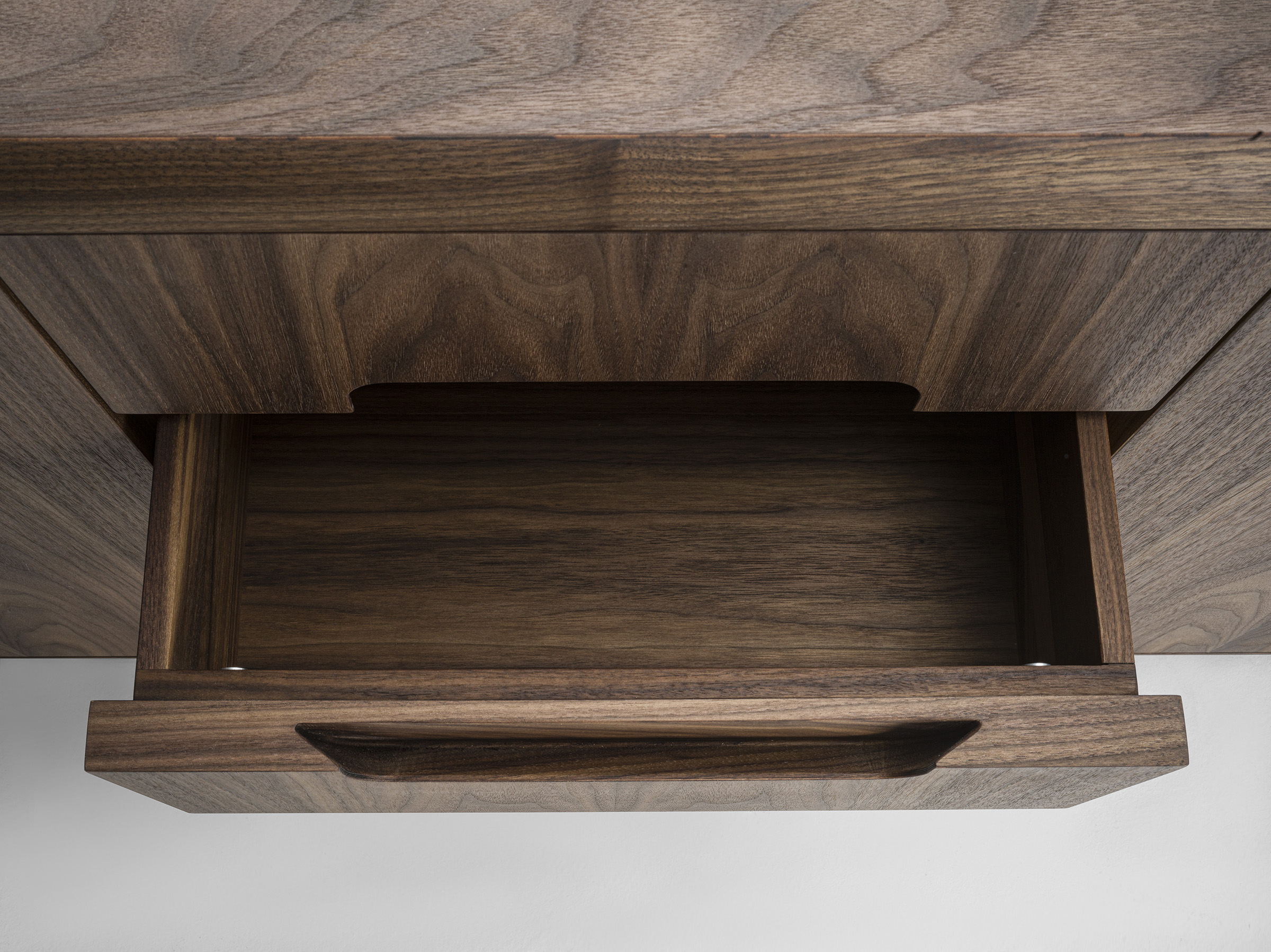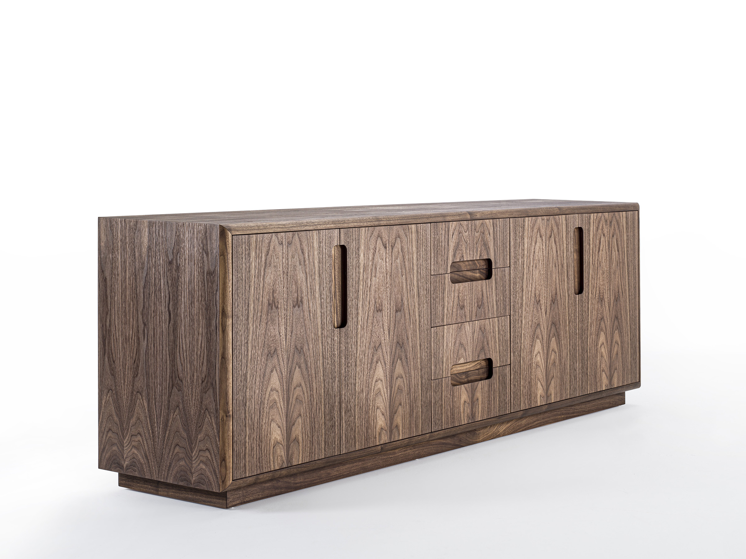 Credenza bassa in legno massello e listellare. Munita di quattro ante a battente e quattro cassetti con maniglia incassata e sagomata. Cassetti assemblati con incastri a coda di rondine. Struttura con bordi stondati.