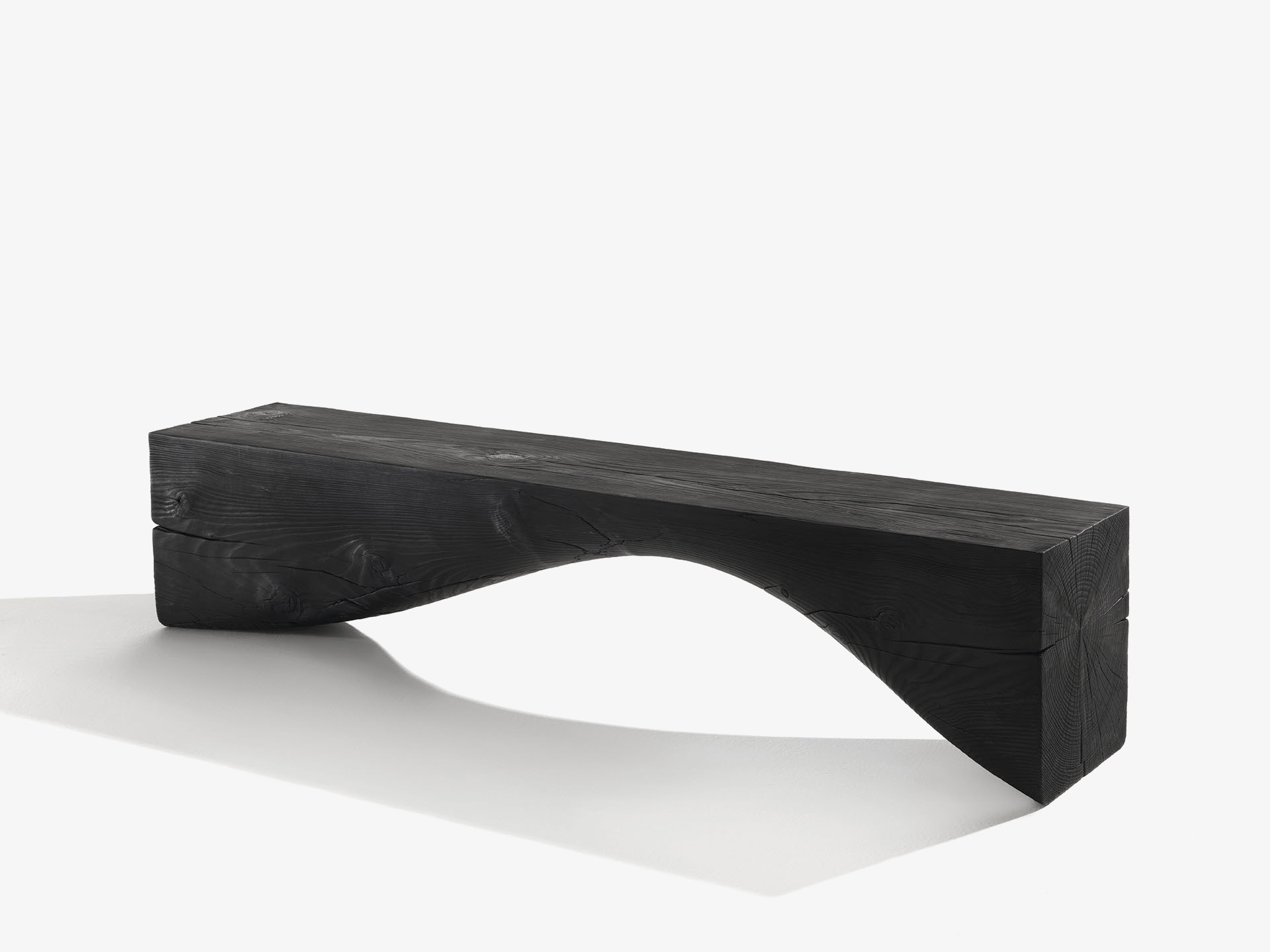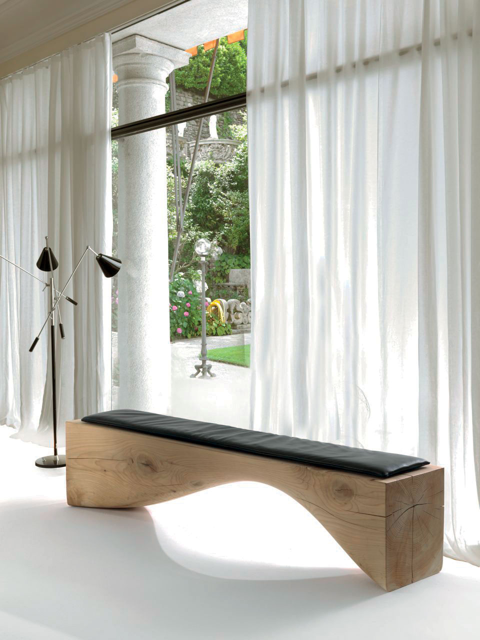 Panca in legno massello di cedro profumato lavorato da un blocco unico, caratterizzata dalla forma arcuata al di sotto del piano di seduta che esalta le venature e le sfumature del cedro naturale.