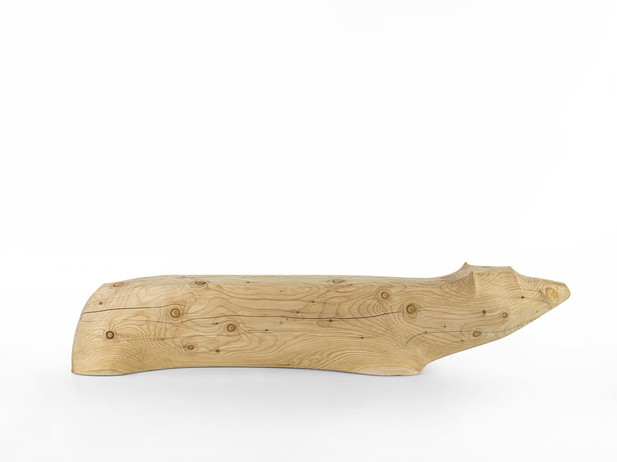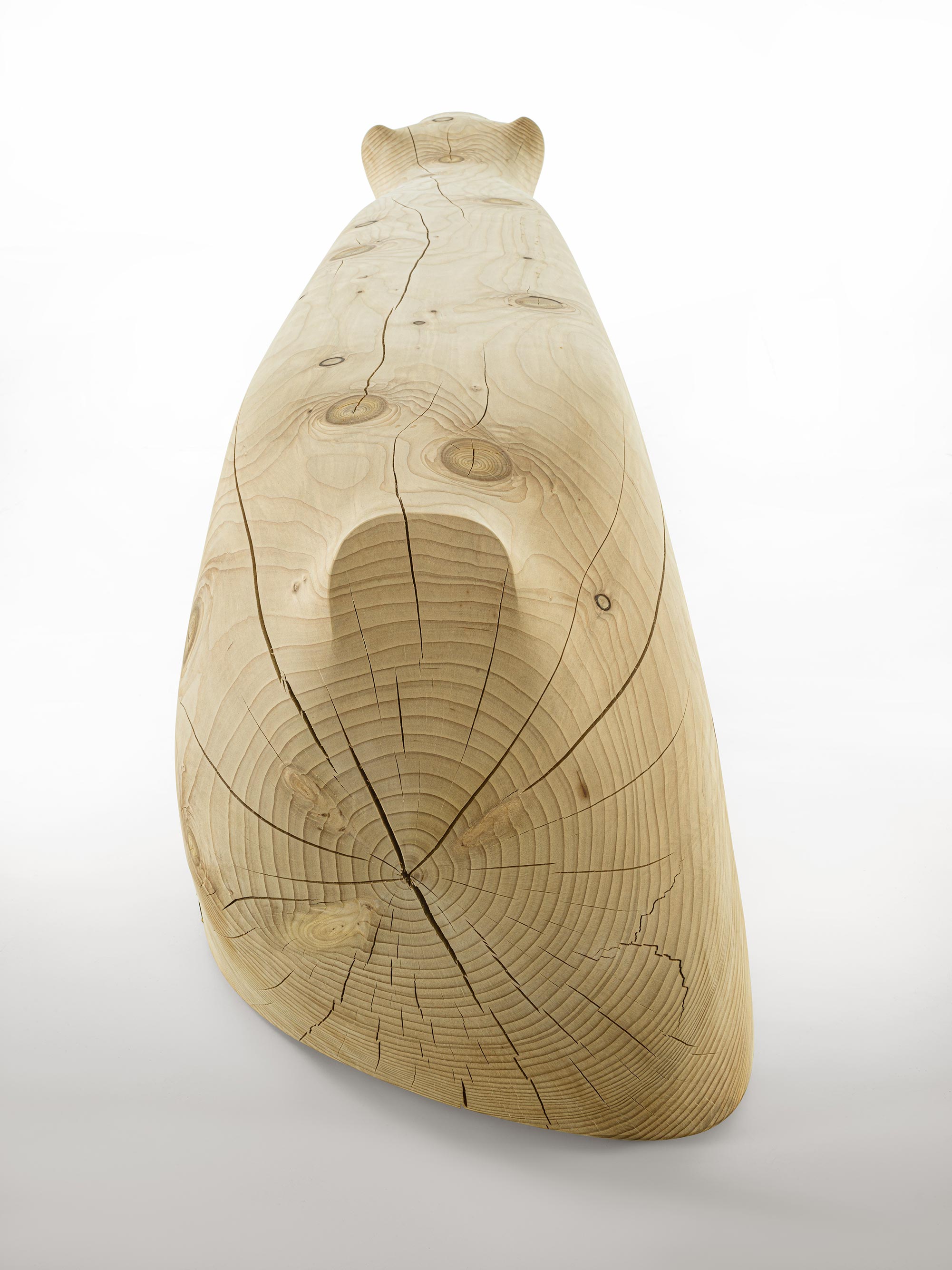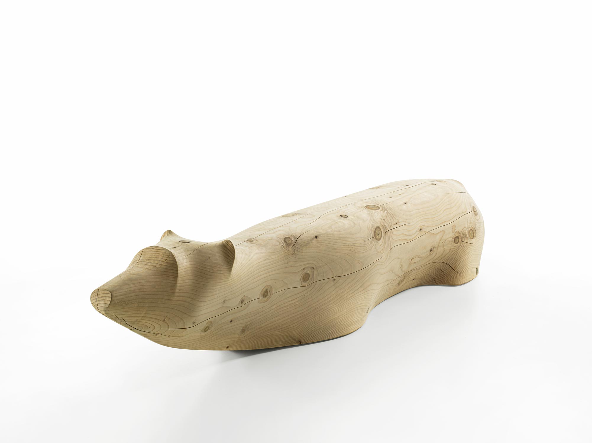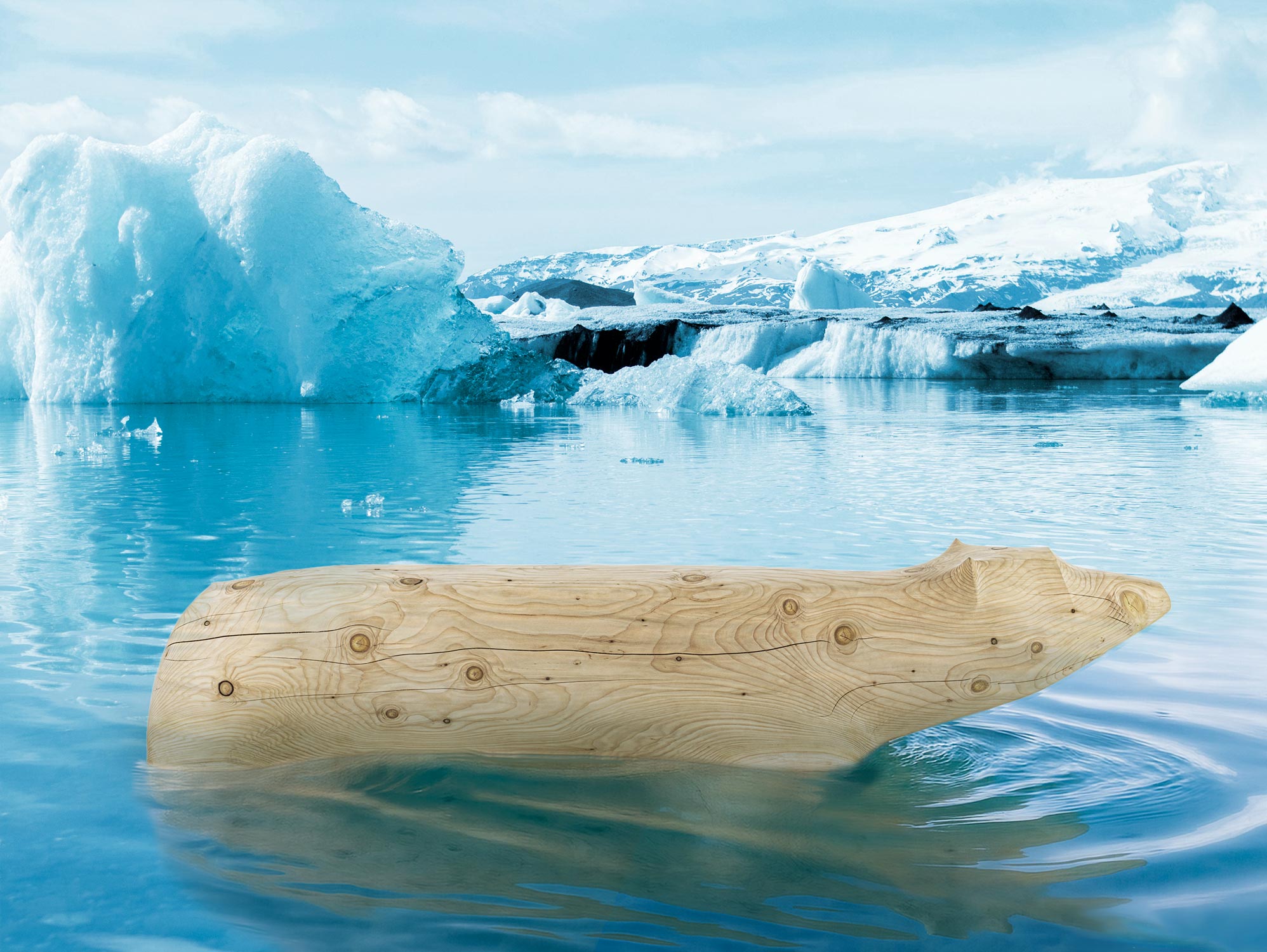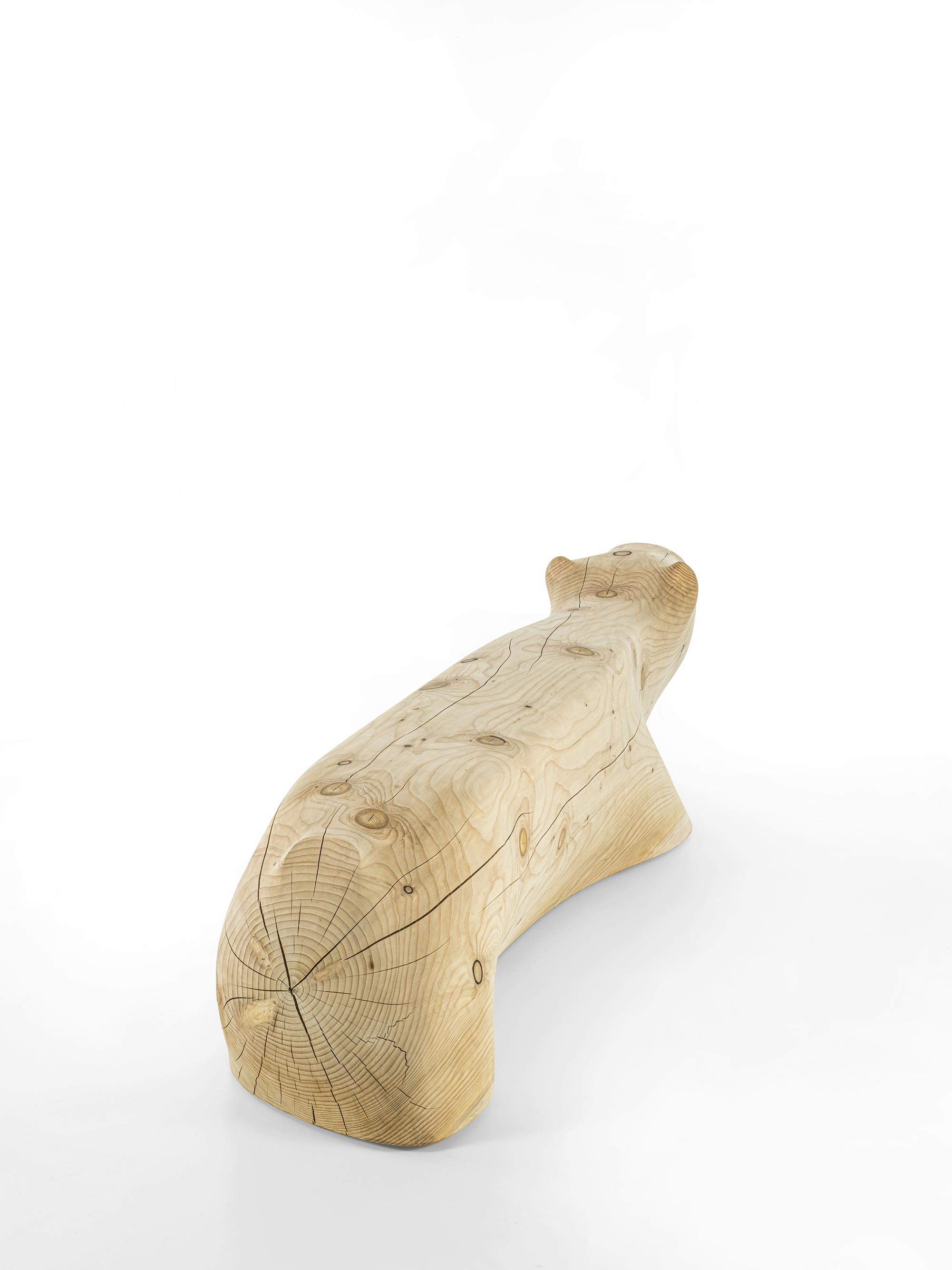Panca in legno massello di cedro profumato, lavorata da un unico blocco. Il design si ispira alla figura di un orso polare immerso per metà nell’acqua, metafora visiva del cambiamento climatico e delle sue conseguenze.