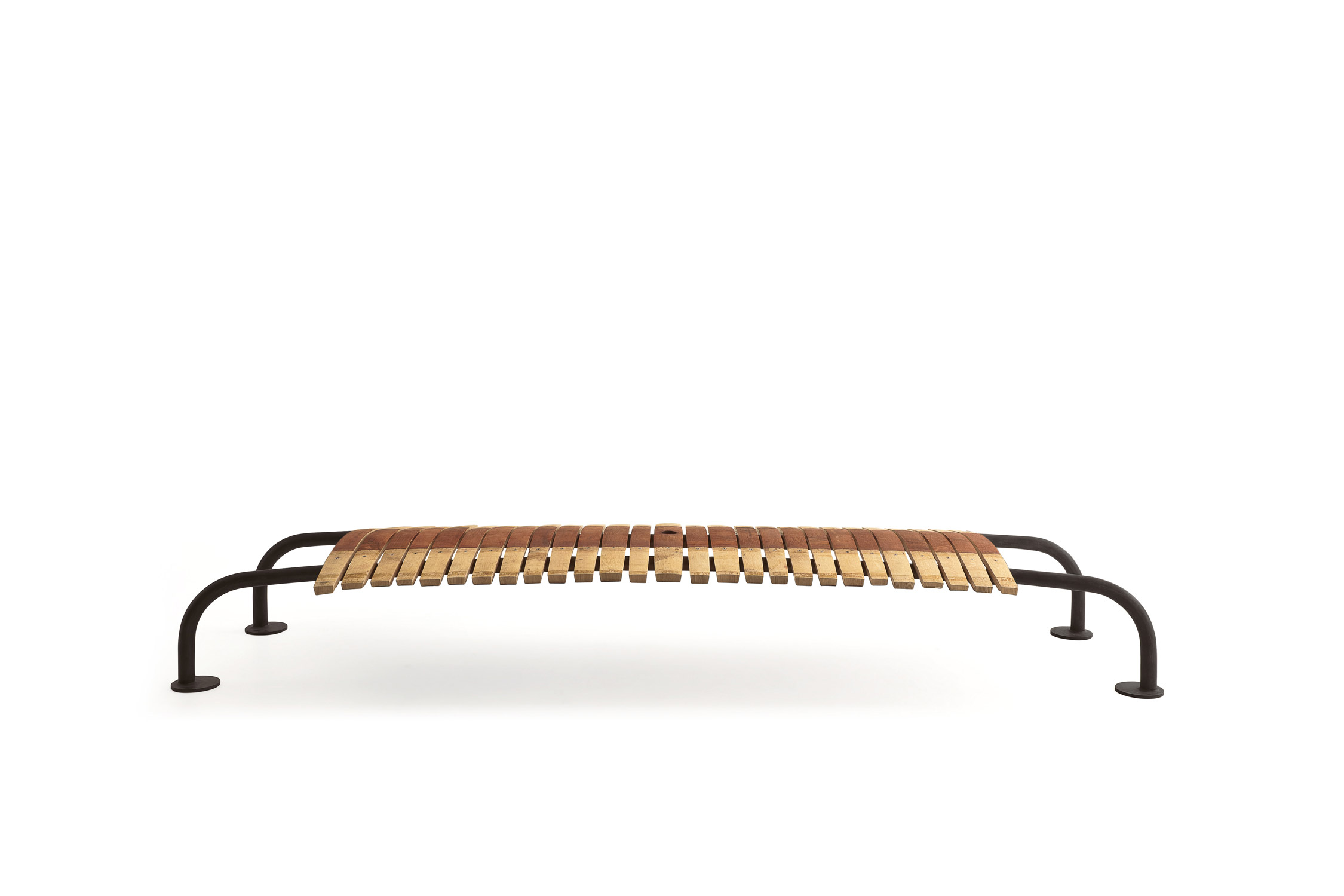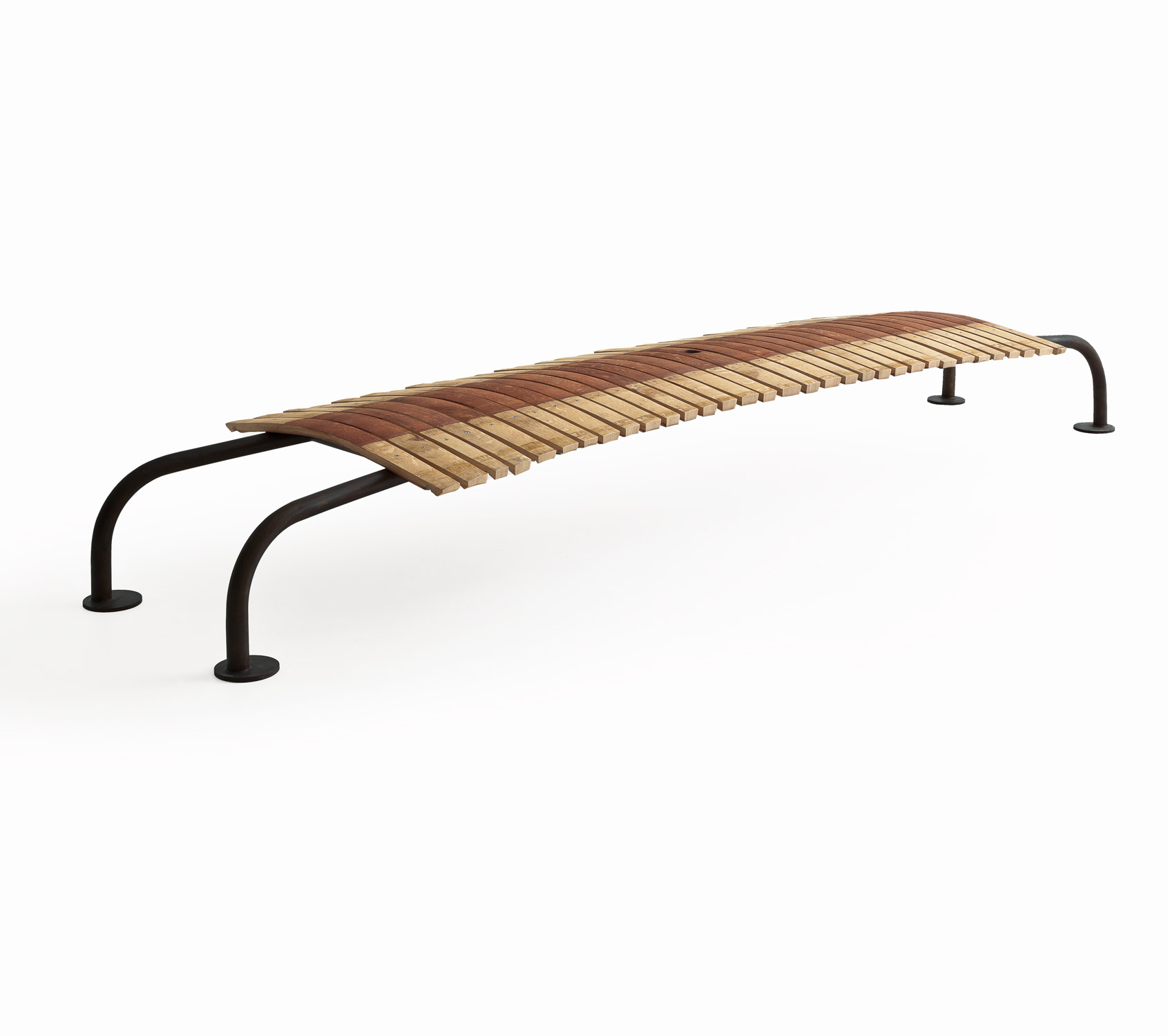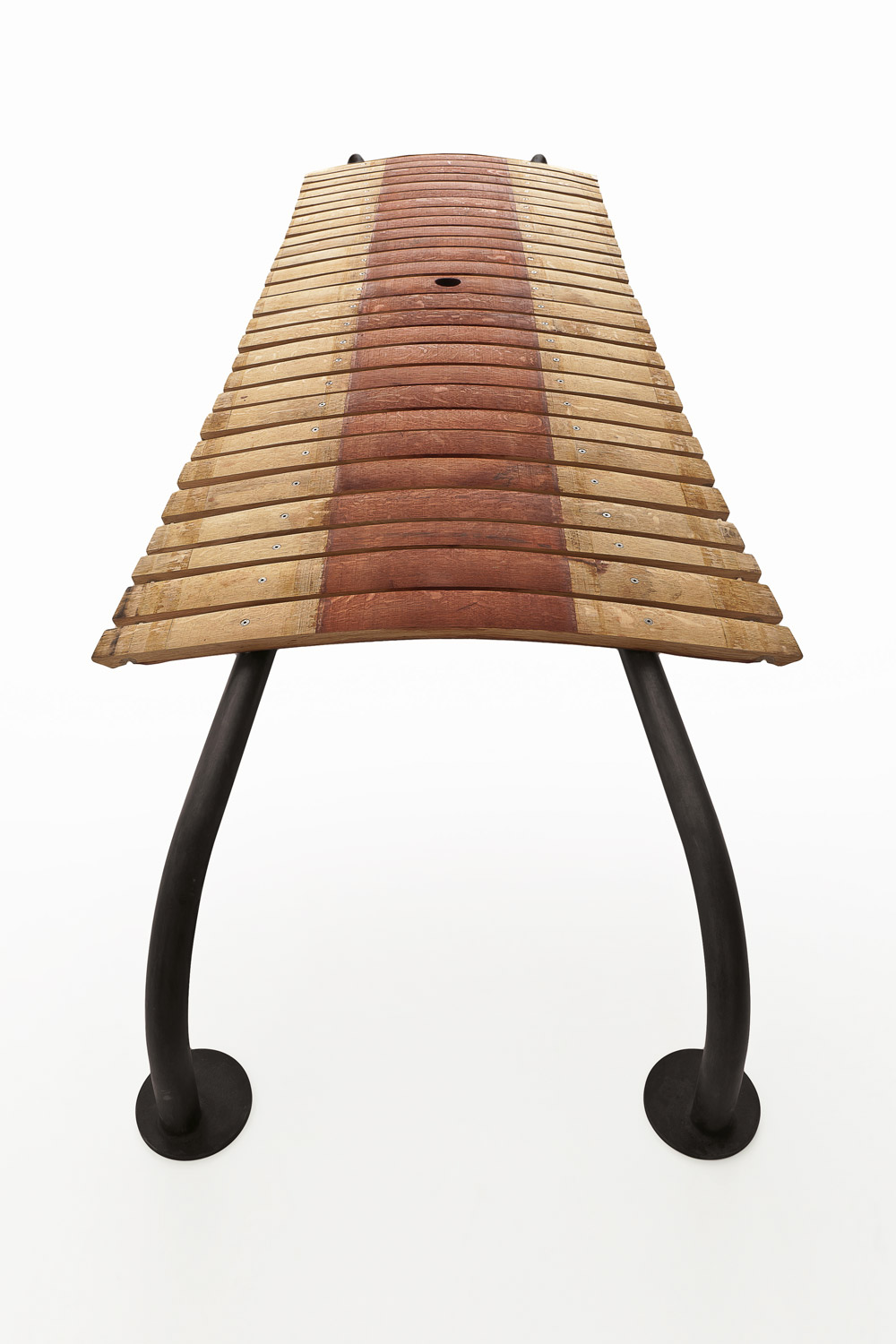 Panca in legno realizzata dall’accostamento delle doghe, in legno di rovere, provenienti dalle Barrique. Base curvilinea in ferro.