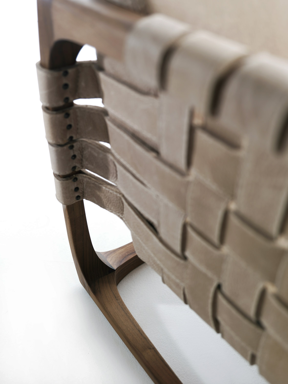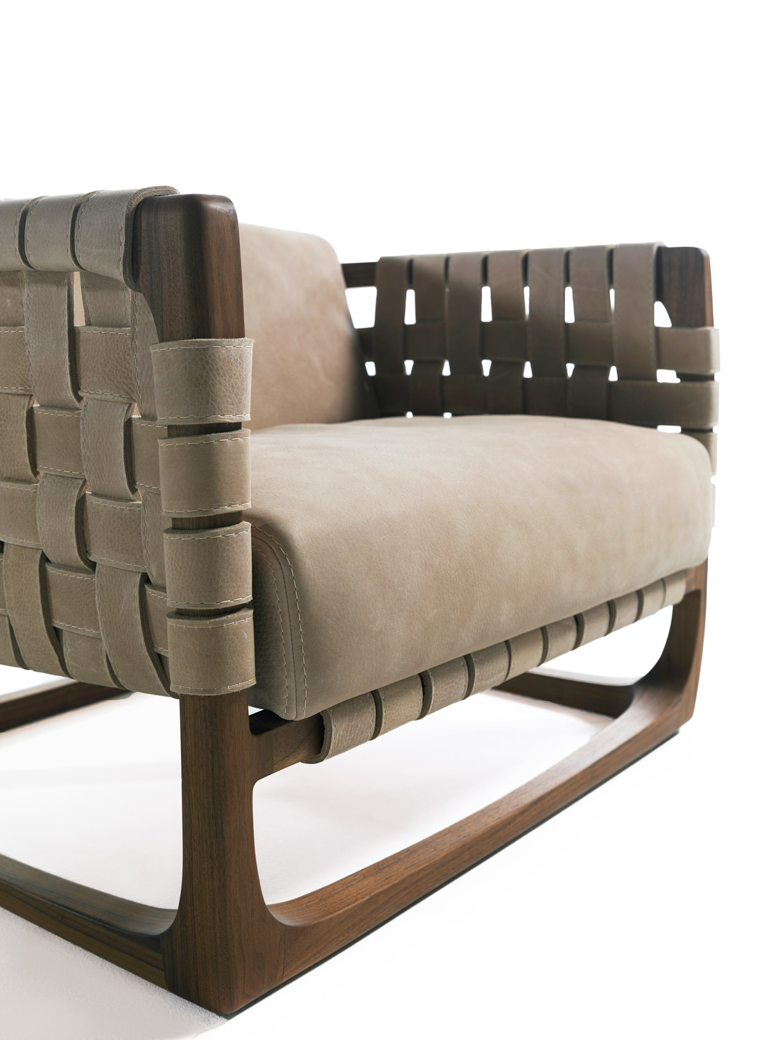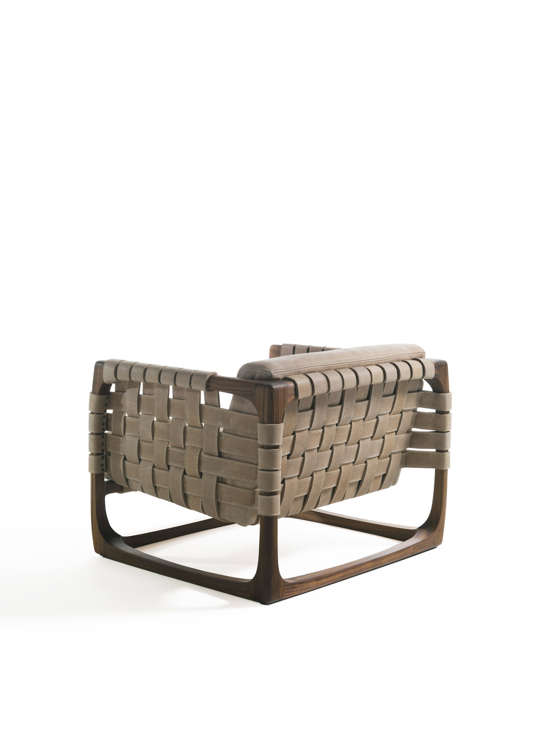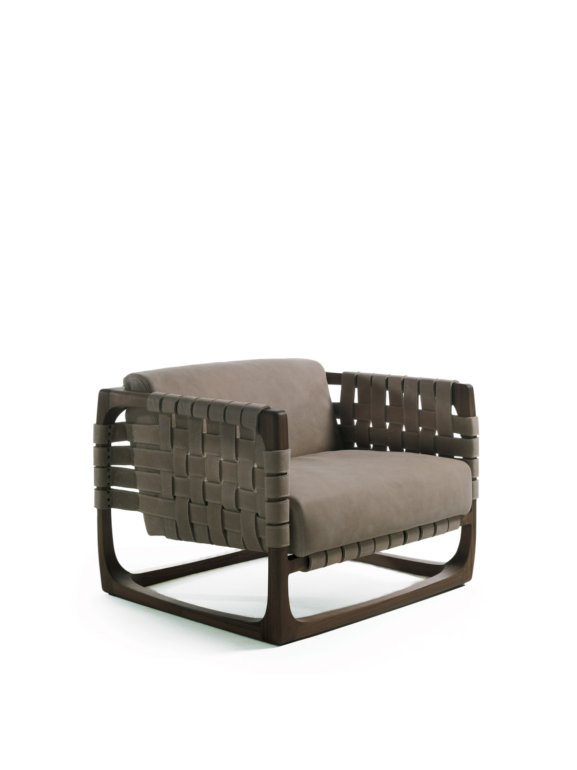 Poltrona imbottita con struttura realizzata in legno massello completamente tornita, assemblata e levigata a mano. Un intreccio di stringhe di pelle o tessuto caratterizza la seduta, lo schienale e i braccioli. Nella versione in tessuto previsto rinforzo strutturale all'interno del rivestimento.