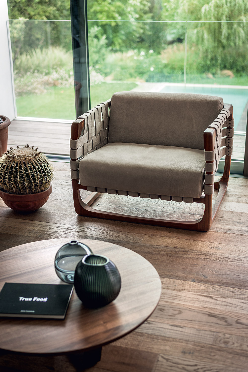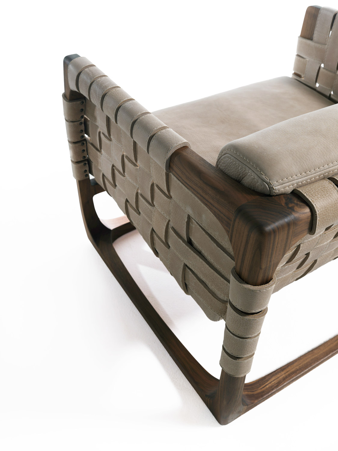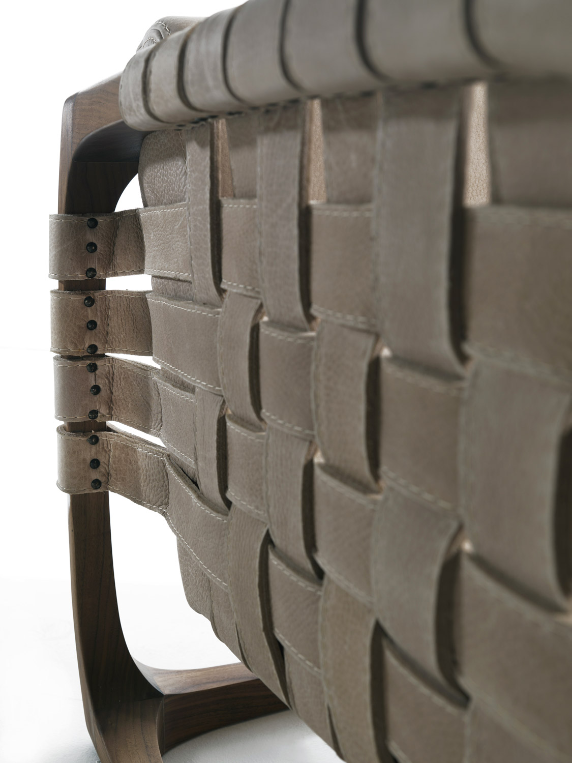 Poltrona imbottita con struttura realizzata in legno massello completamente tornita, assemblata e levigata a mano. Un intreccio di stringhe di pelle o tessuto caratterizza la seduta, lo schienale e i braccioli. Nella versione in tessuto previsto rinforzo strutturale all'interno del rivestimento.