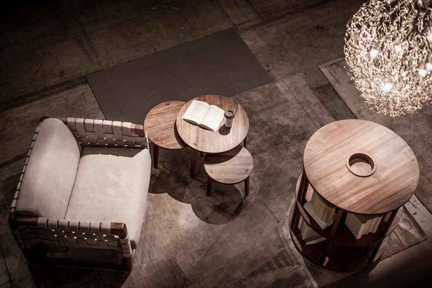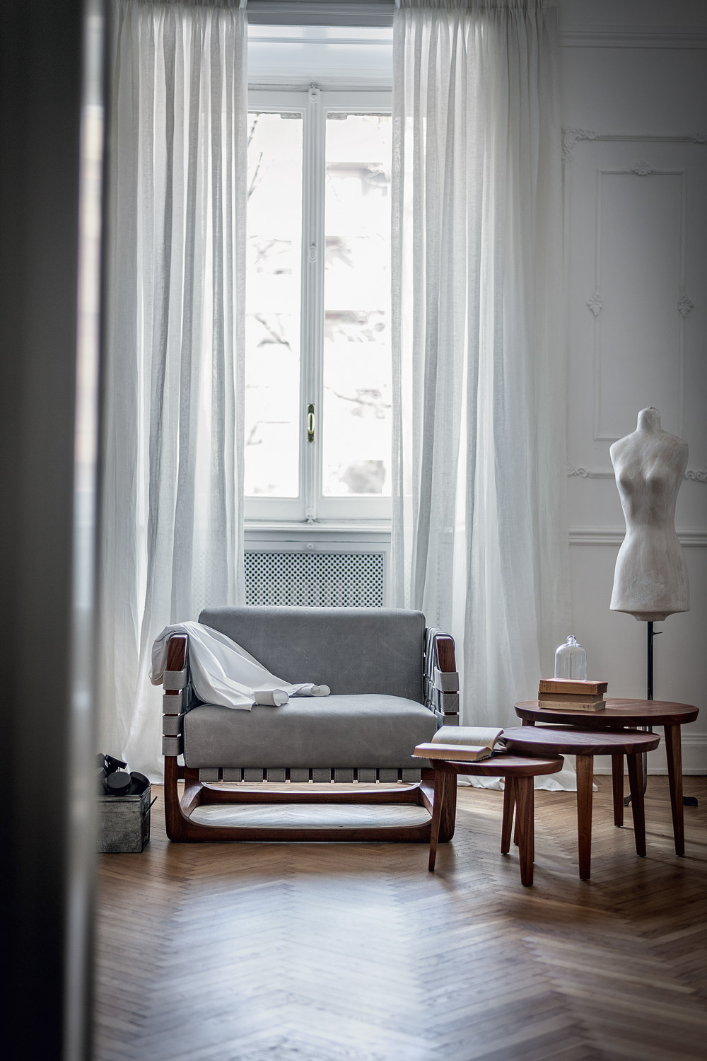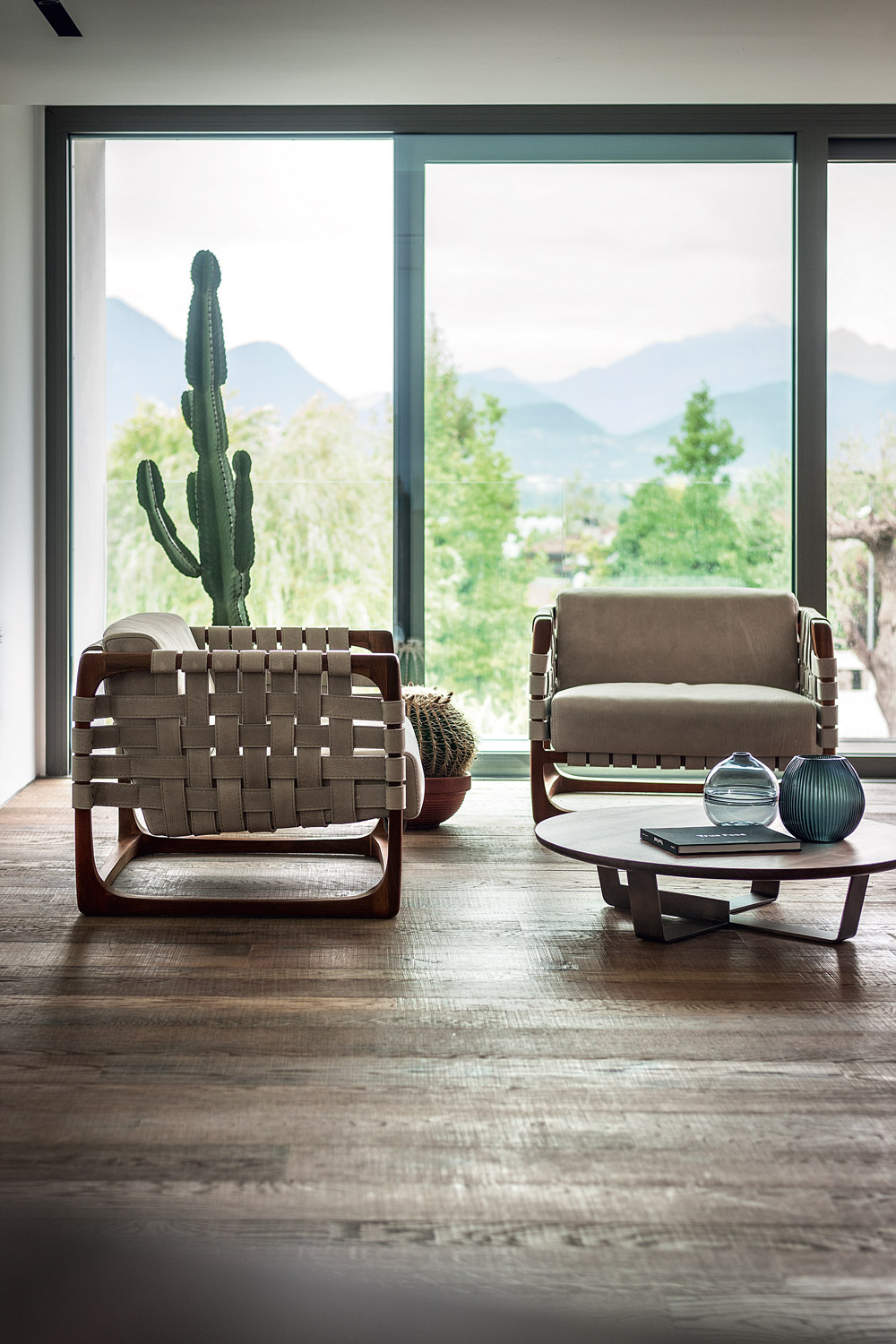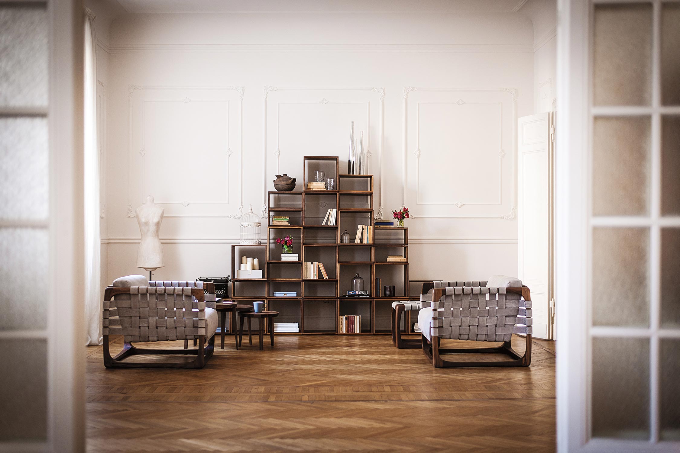 Poltrona imbottita con struttura realizzata in legno massello completamente tornita, assemblata e levigata a mano. Un intreccio di stringhe di pelle o tessuto caratterizza la seduta, lo schienale e i braccioli. Nella versione in tessuto previsto rinforzo strutturale all'interno del rivestimento.