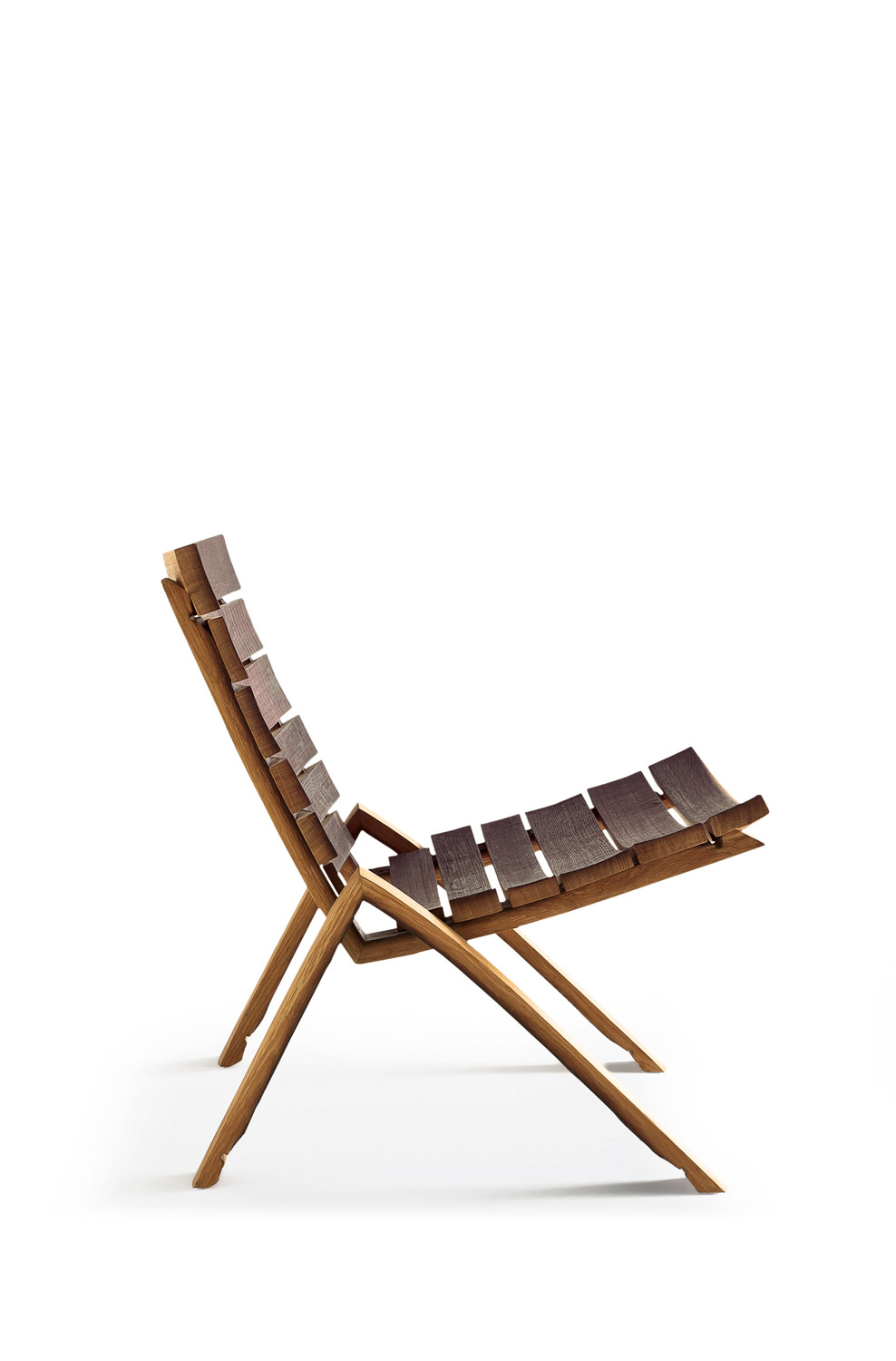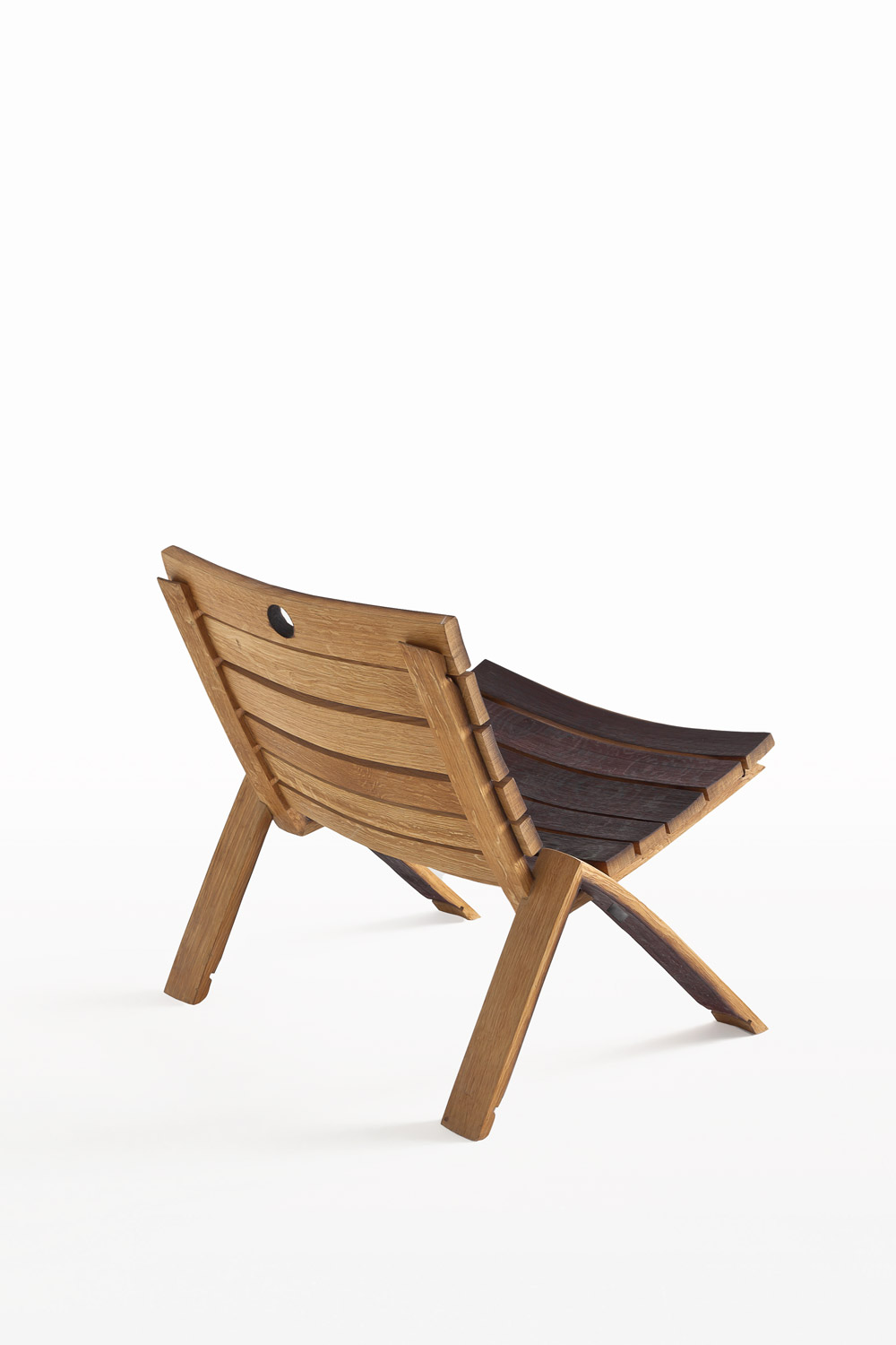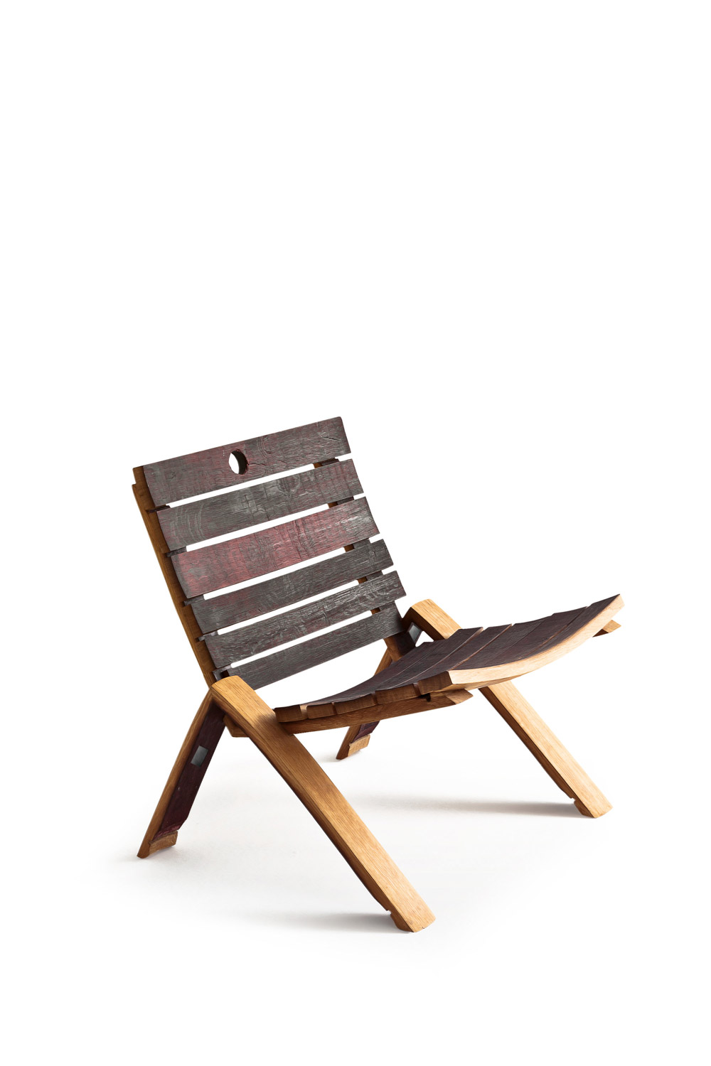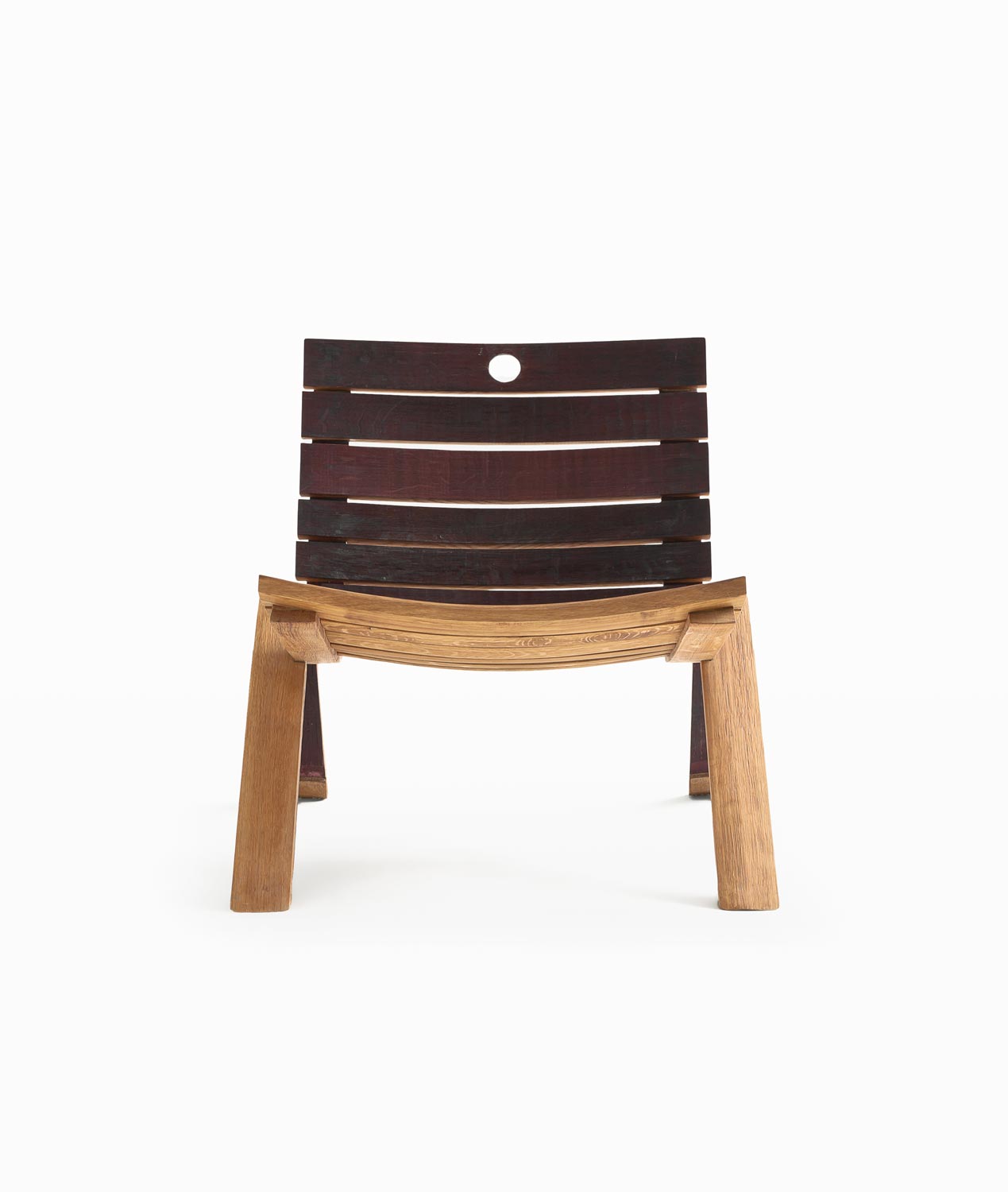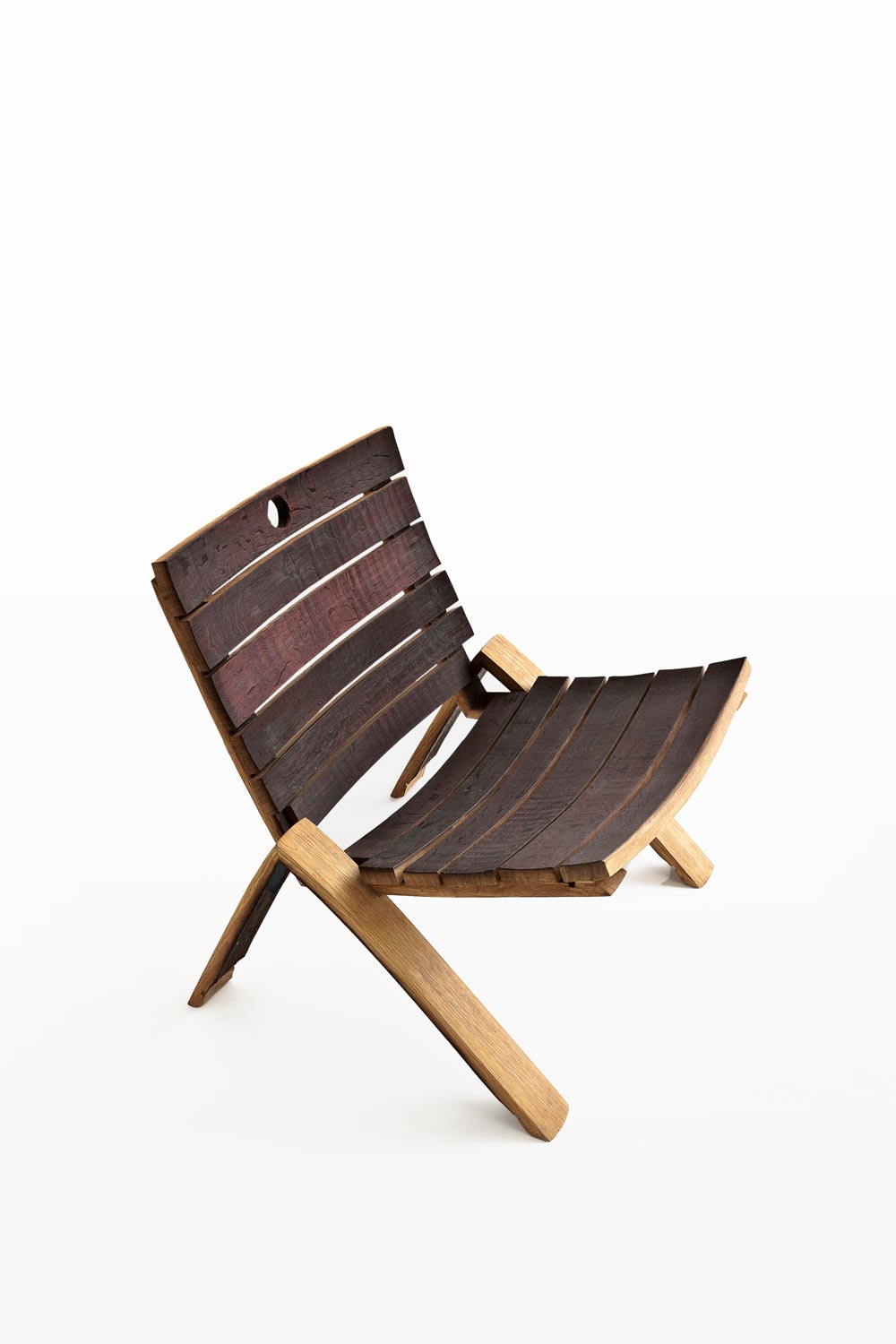 Poltrona realizzata interamente con doghe, in rovere, provenienti dalle Barrique, accostate. Si caratterizza da un basamento a forma di “V” rovesciata ottenuto dall’unione di due doghe per parte.