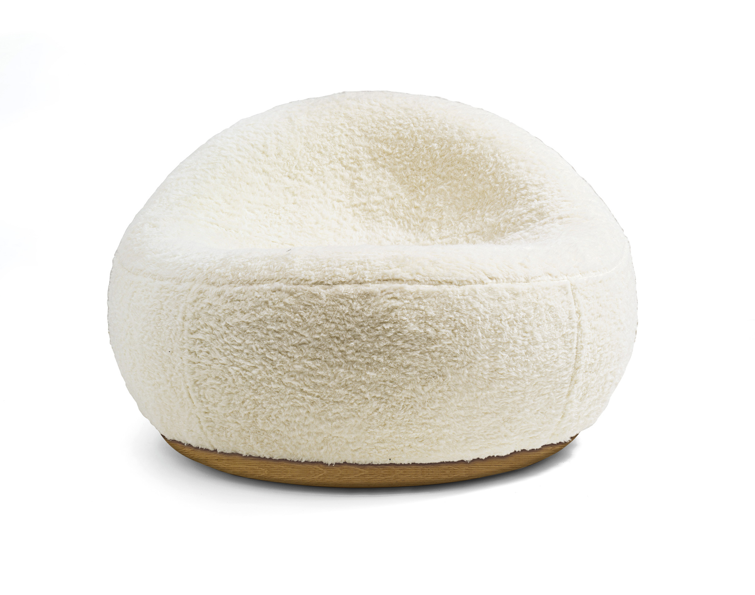 Poltrona con scocca in legno multistrato imbottita e rivestita in pelle o tessuto. Provvista di basamento girevole integrato. Il diametro maggiore rispetto alla versione in legno ne garantisce un maggiore comfort.