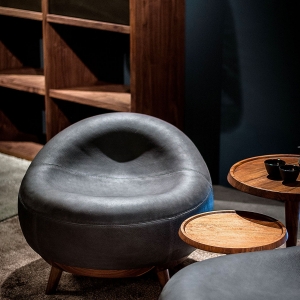Poltrona con scocca in legno multistrato imbottita e rivestita in pelle con cuciture a vista che seguono un disegno geometrico regolare. Provvista di basamento e piedi in appoggio in legno massello.