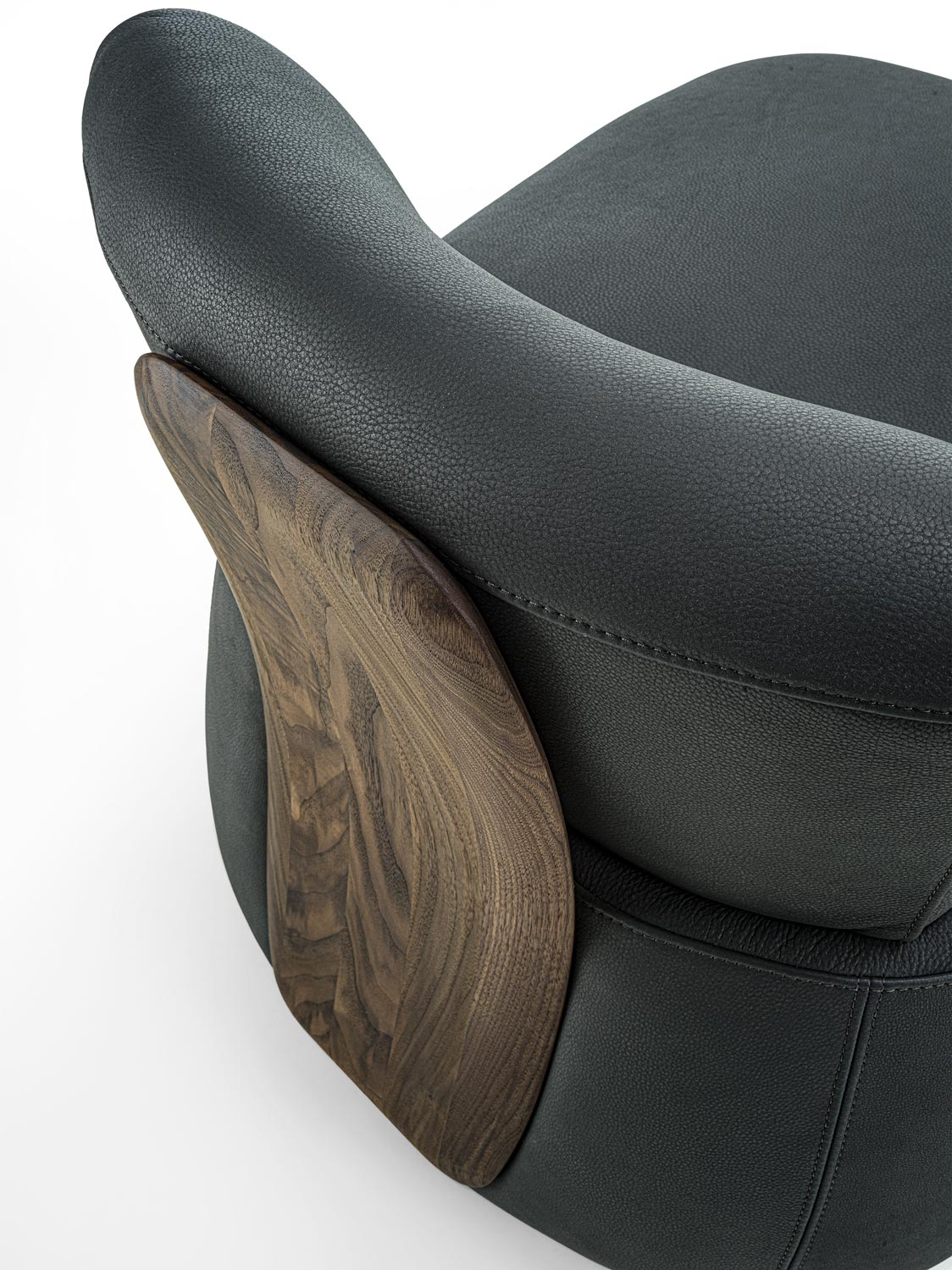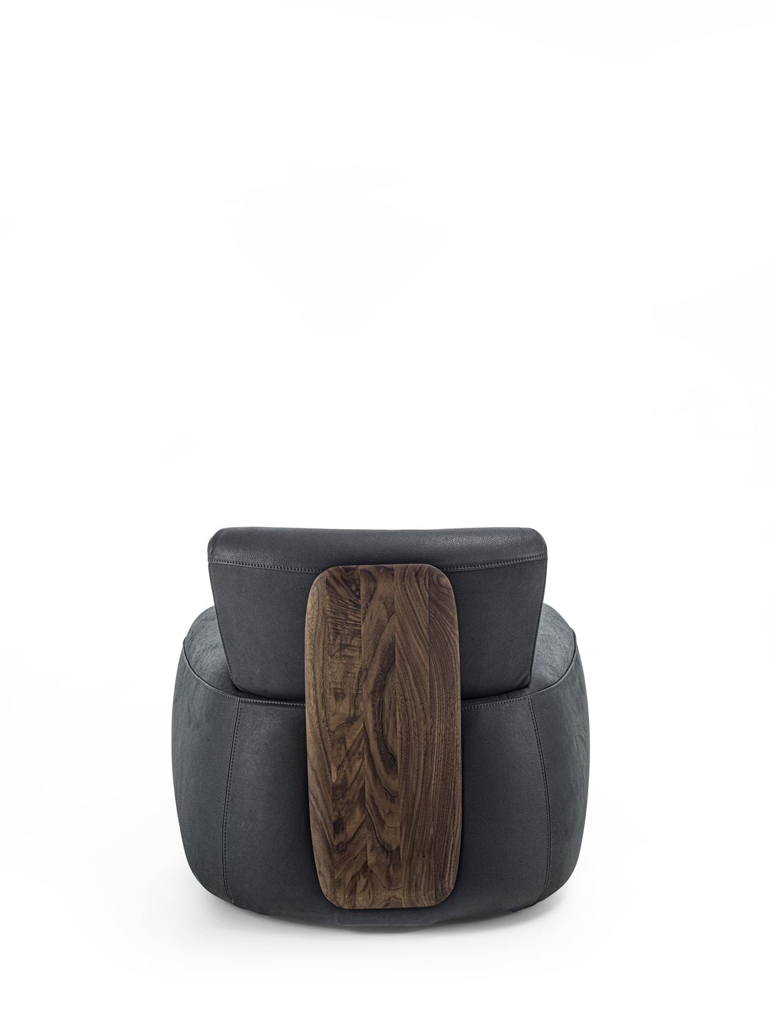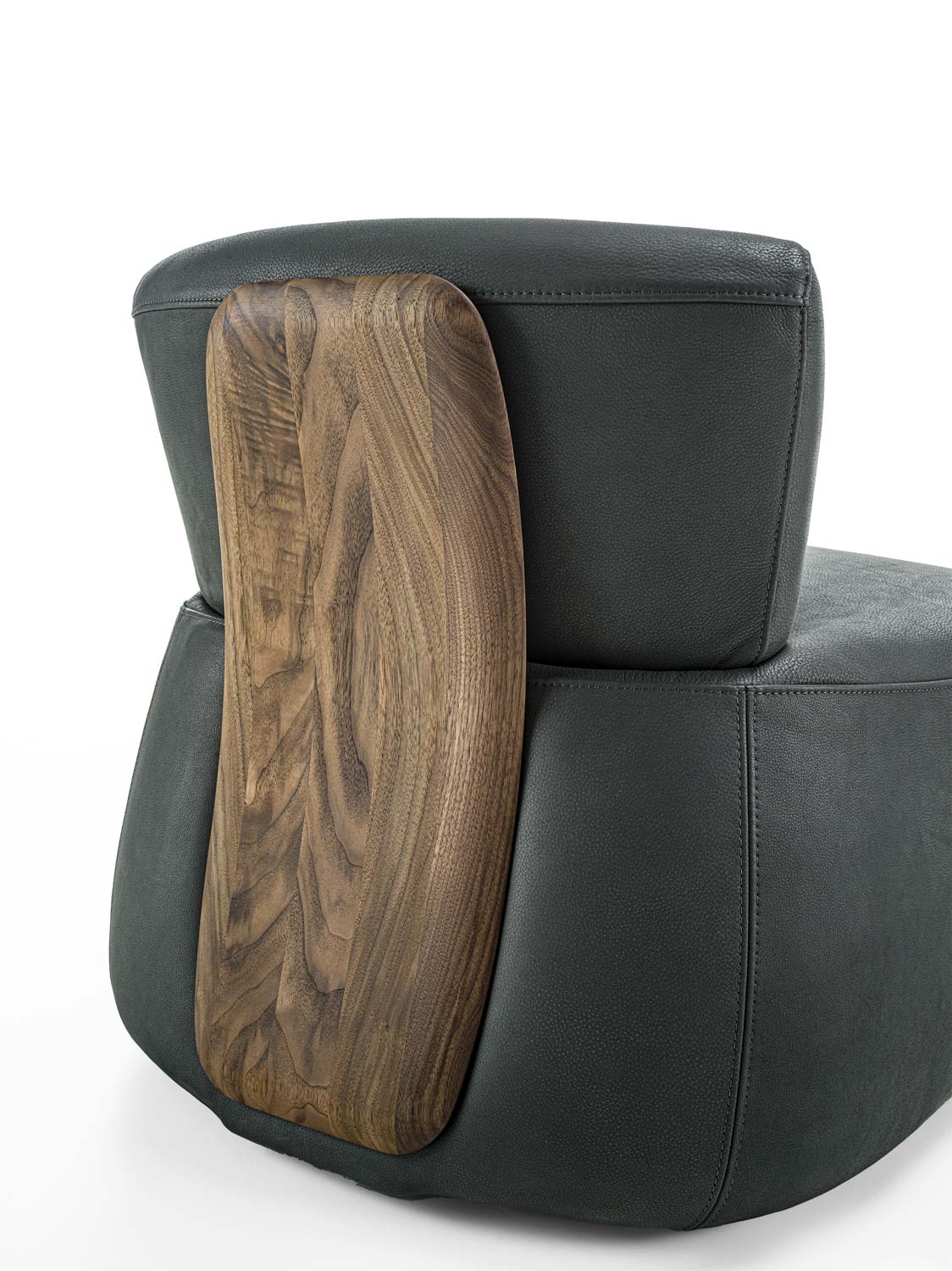 Poltrona imbottita con rivestimento in tessuto o pelle, caratterizzata da un distintivo schienale in legno massello che funge sia da elemento strutturale che decorativo. La solida e sinuosa struttura in legno collega lo schienale alla seduta, creando un dialogo visivo e funzionale tra i due volumi imbottiti. Il design esplora il contrasto tra la morbidezza accogliente della seduta e dello schienale imbottiti e la forza materica del legno.