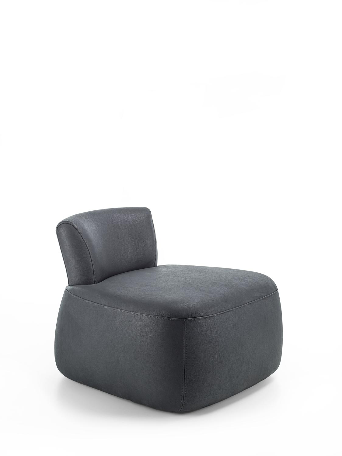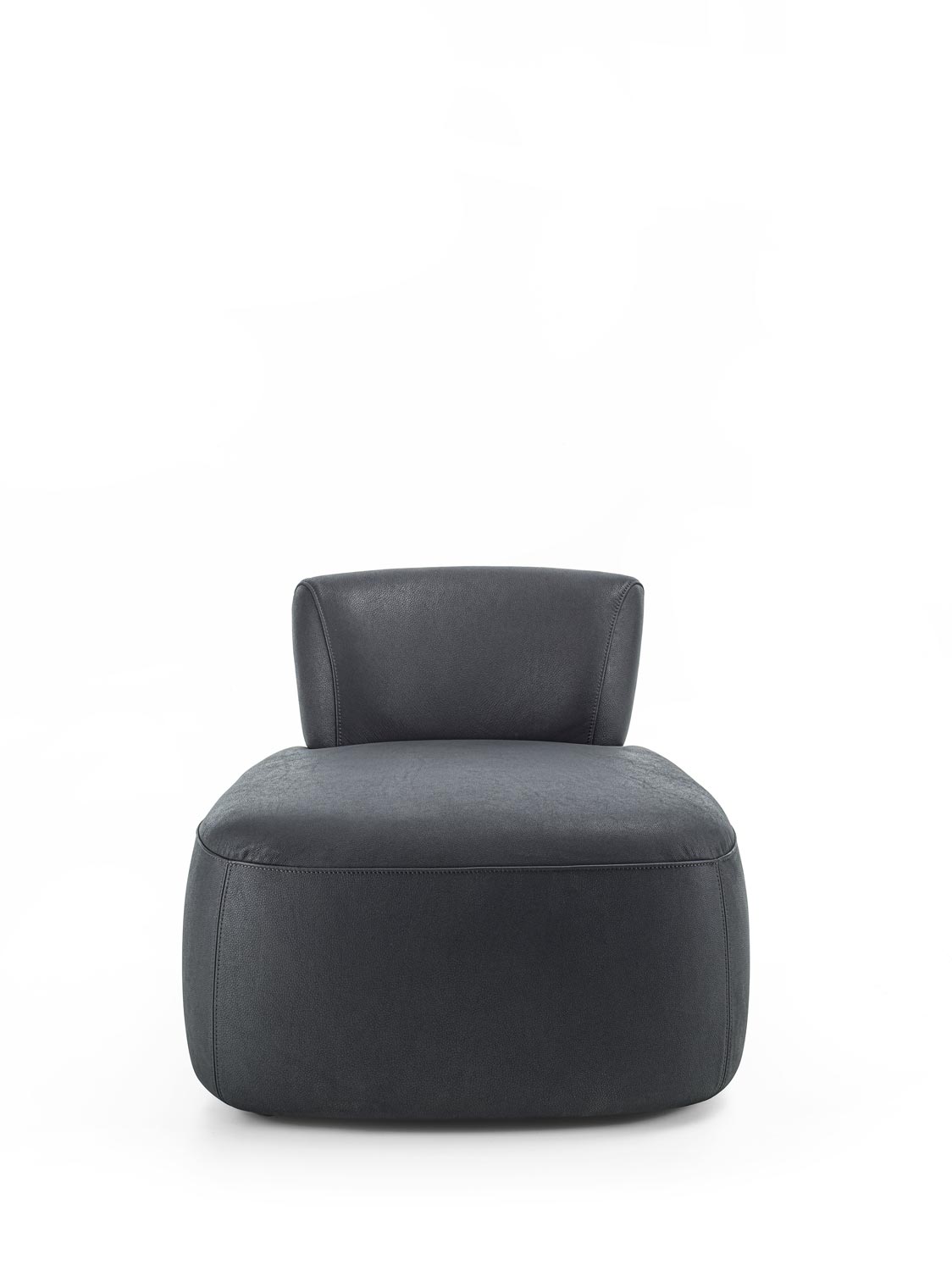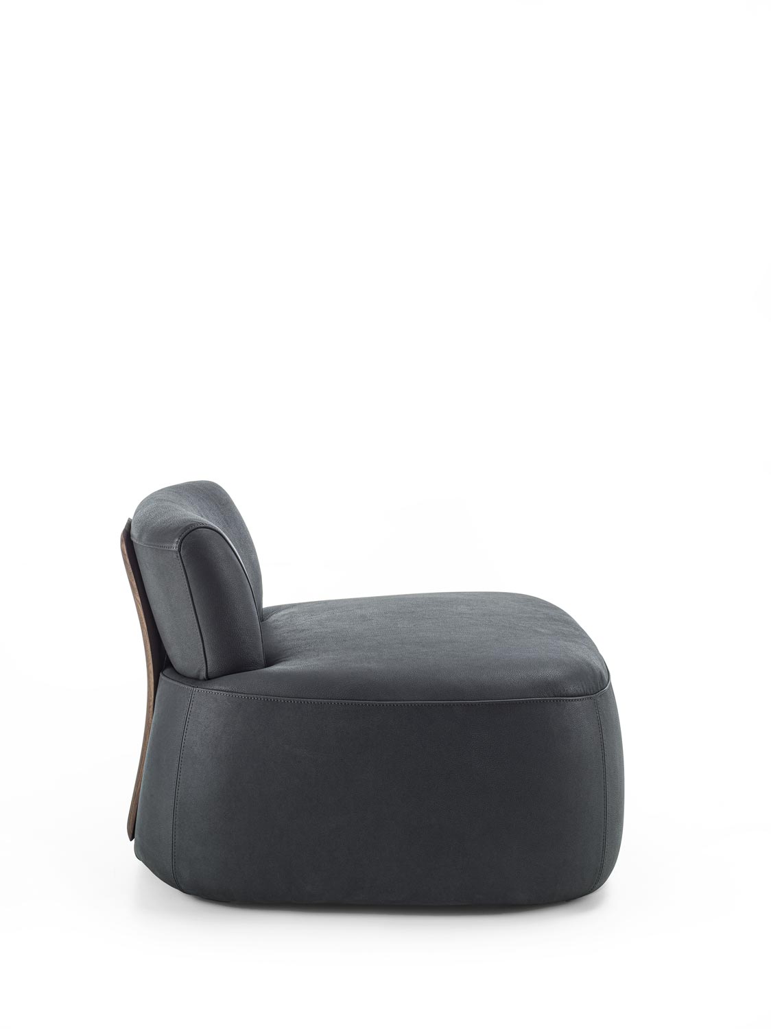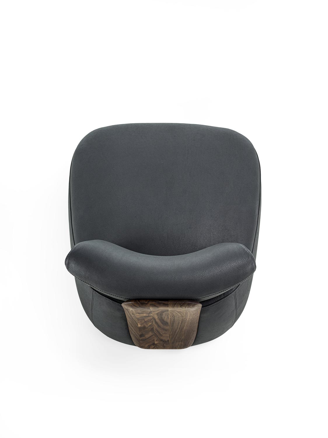 Poltrona imbottita con rivestimento in tessuto o pelle, caratterizzata da un distintivo schienale in legno massello che funge sia da elemento strutturale che decorativo. La solida e sinuosa struttura in legno collega lo schienale alla seduta, creando un dialogo visivo e funzionale tra i due volumi imbottiti. Il design esplora il contrasto tra la morbidezza accogliente della seduta e dello schienale imbottiti e la forza materica del legno.