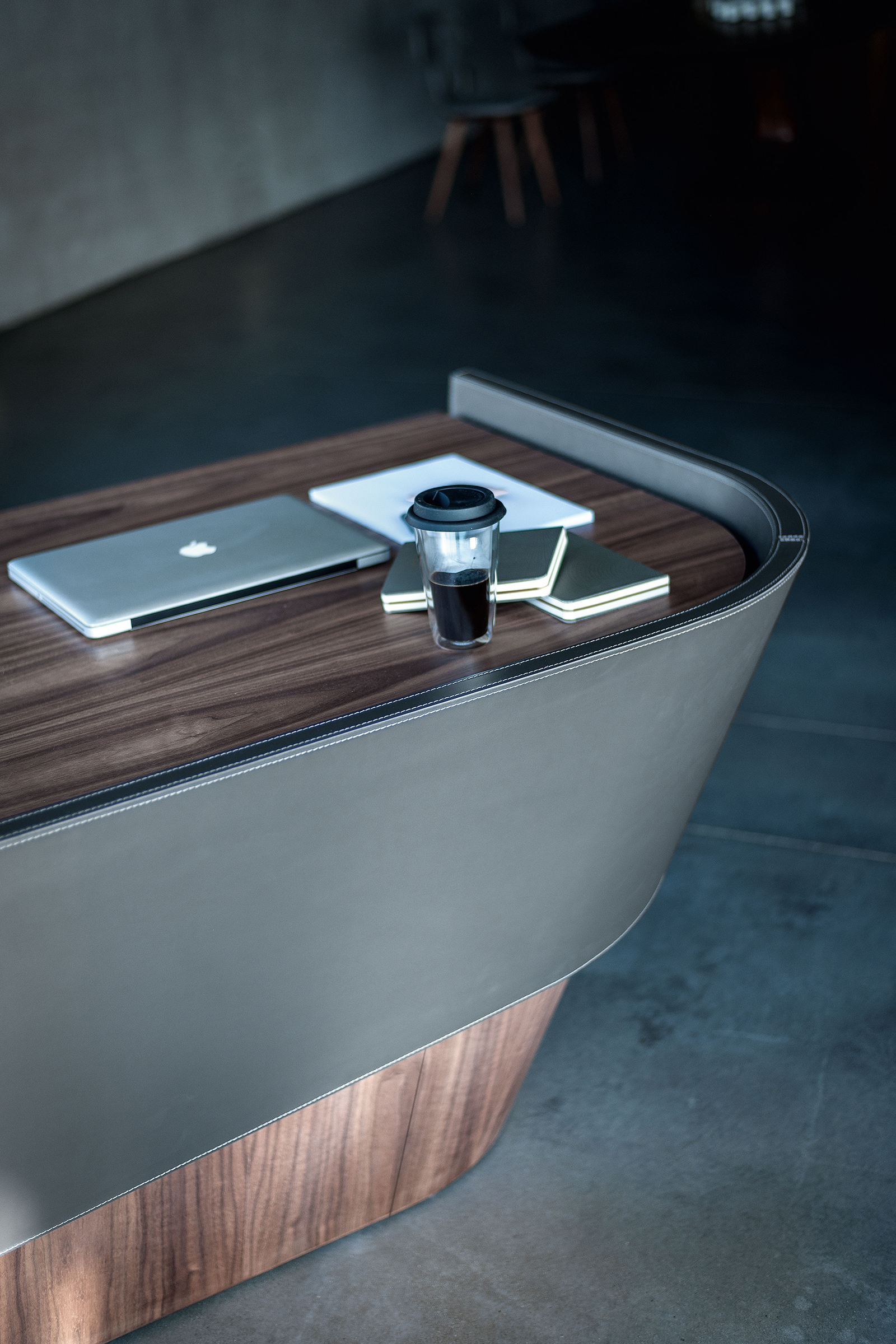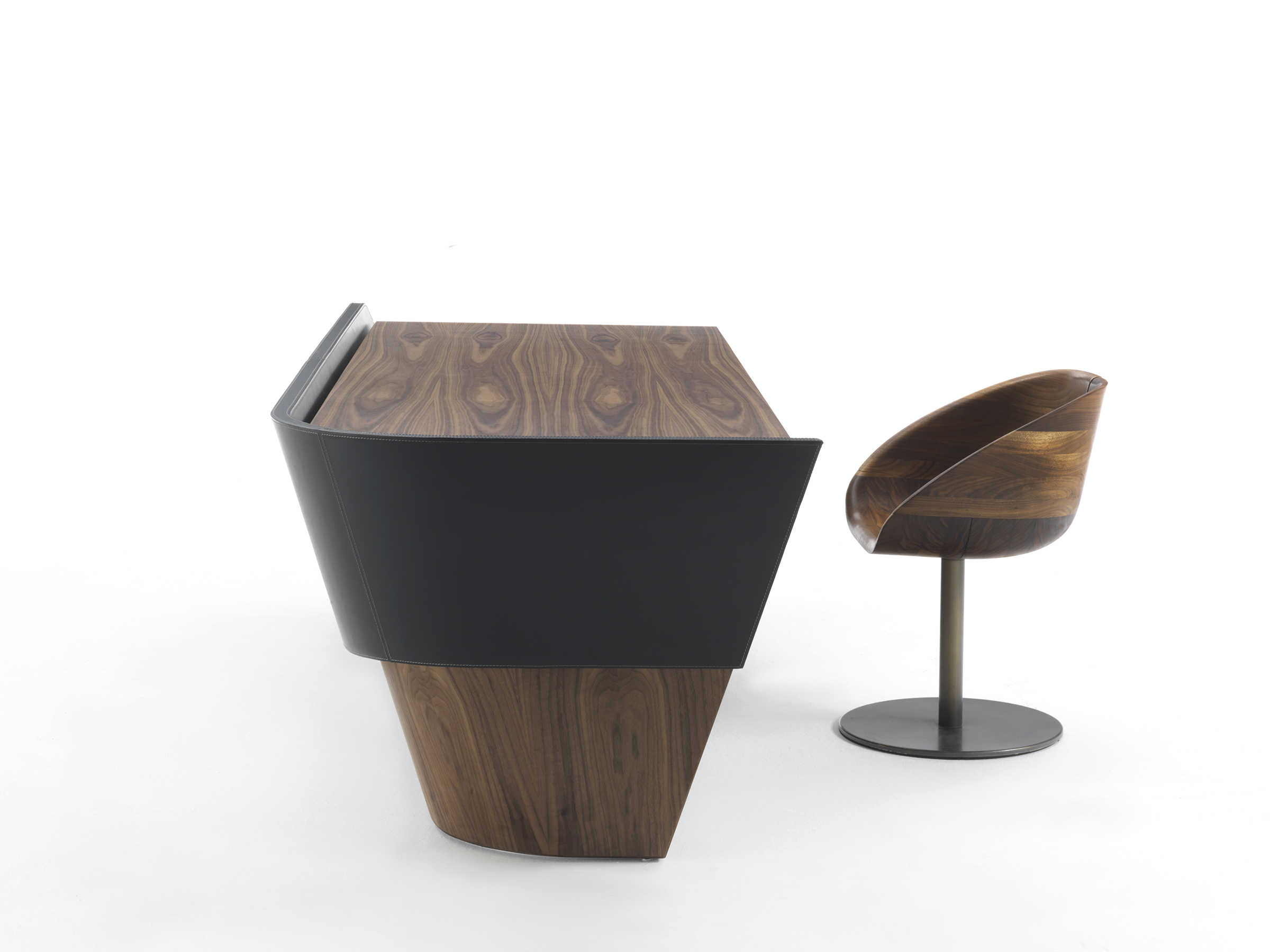 Scrivania in multistrato impiallacciato caratterizzata da linee morbide e sinuose, si compone di un piano d’appoggio e fascia frontale impiallacciata in legno oppure rivestita in cuoio. Dotata di pratica cassettiera composta da tre cassetti assemblati con incastri a coda di rondine e scanso laterale per apertura.