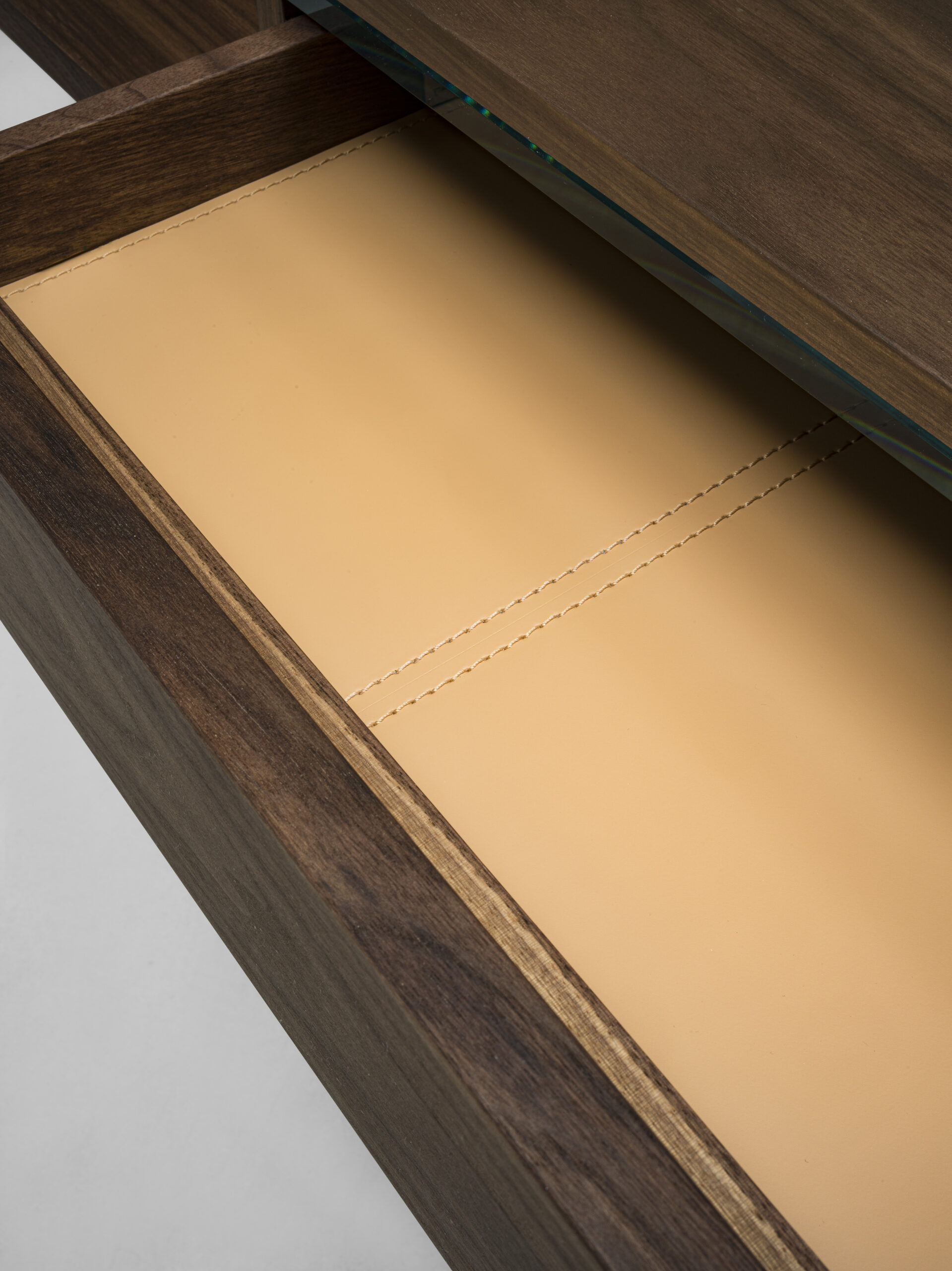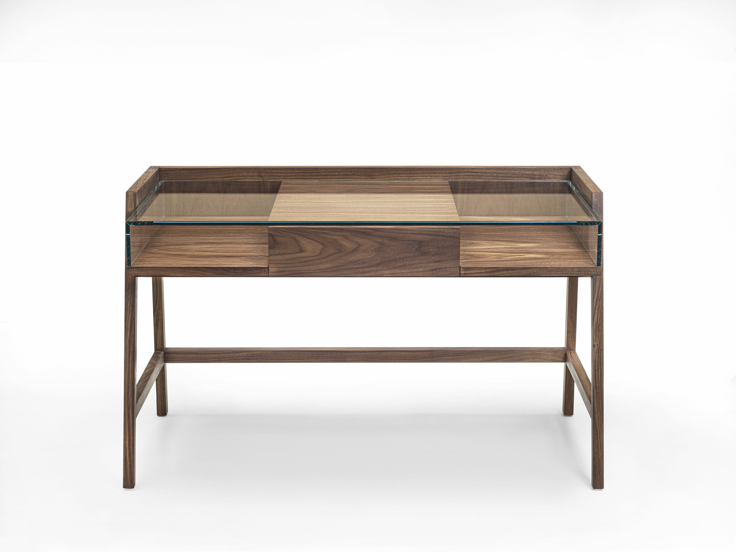 Scrittoio dalle linee squadrate, con struttura realizzata in legno listellare e massello e piano di lavoro in vetro. Dotato di cassetto centrale assemblato con incastri a coda di rondine.