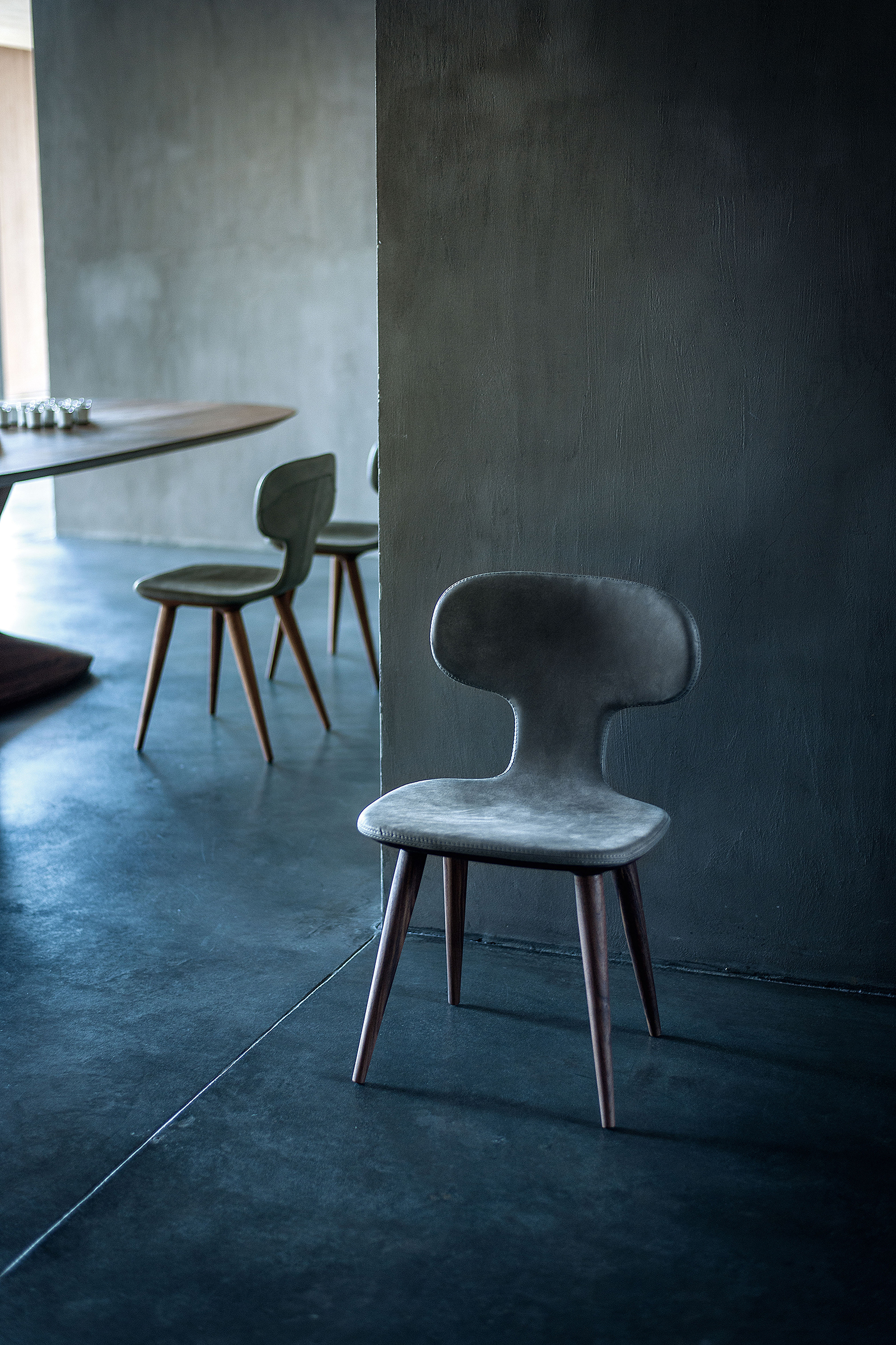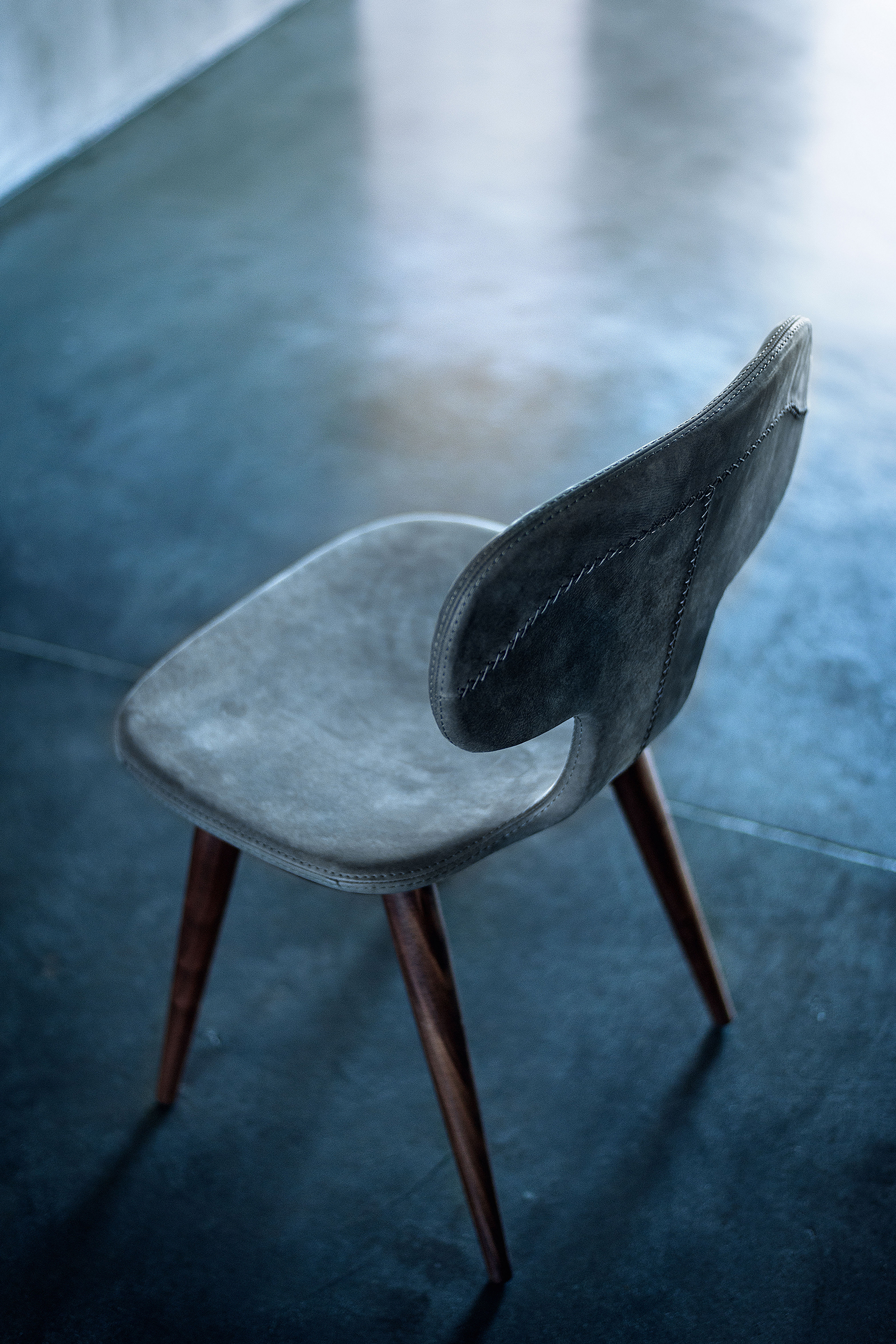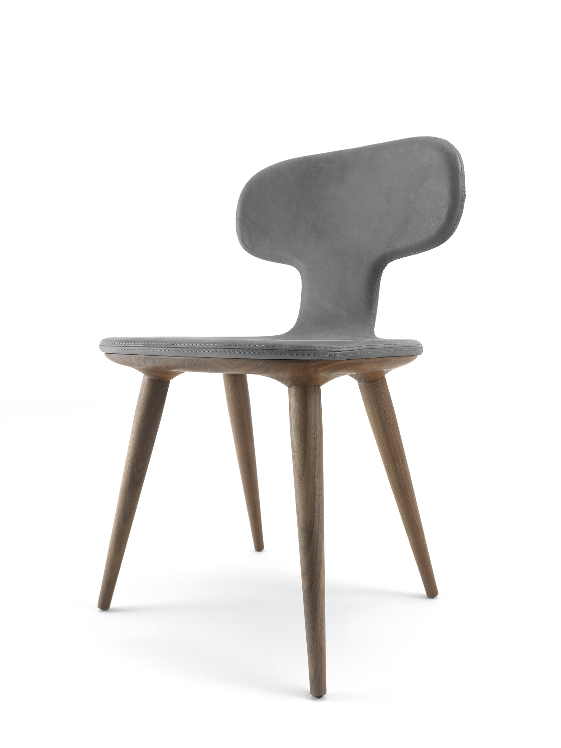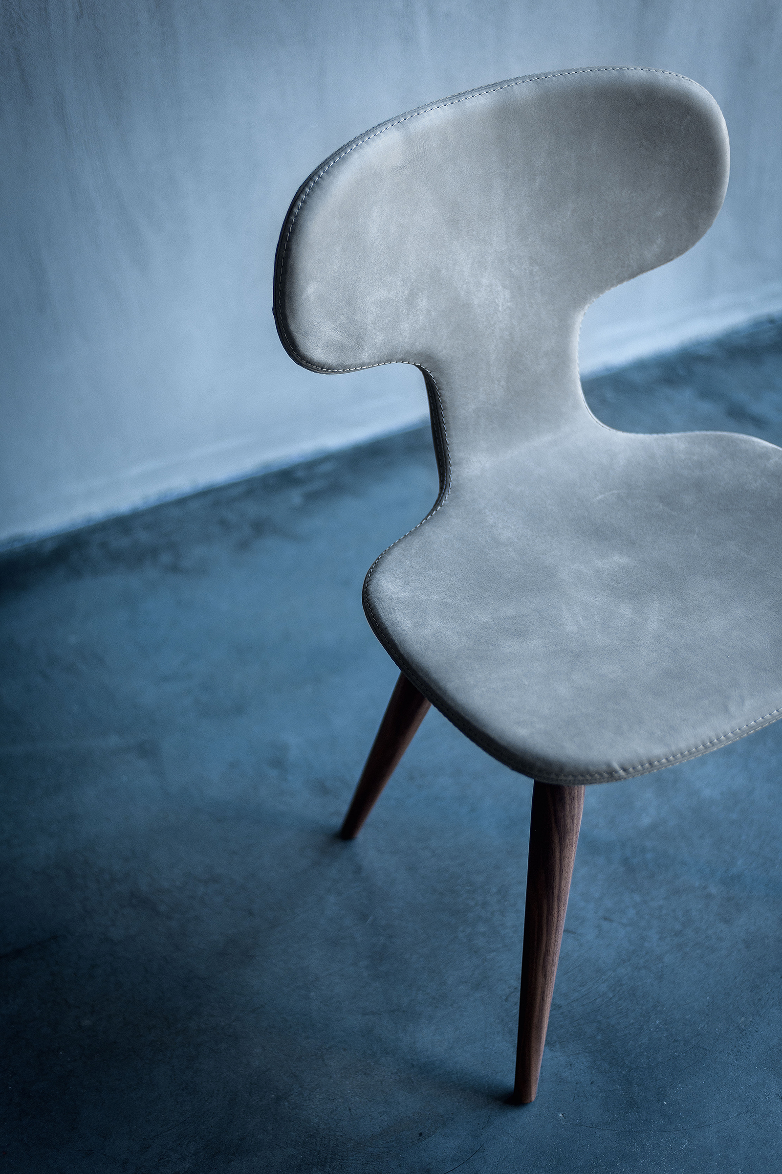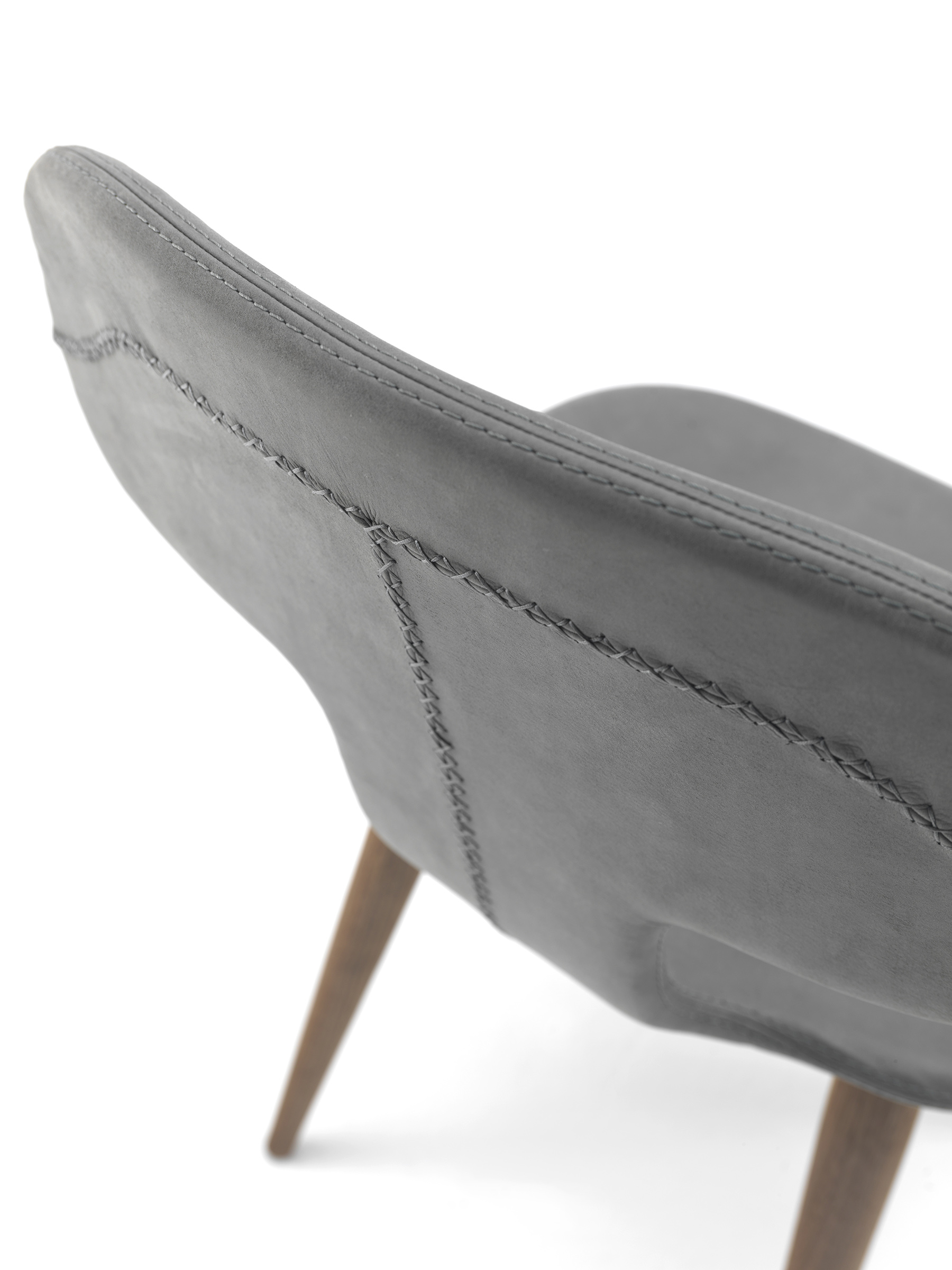 Sedia imbottita e rivestita in pelle o tessuto con cuciture a vista. Dalle forme sinuose ed avvolgenti è dotata di struttura sagomata in legno massello.