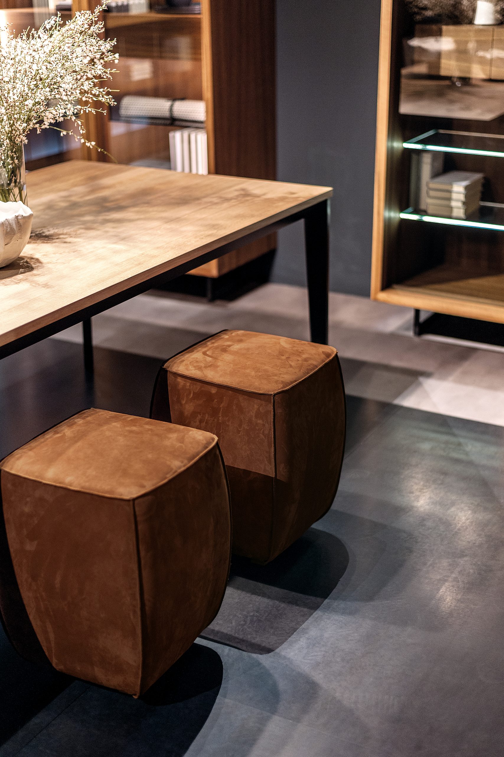Sgabello con imbottitura morbida e rivestimento in pelle o tessuto, lavorato e cucito a mano, caratterizzato da doppie cuciture angolari disponibili in due versioni.