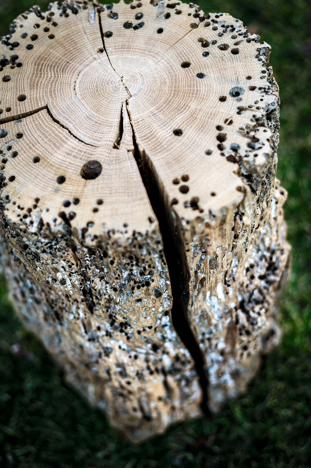 Sgabello in legno massello di Briccola, ricavato da una sezione di tronco levigata sulle due estremità.
