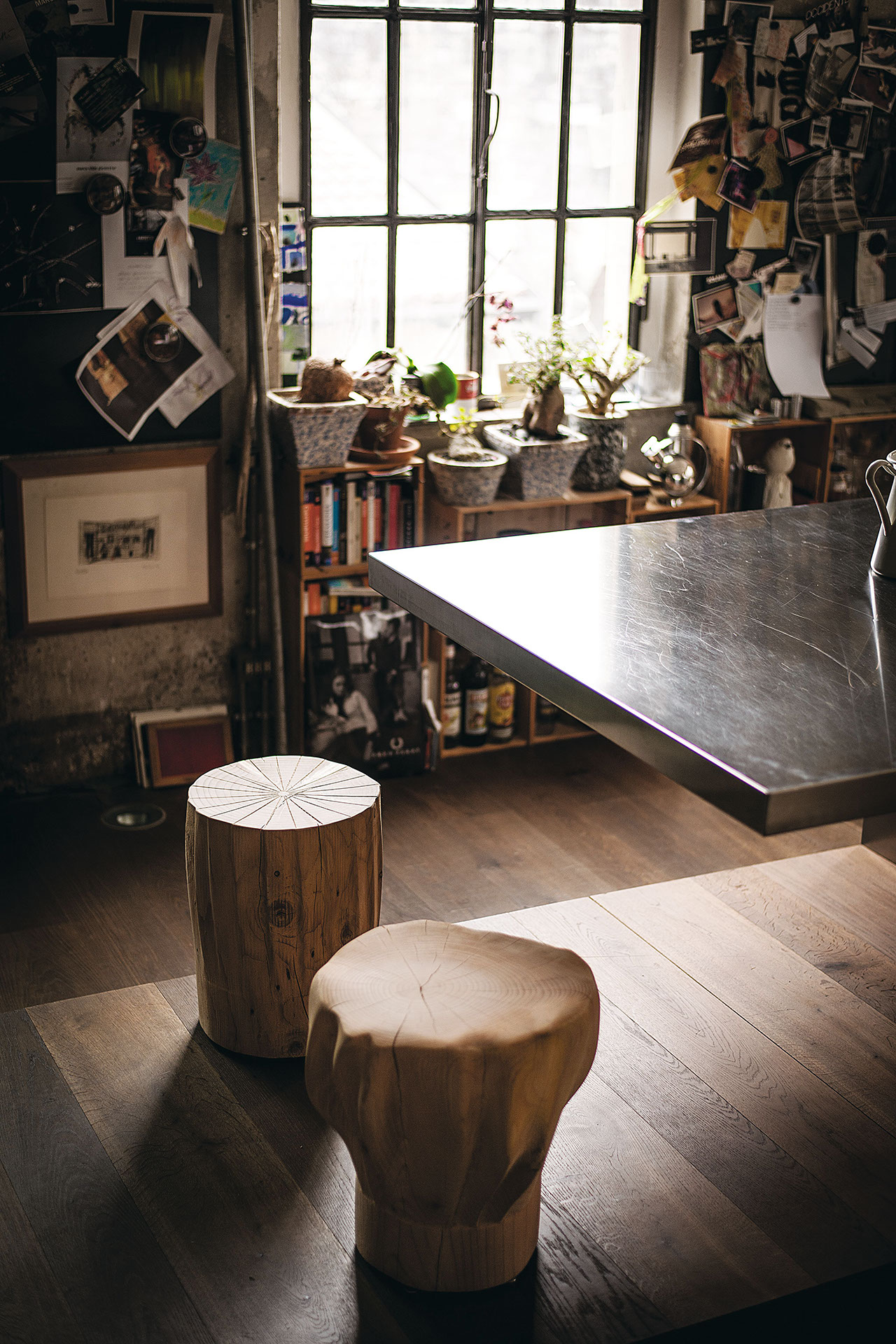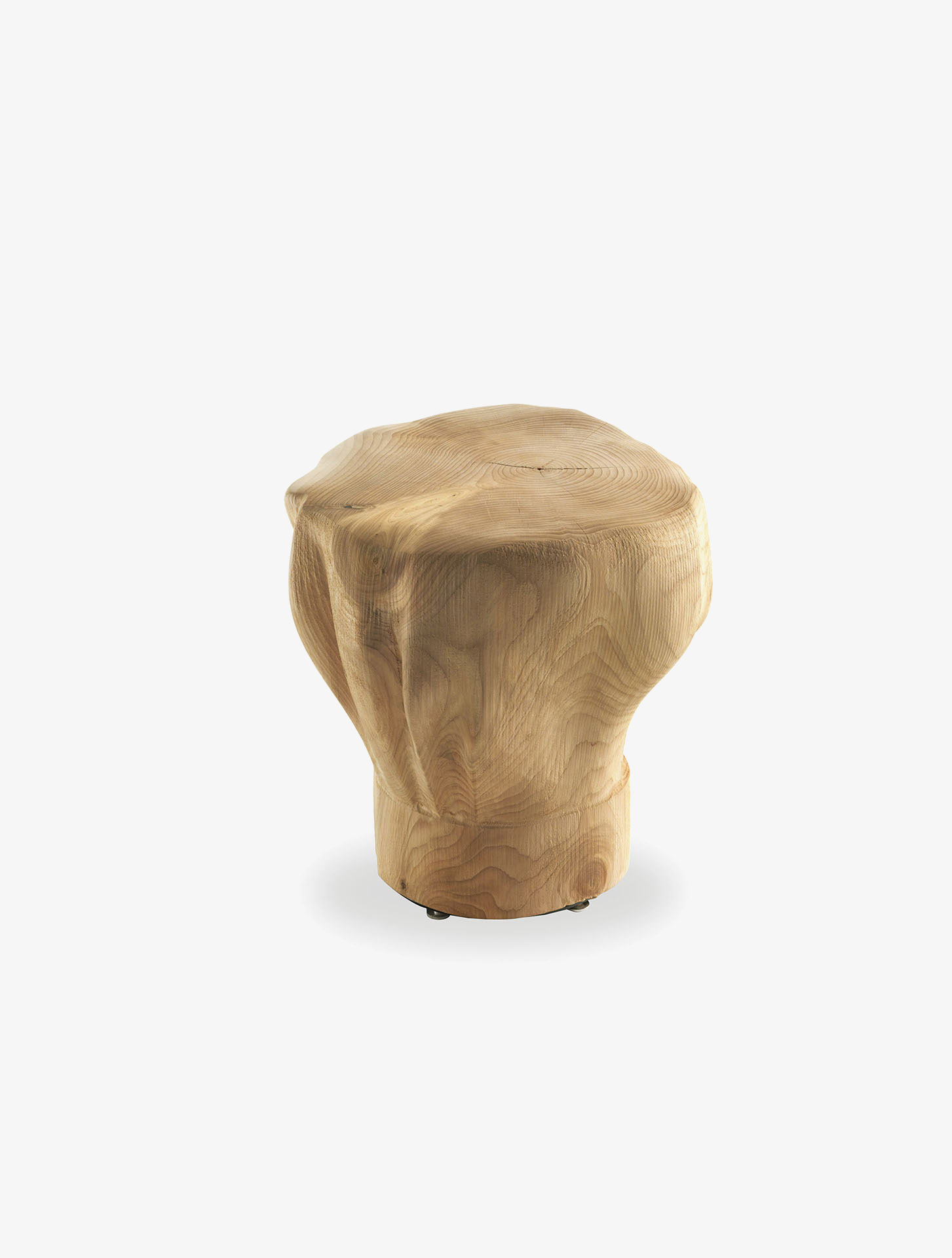 Sgabelli in legno massello di cedro profumato lavorati da blocchi unici, riproduzioni di cappelli da chef “fuori scala”.