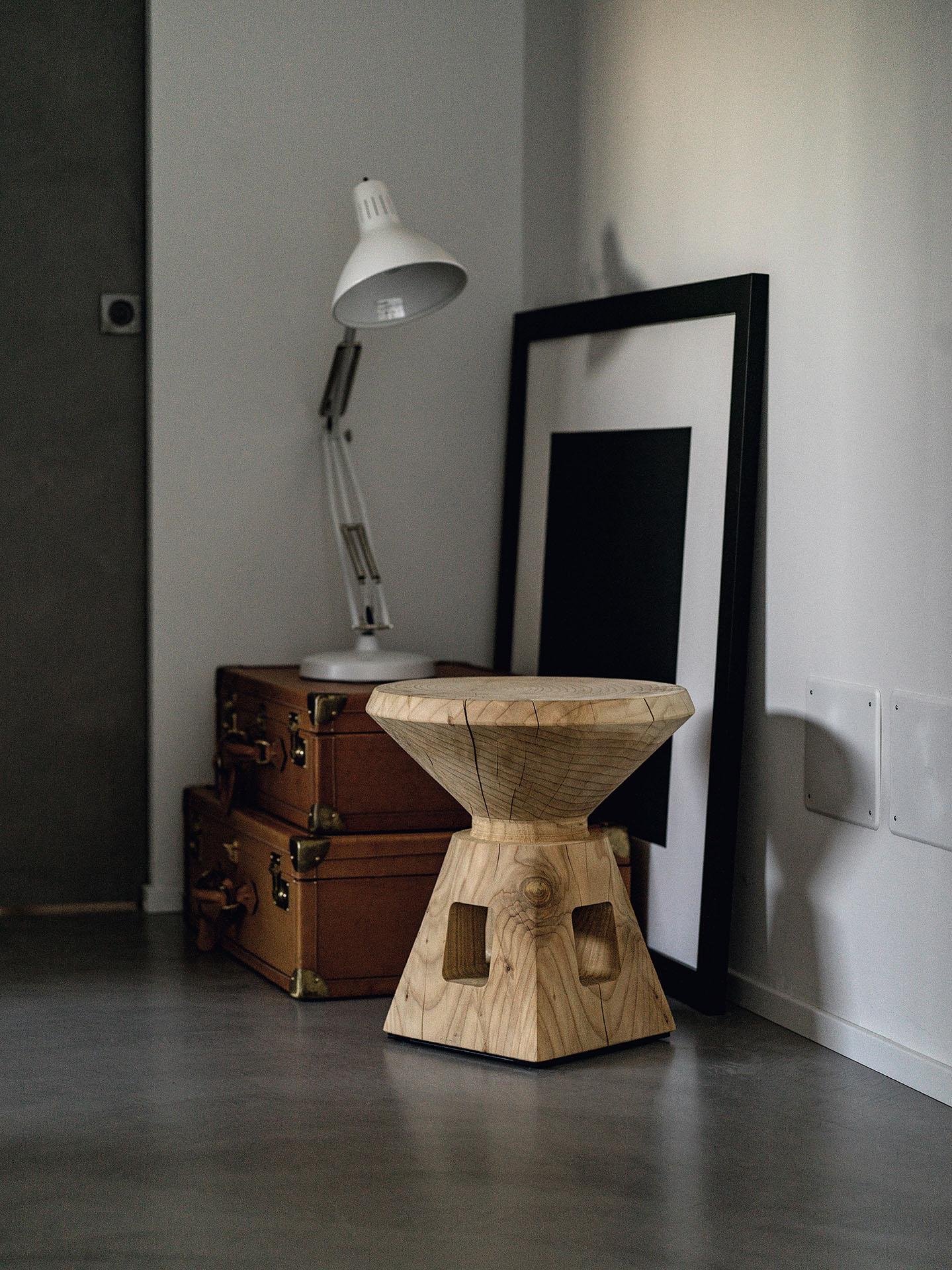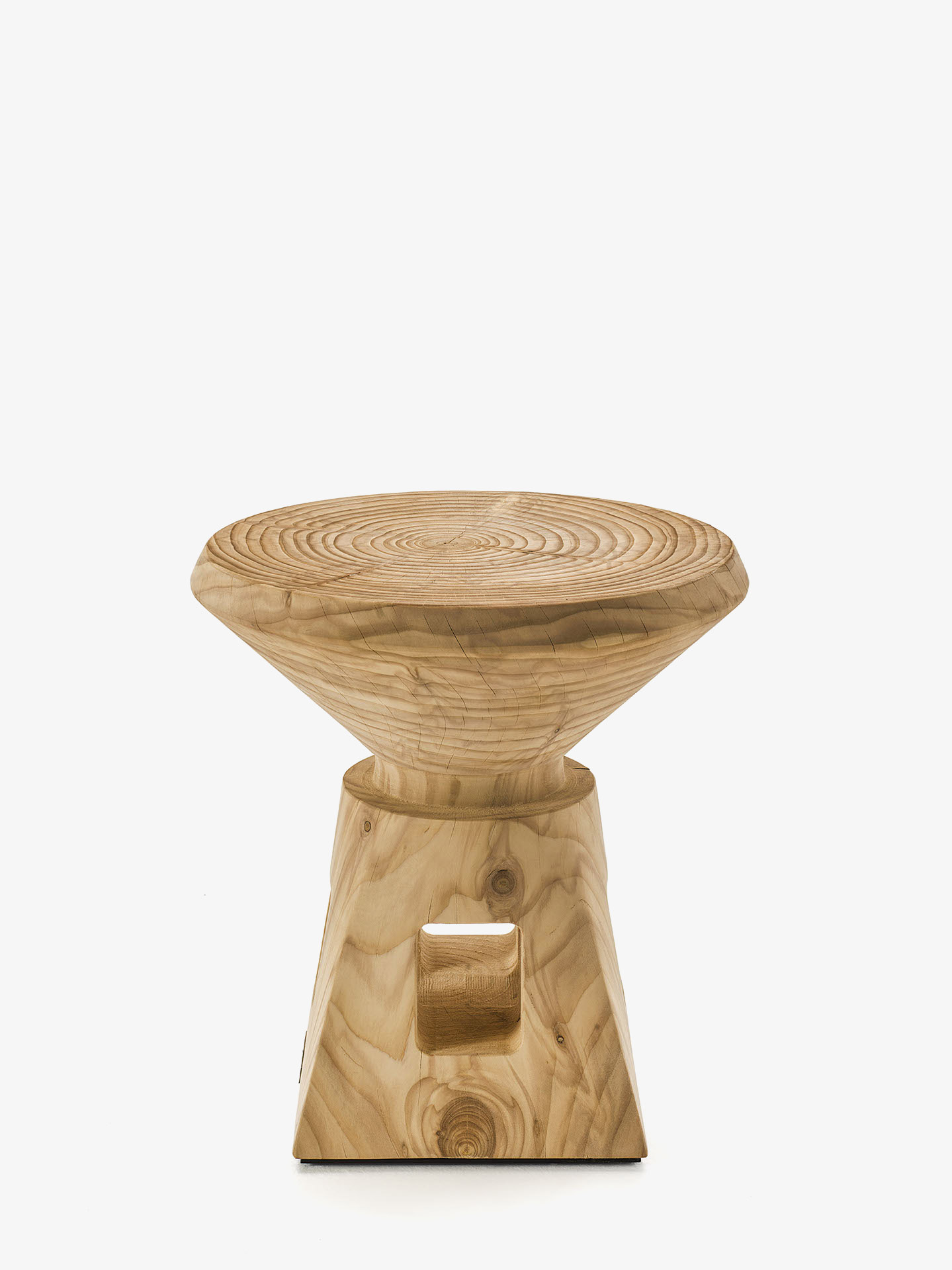 Sgabello in legno massello di cedro profumato lavorato da un blocco unico, ispirato alle caratteristiche forme dei vasi etruschi.