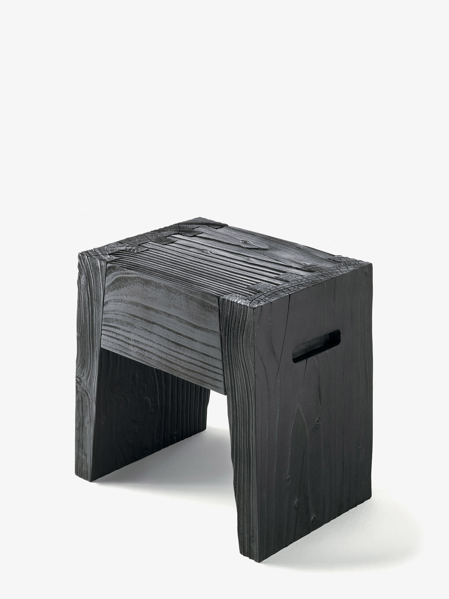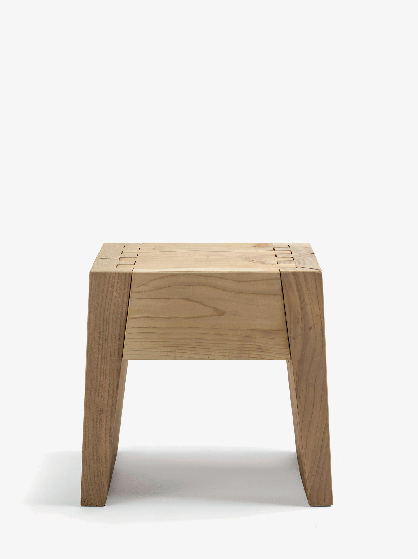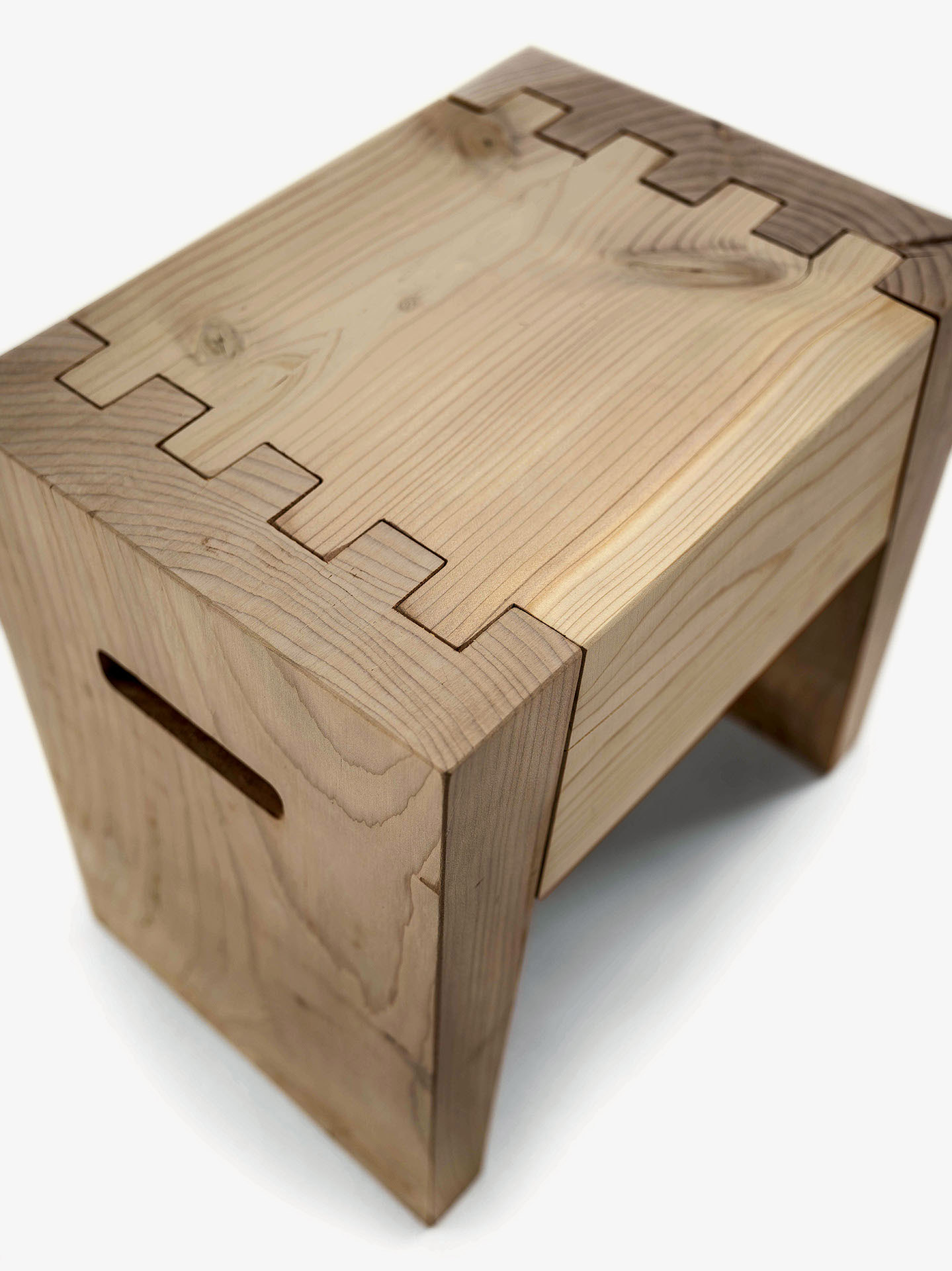 Sgabello in legno massello di cedro profumato caratterizzato da prese laterali e giunti a coda di rondine.