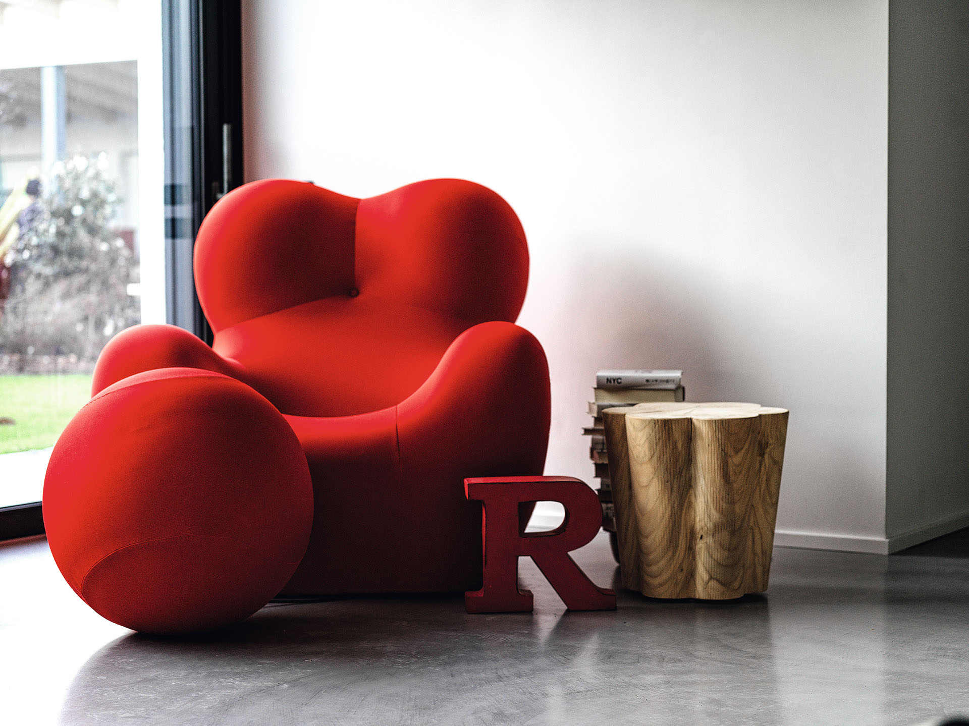Sgabello in legno massello di cedro profumato lavorato da un blocco unico, ricorda la corolla di un fiore.