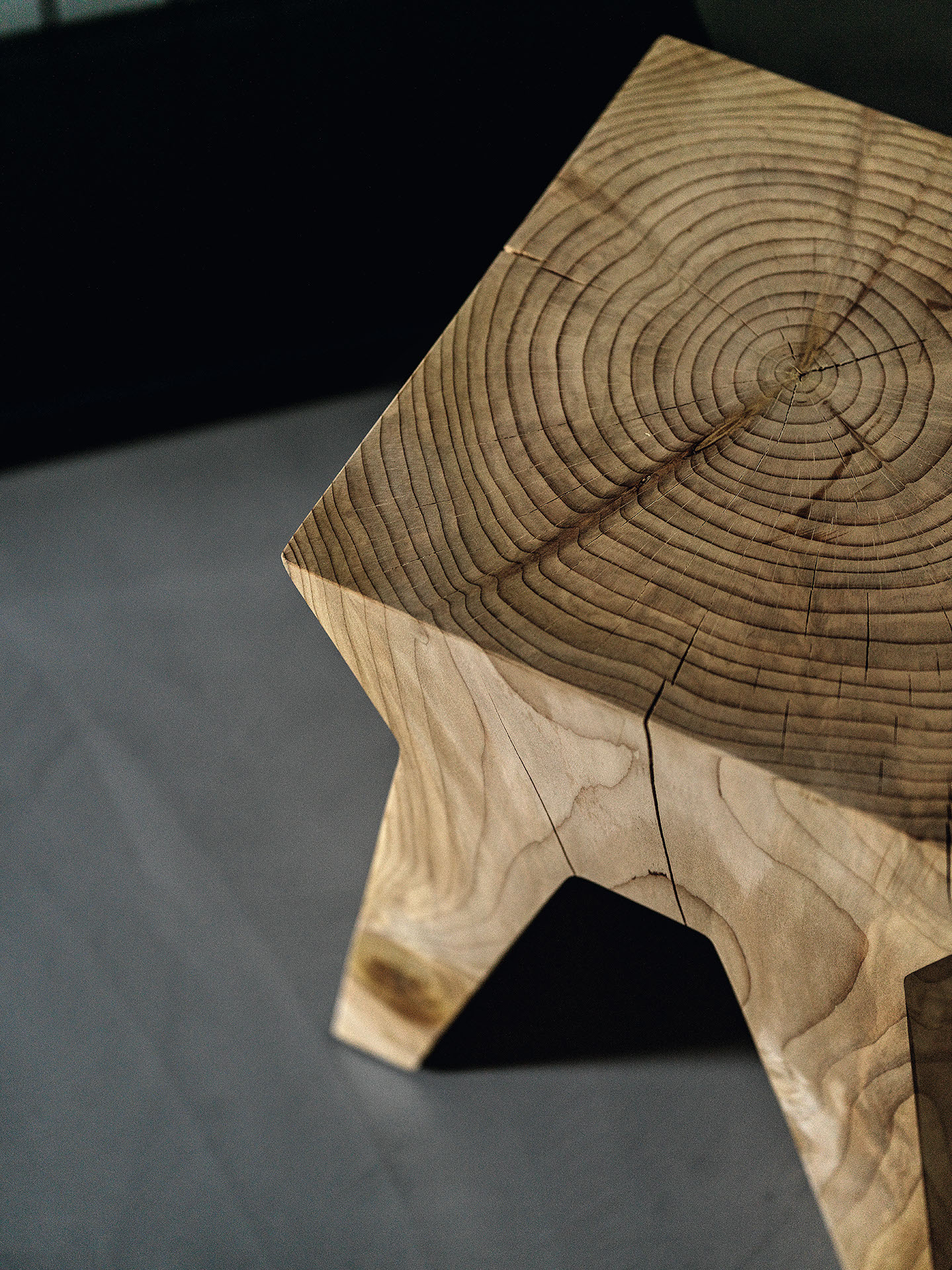 Sgabello in legno massello di cedro profumato lavorato da un blocco unico, caratterizzato da una forma geometrica con fresate laterali per facilitarne la presa.