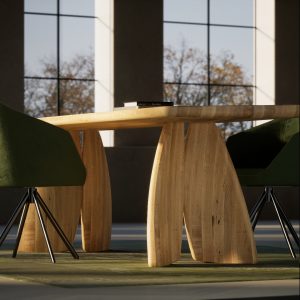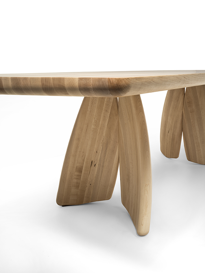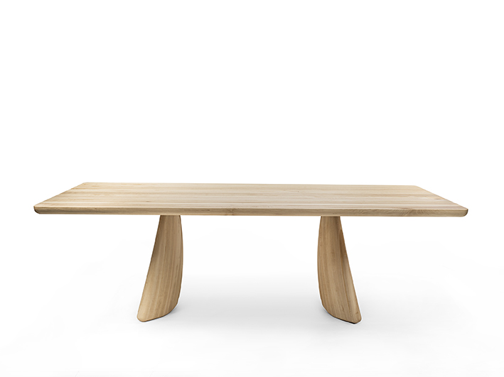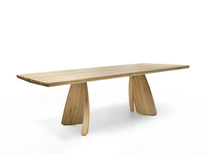 Tavolo interamente realizzato in legno massello, con top a liste incollate e lati stondati. La forma del basamento nasce da un gioco di curve e simmetrie che ne donano leggerezza.
