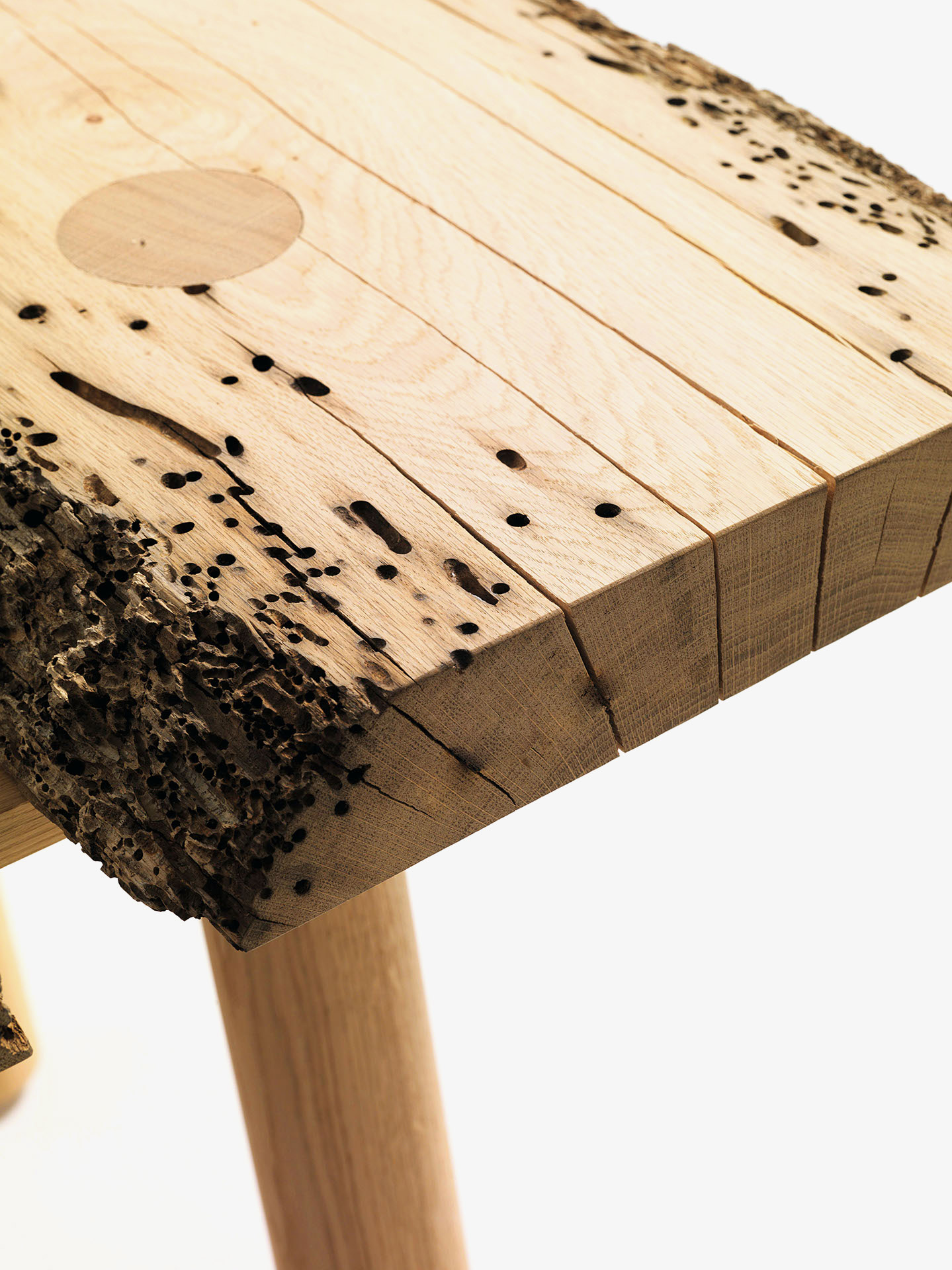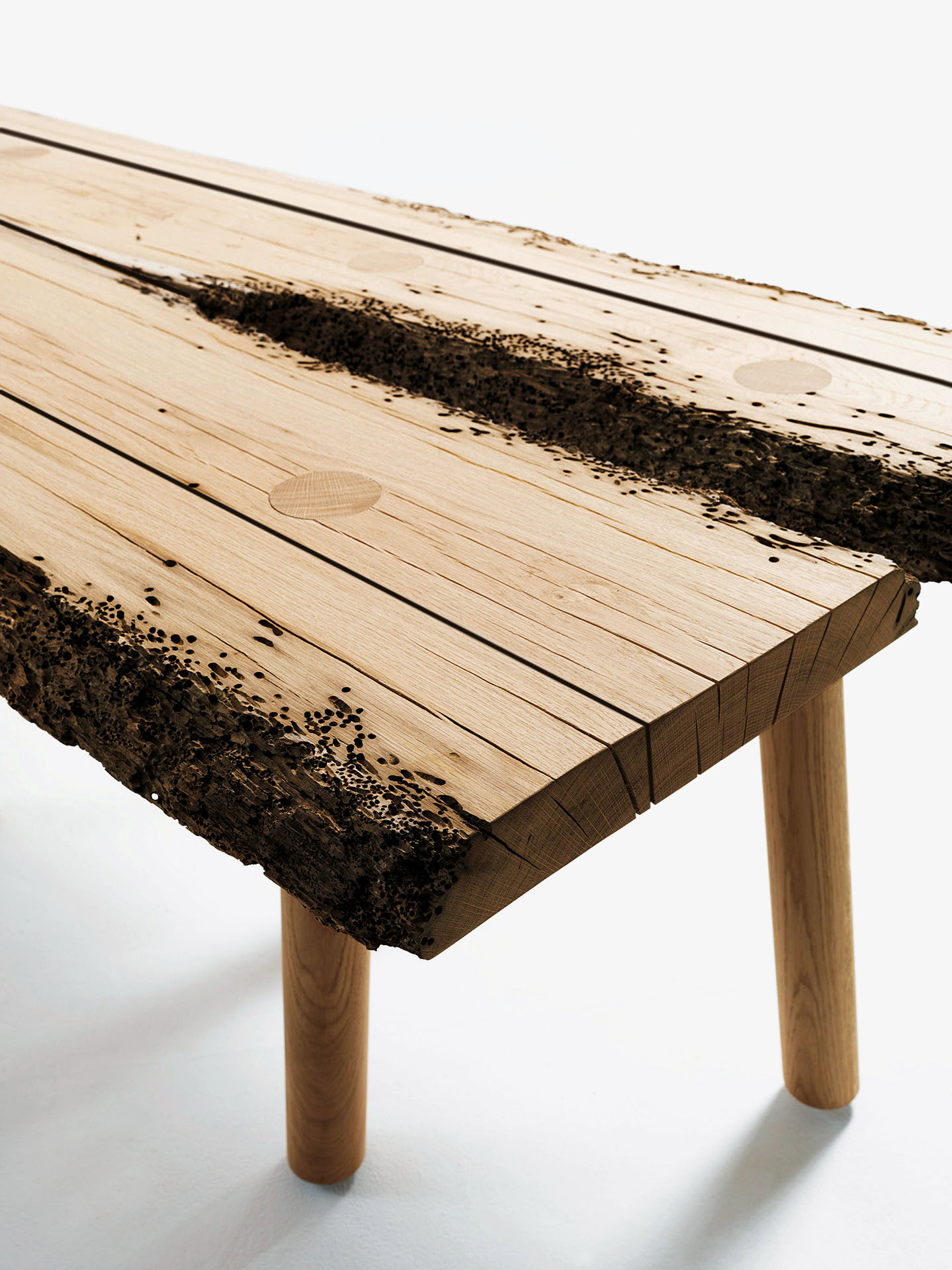Tavolo con top realizzato in legno massello di Briccola, a liste accostate e bordi naturali. Base composta da gambe tornite a sezione circolare passanti sul top con diverse inclinazioni. Il numero delle tavole del top dipende dalla larghezza di ogni singola tavola e dalle dimensioni del top richiesto. La posizione delle gambe è suscettibile di cambiamenti di posizione a seconda delle caratteristiche delle singole tavole e del top.