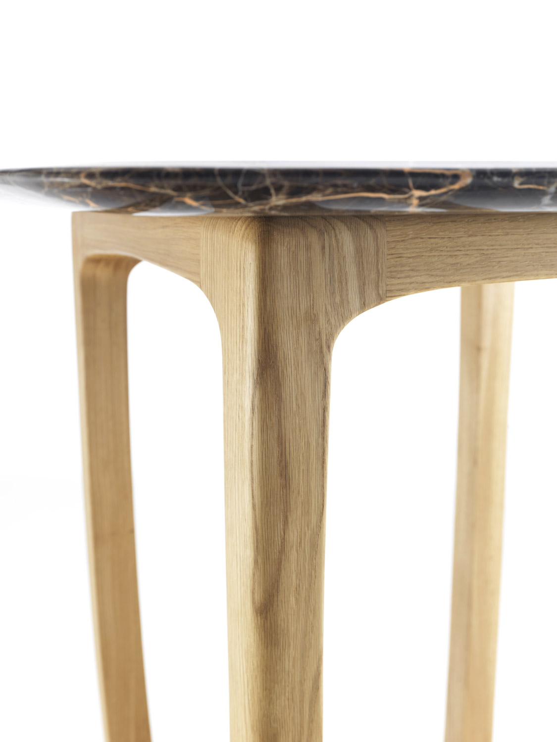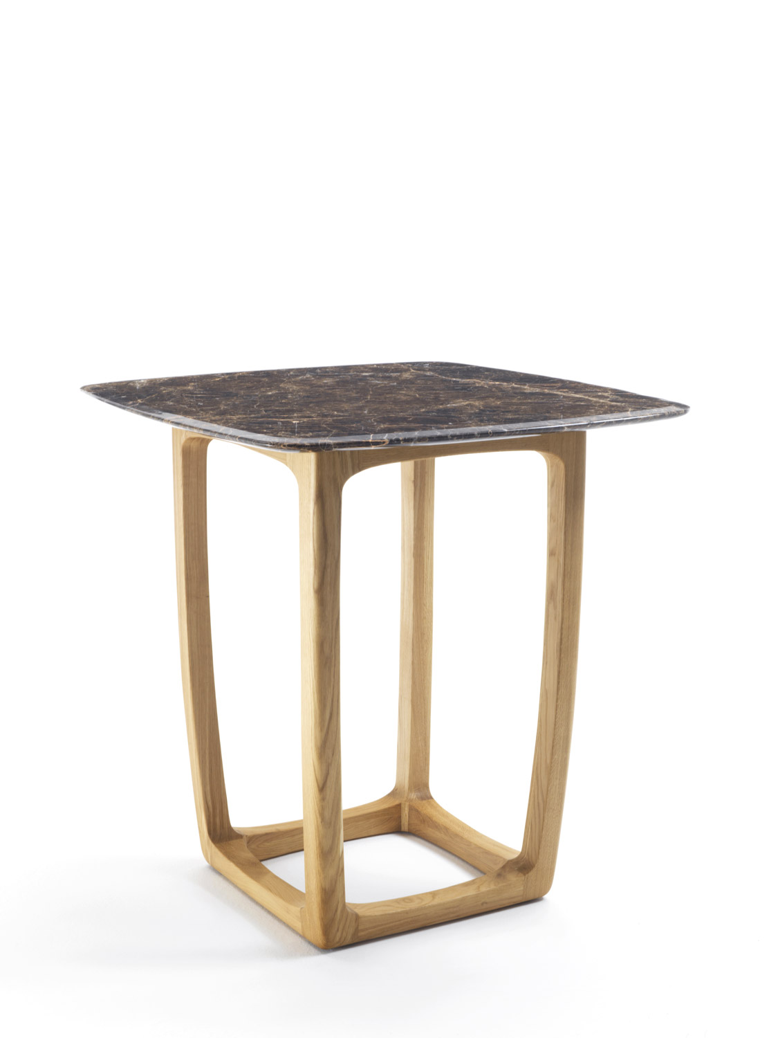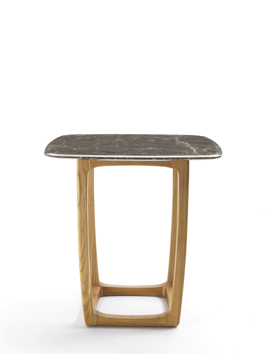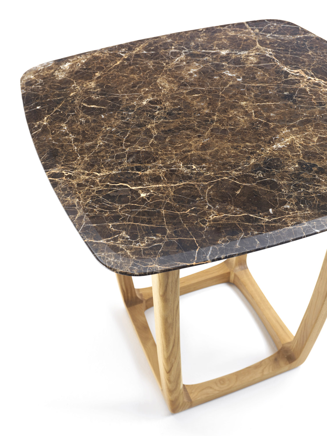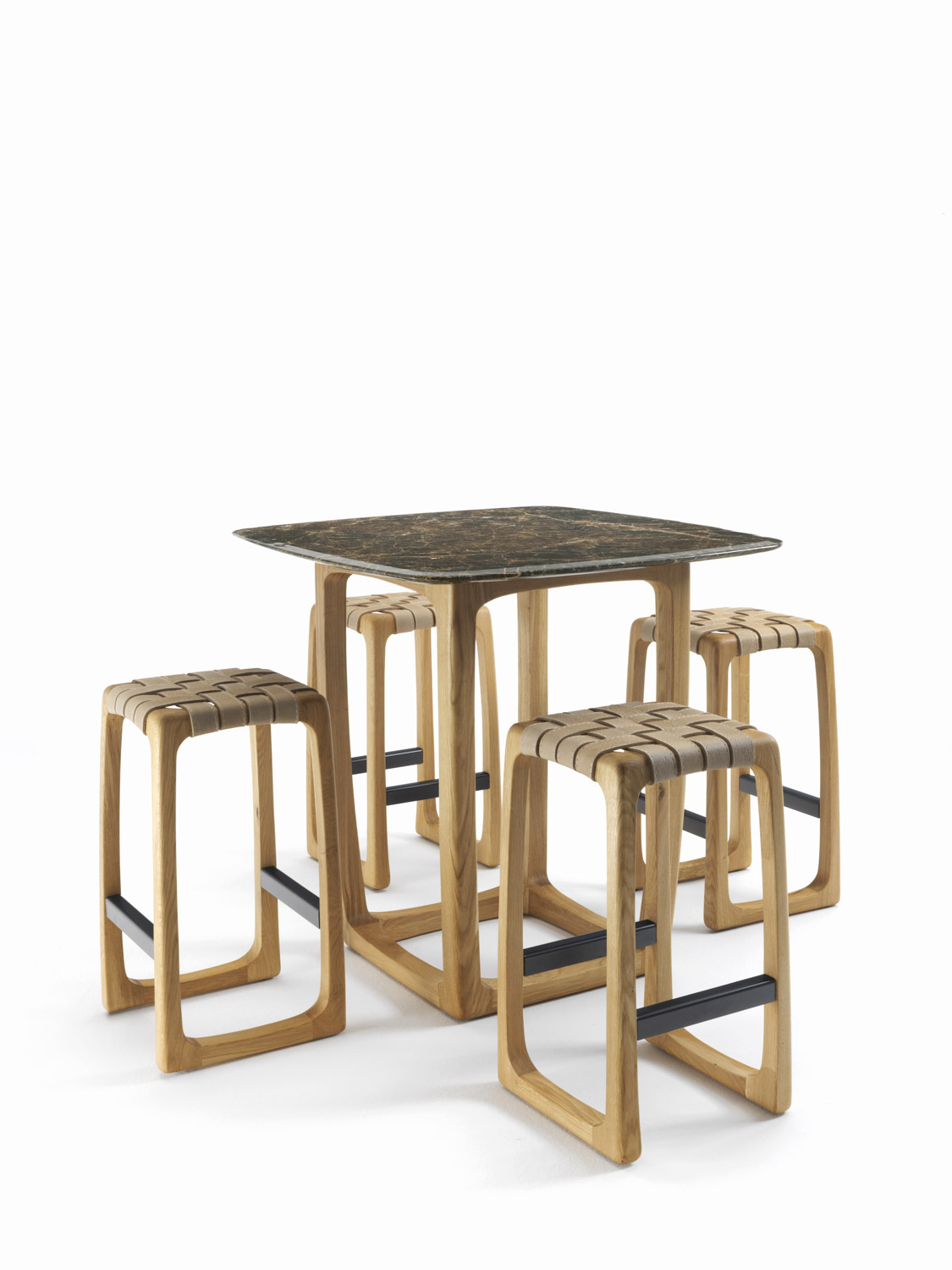 Tavolo da bar composto da struttura in legno massello completamente tornita, assemblata e levigata a mano, con base d’appoggio squadrata abbinata ad un top in marmo con lati smussati e sporgenti.